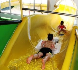 Få minutter senere suser Otto og Sonja – og deres far – ned ad vandrutsjebanen. Mine unger er tæt på at gå i fast kredsløb på den 50 meter lange sliske, men Sonja når dog også at tage sine første svømmetag uden hverken korkbælte, badering eller svømmevinger i det 80 centimeter dybe bassin.