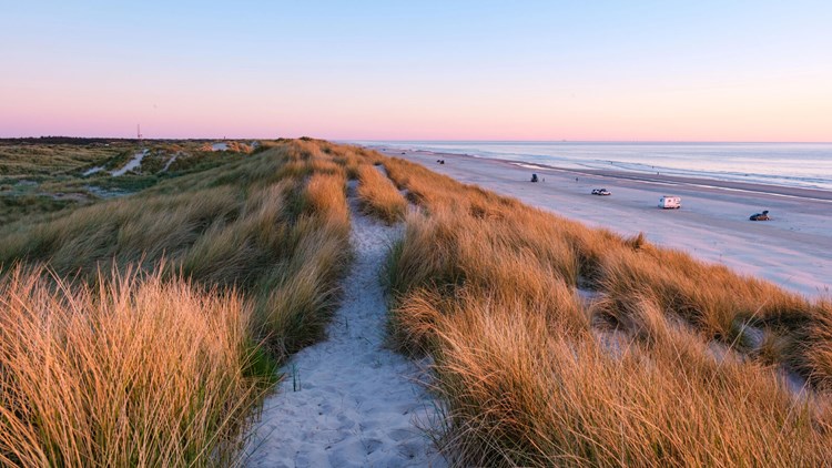 Stranden består af det fineste, hvide sand man kan ønske sig. Der er mulighed for at tage bilen med til den sydlige del af stranden, men ikke til den nordlige. Glæd jer til at nyde livet på den børnevenlige strand på en dejlig varm sommerdag, hvor solen skinner fra en blå himmel. Det er simpelthen afslapning på første klasse.