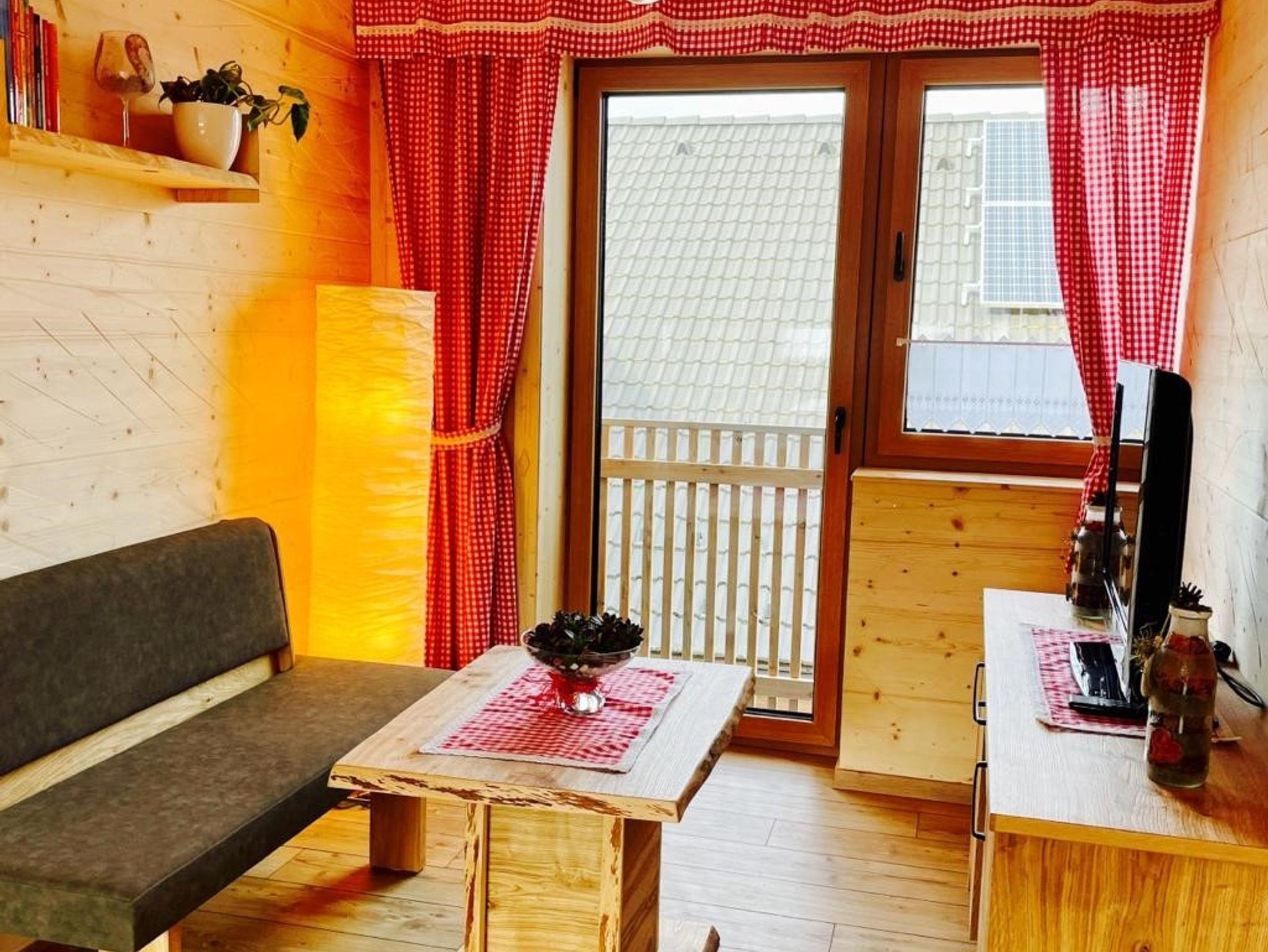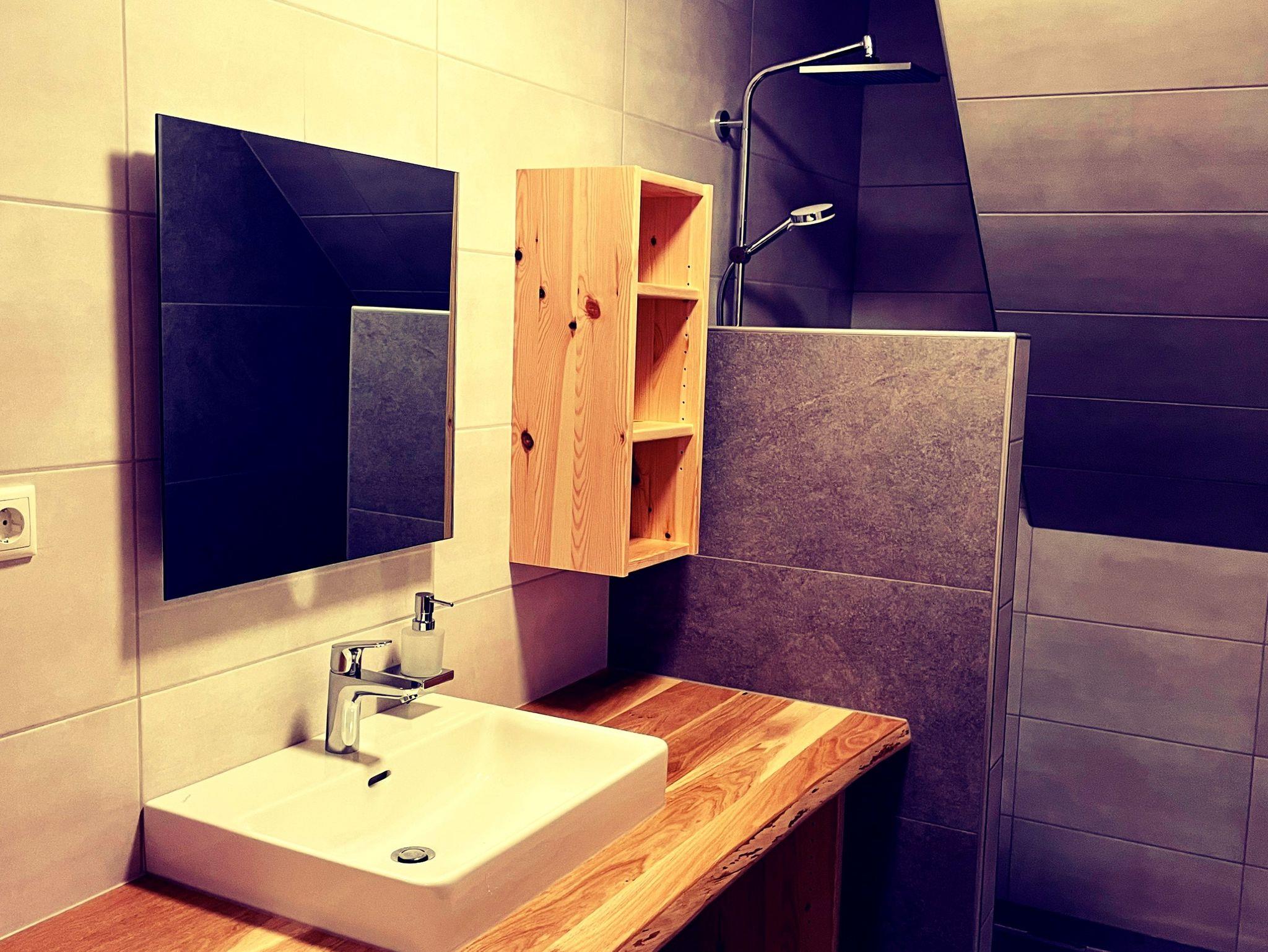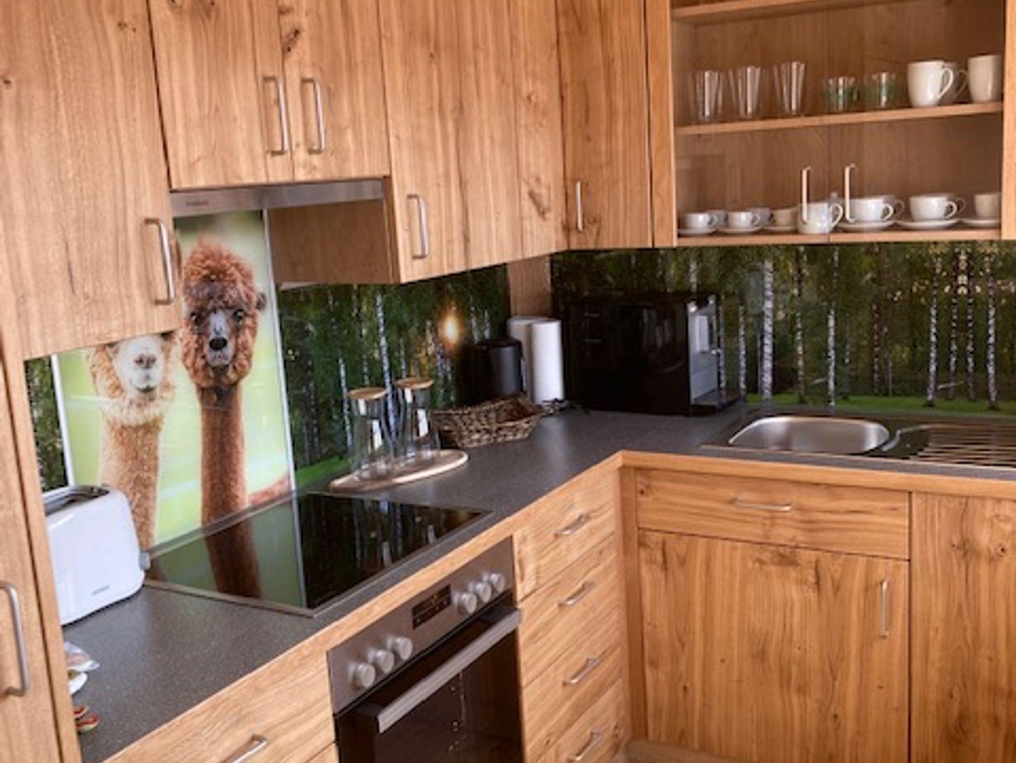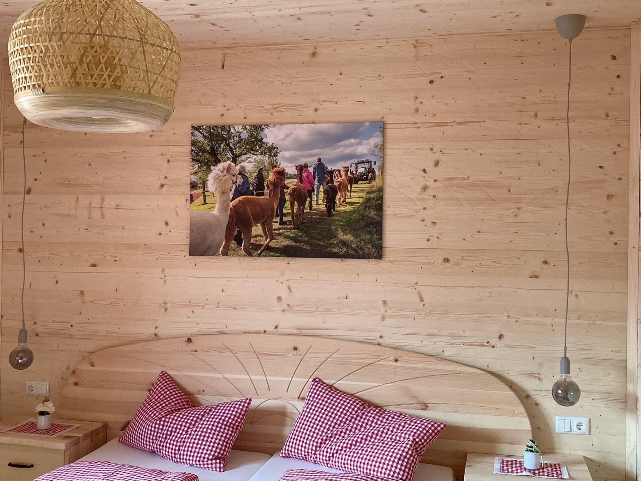 Gemütlich eingerichtete Ferienwohnung im Obergeschoss, aus heimischen Hölzern, mit Wachhund Charly und 40 Alpakas. Die Wohnung hat ca. 65m², aufgeteilt in einen großen Wohn-Essbereich mit voll ausgestatteter Küche. Zwei getrennte Schlafzimmer, ausgestattet mit einem Doppelbett, einem französischen Bett und einem Einzelbett. Ein Badezimmer mit großer Dusche, Waschtisch und viel Ablagefläche. Eigenes WC. Vorraum mit Garderobe und viel Verstaufläche. Ideal für 2 Erwachsene und/oder 2 - 3 Kinder.