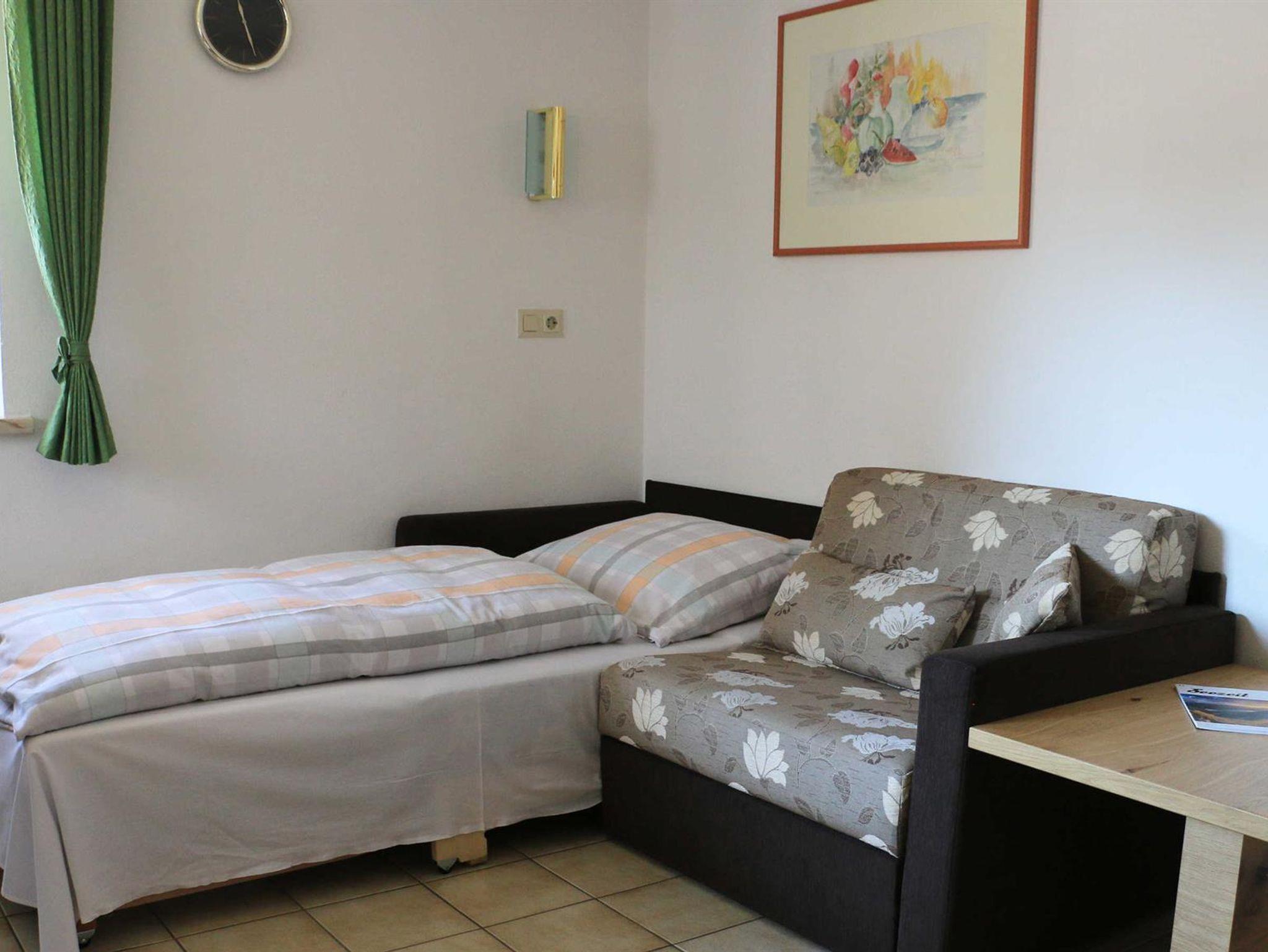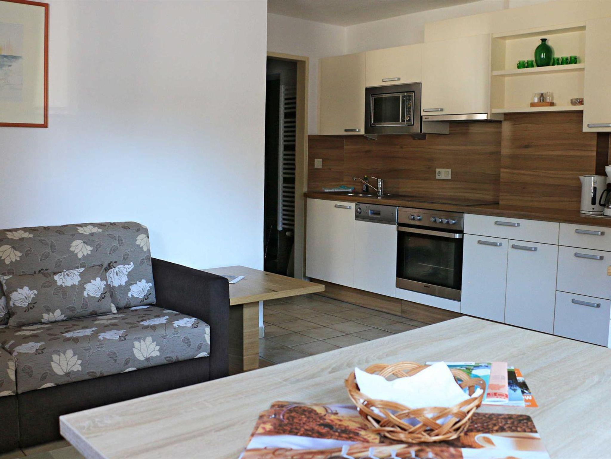 Die gemütliche Ferienwohnung besteht aus einem Schlafraum, Badezimmer, Wohnküche und kleinem Vorraum.