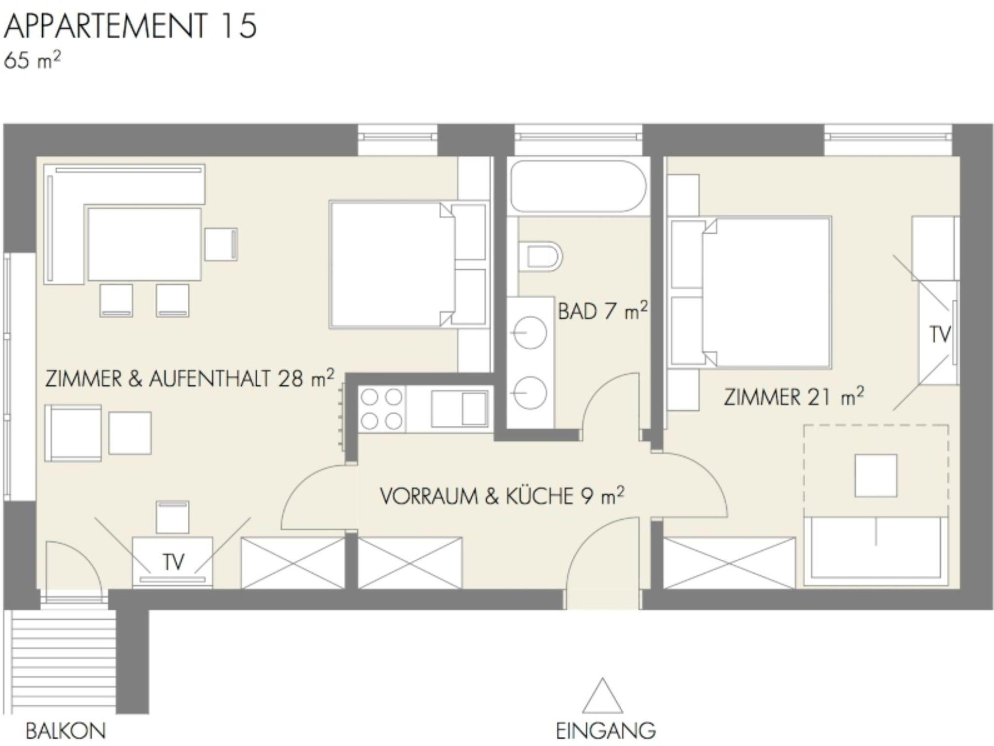 In moderner Wildeiche geölt - Optik ist dieses große 2-Zimmer-Apartment für Familien mit Kindern eine ideale Einheit.
