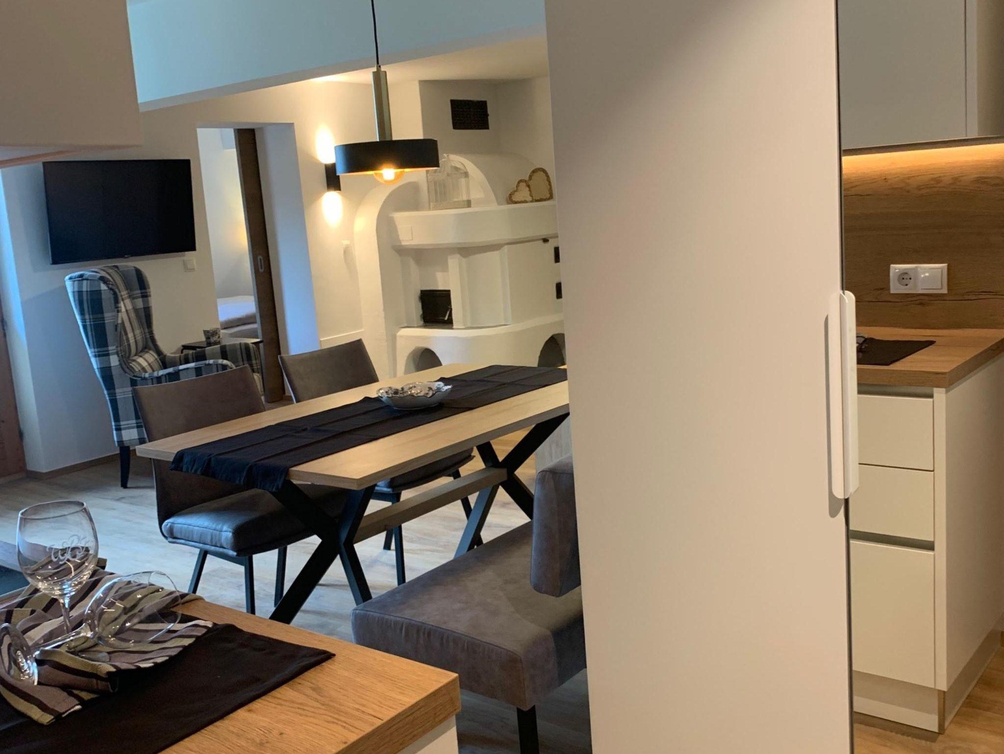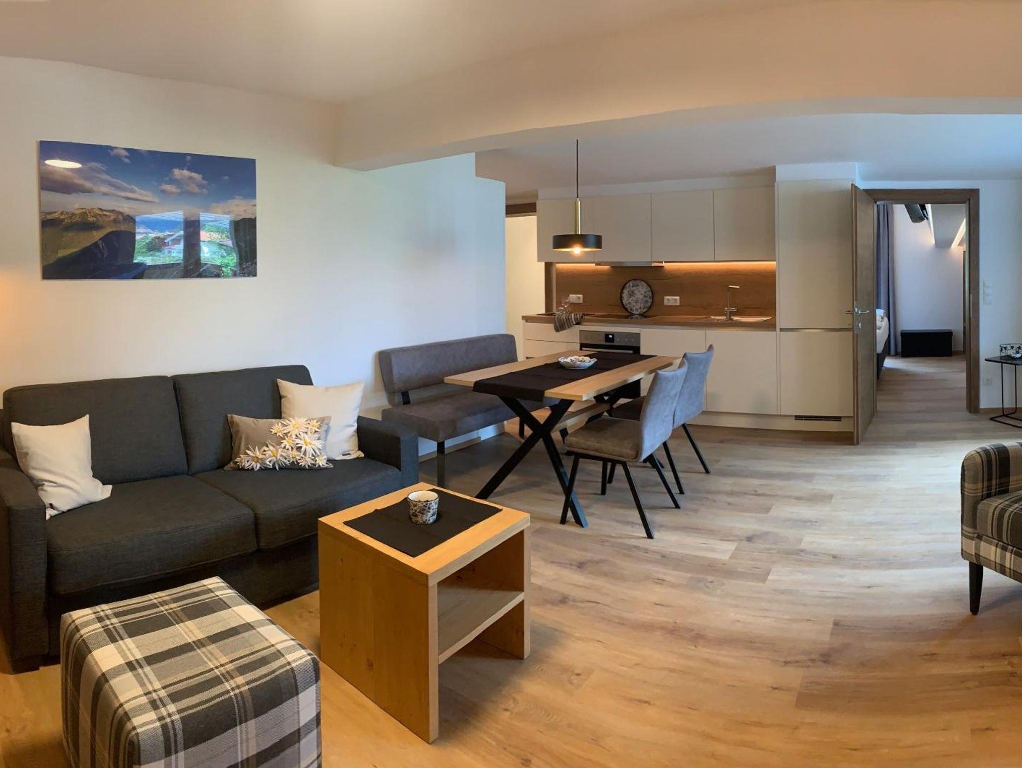 Diese großzügige Ferienwohnung mit unserer neuen ALPIN KOMFORT Ausstattung besteht aus 2 Schlafzimmern mit jeweils 1 Doppelbett, 1 Badezimmer mit Dusche und WC, 1 hochwertig ausgestattete Wohnküche mit Essplatz und 1 Wohnbereich mit gemütlicher Lounge mit 1 Ohrensessel, 1 Hocker und einer Ausziehcouch für 2 vollwertige Schlafmöglichkeiten. Holz für den Kachelofen stellen wir Ihnen gerne kostenlos zur Verfügung. Eine Terrasse mit Wendeltreppe in den Garten ist ein sehr beliebter Frühstücksplatz im Sommer
