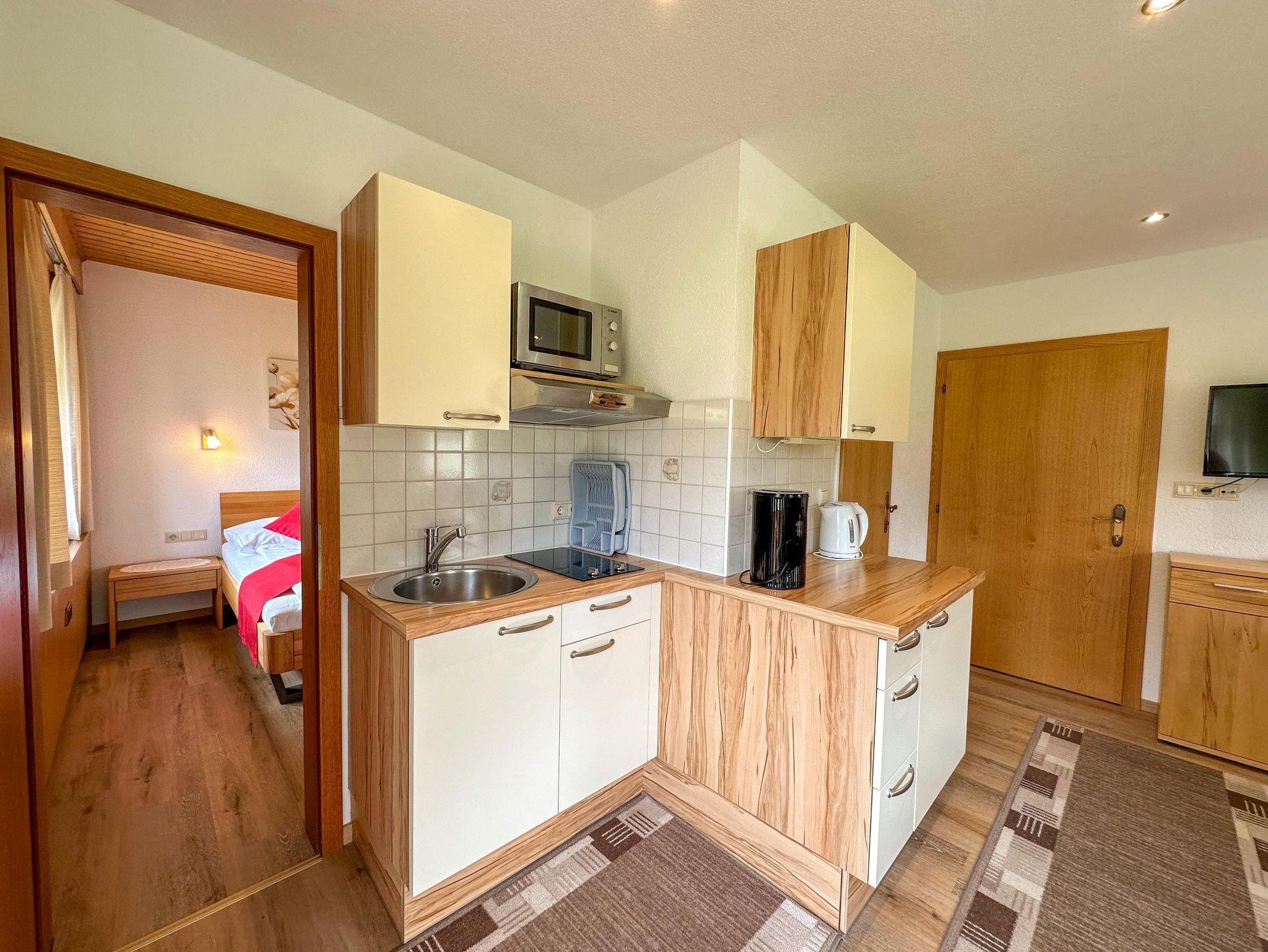 Die im Wohnraum integrierte Küchenzeile lässt mit Kühlschrank, Ceran-Kochfeld, Dunstabzug, Mikrowelle, Kaffeemaschine und Wasserkocher sowie natürlich kompletter Geschirr und Besteckausstattung kaum noch Wünsche offen.