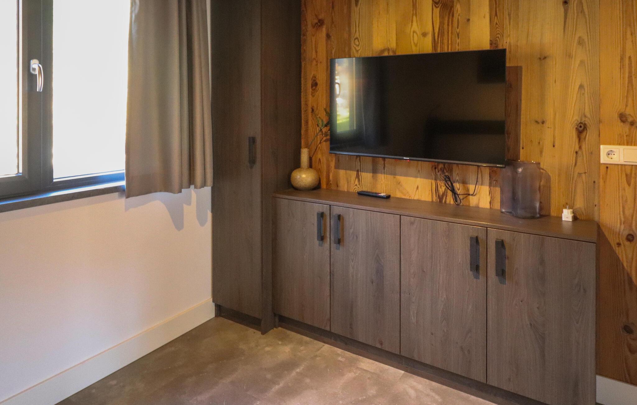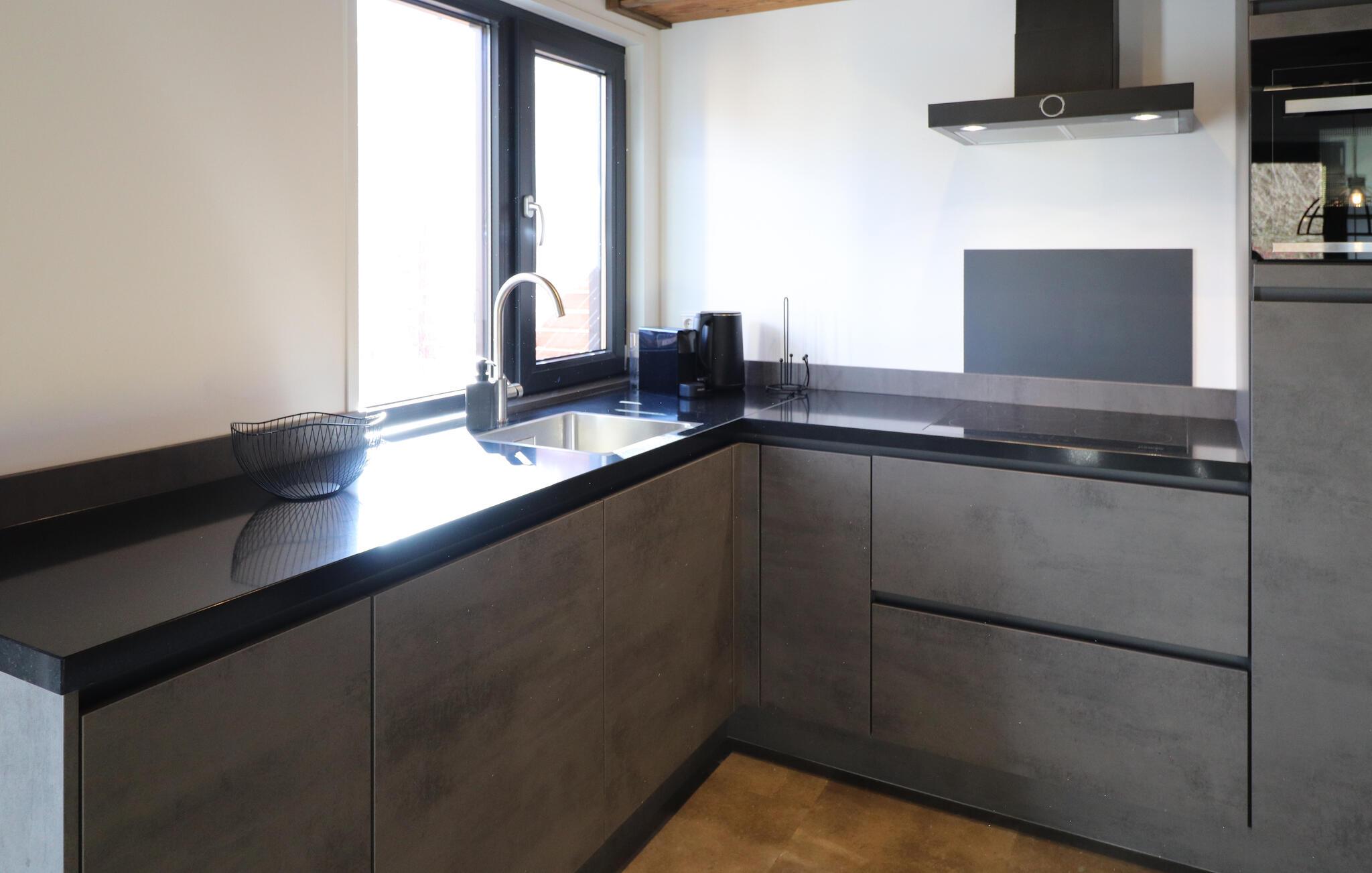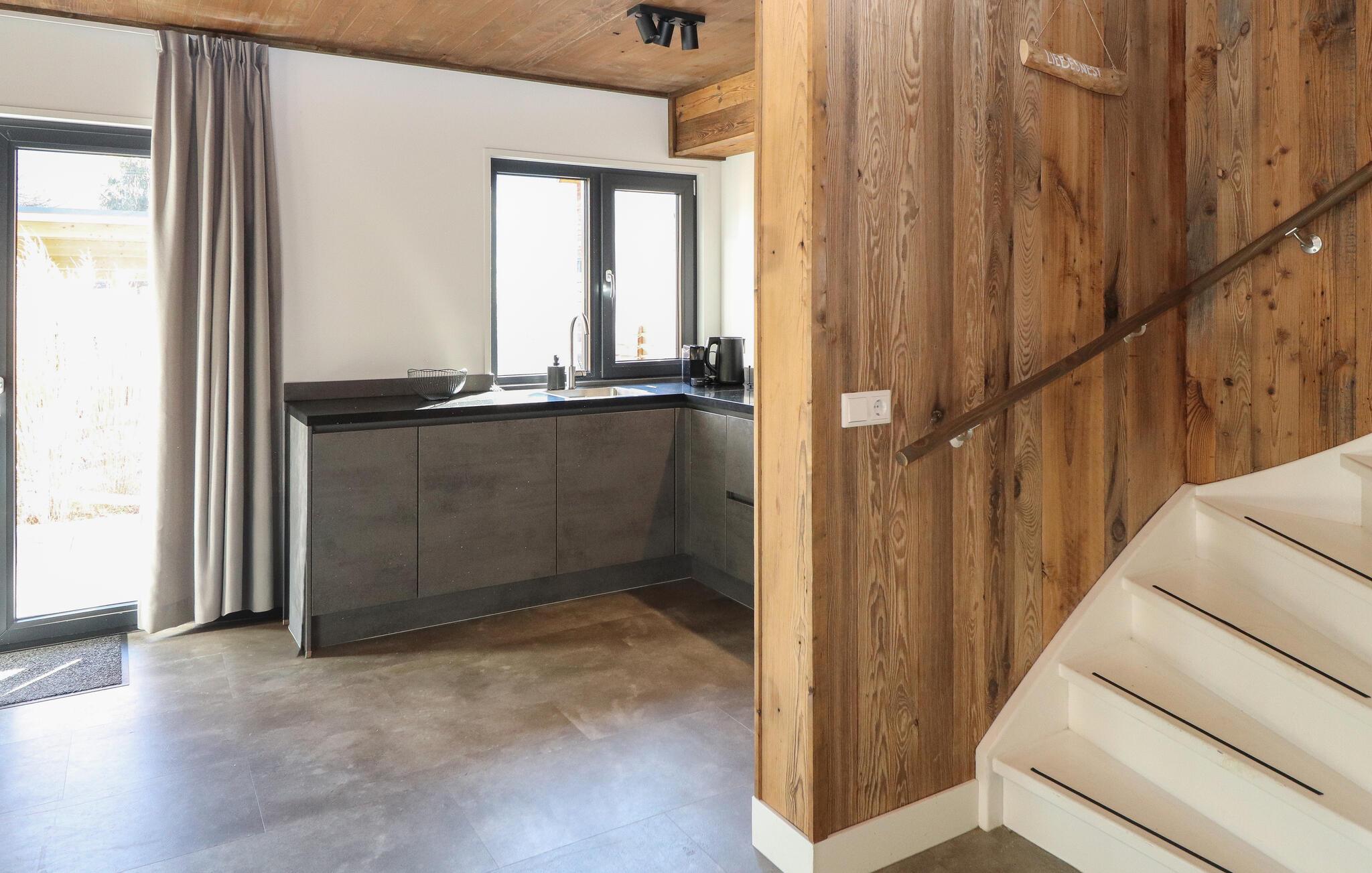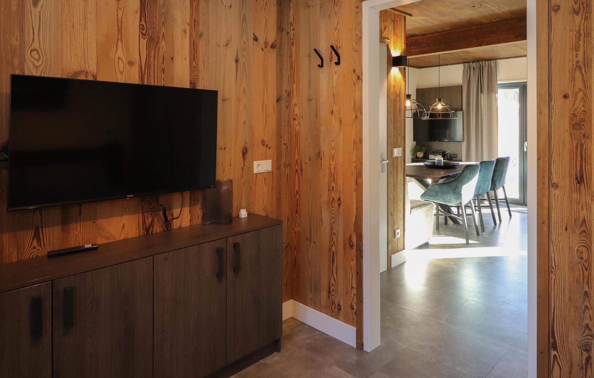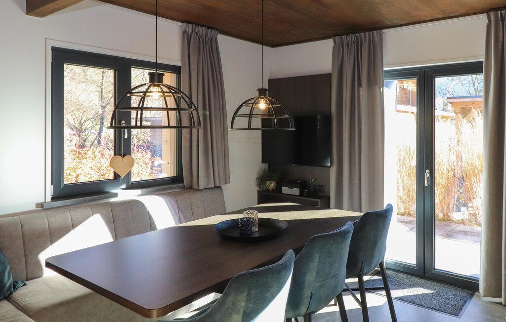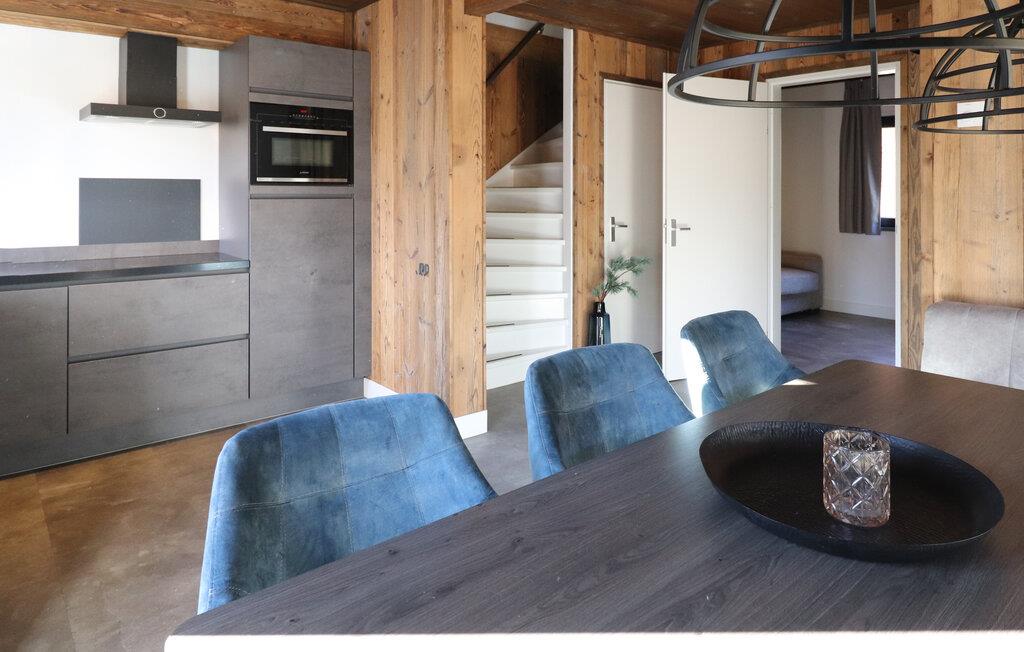 I jeres feriehus vil I sætte pris på den hyggelige blanding af træ, varme farver og moderne design, der er tydelig i hele ejendommen. Den åbne stue kombinerer en komfortabel sofa med et stort fladskærms-tv, hvilket skaber et perfekt sted til afslappende aftener. find sammen omkring spisebordet og planlæg jeres næste dags eventyr. Lav mad sammen i det veludstyrede køkken, og udnyt den åbne planløsning til at holde kontakten, selv mens I laver mad.