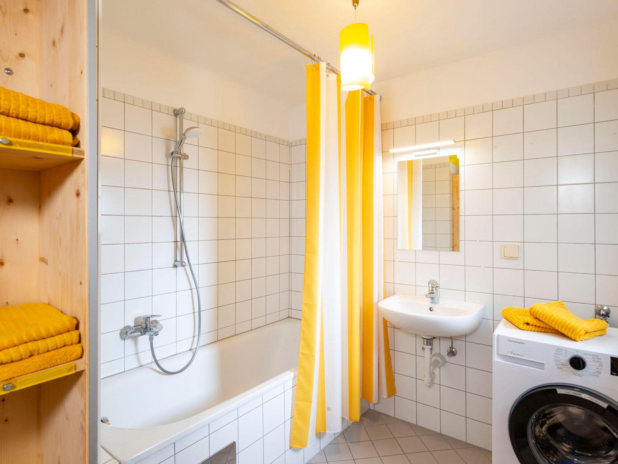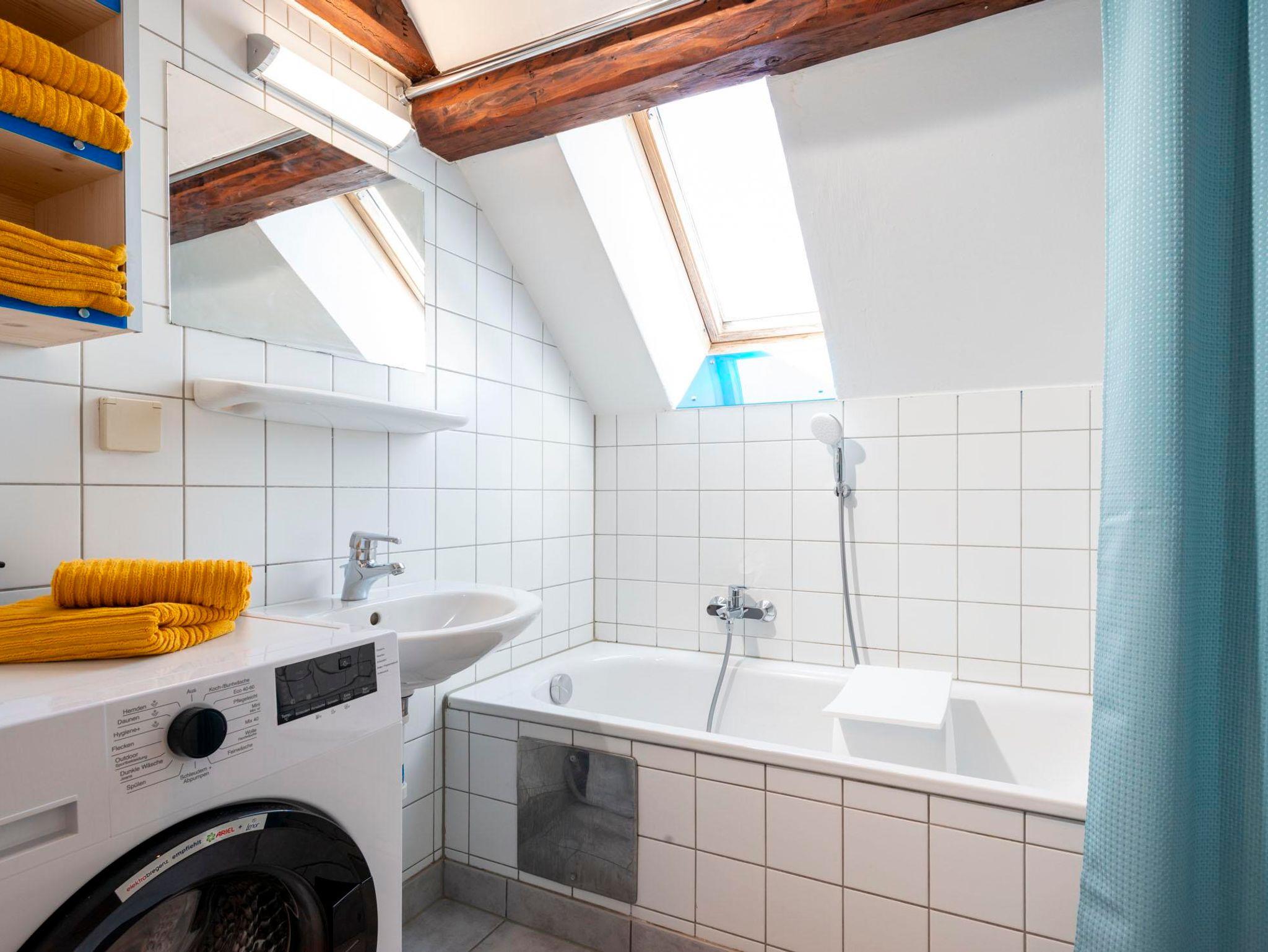 Das Badezimmer ist mit einer Badewanne ausgestattet und eine separate Toilette sorgt für zusätzlichen Komfort. Eine Waschmaschine steht ebenfalls zur Verfügung.