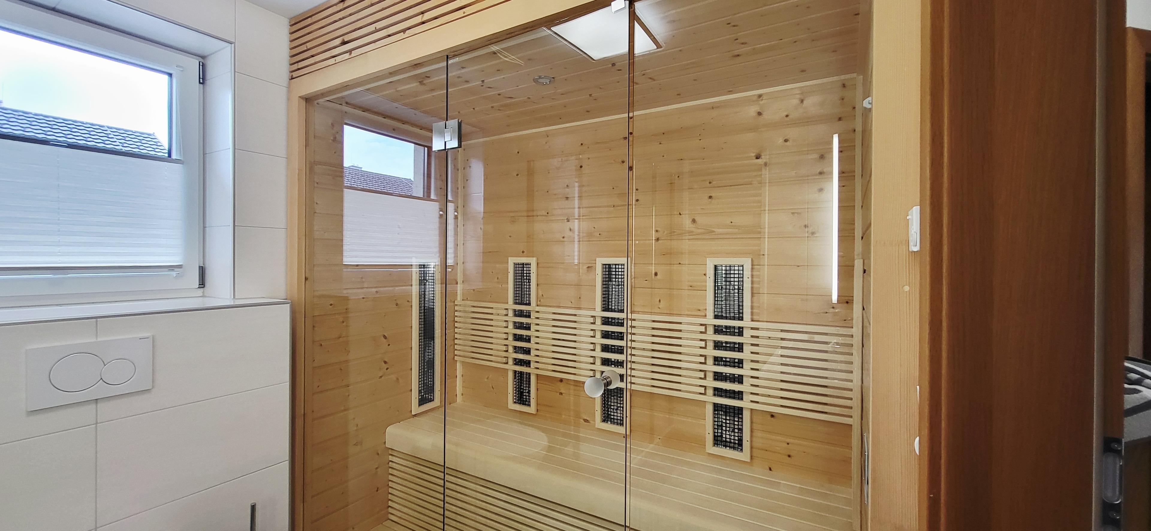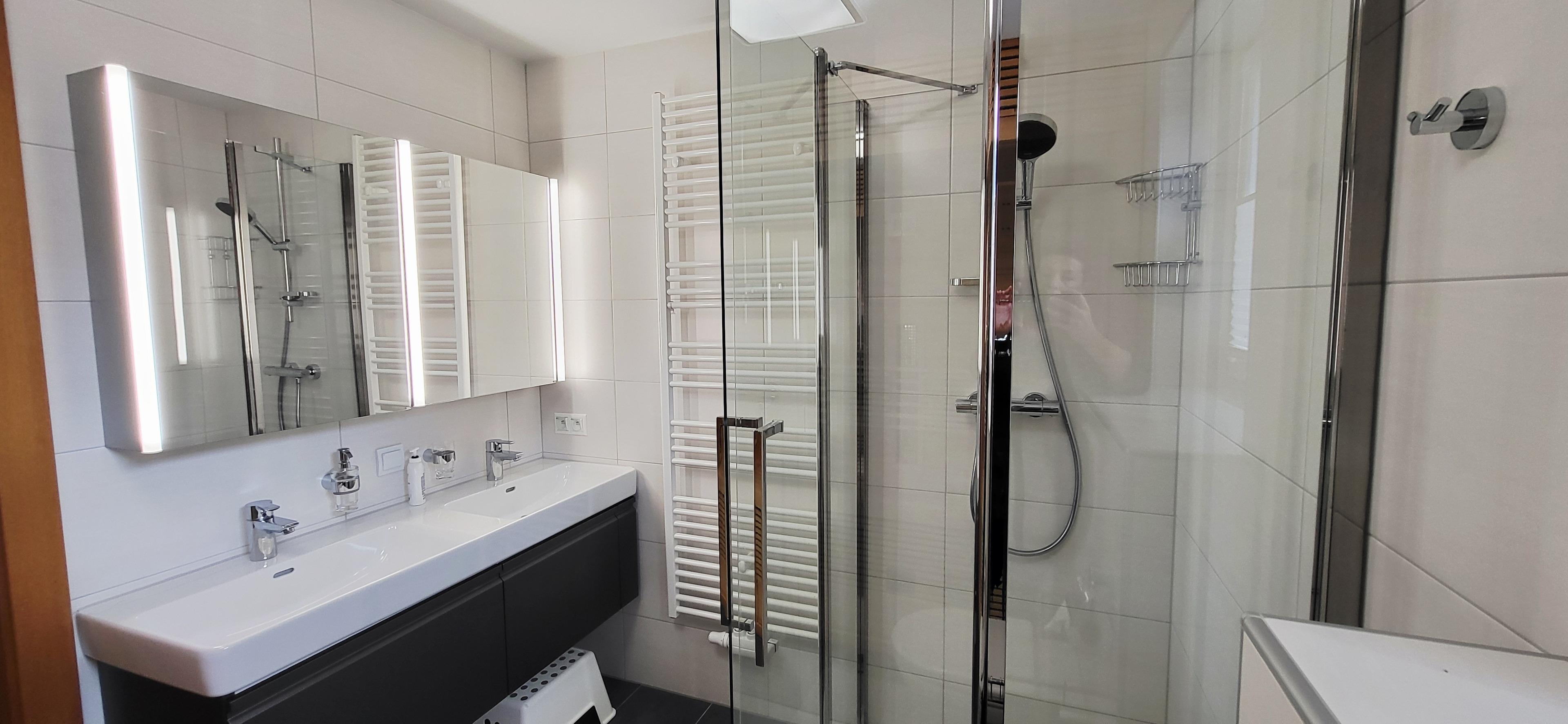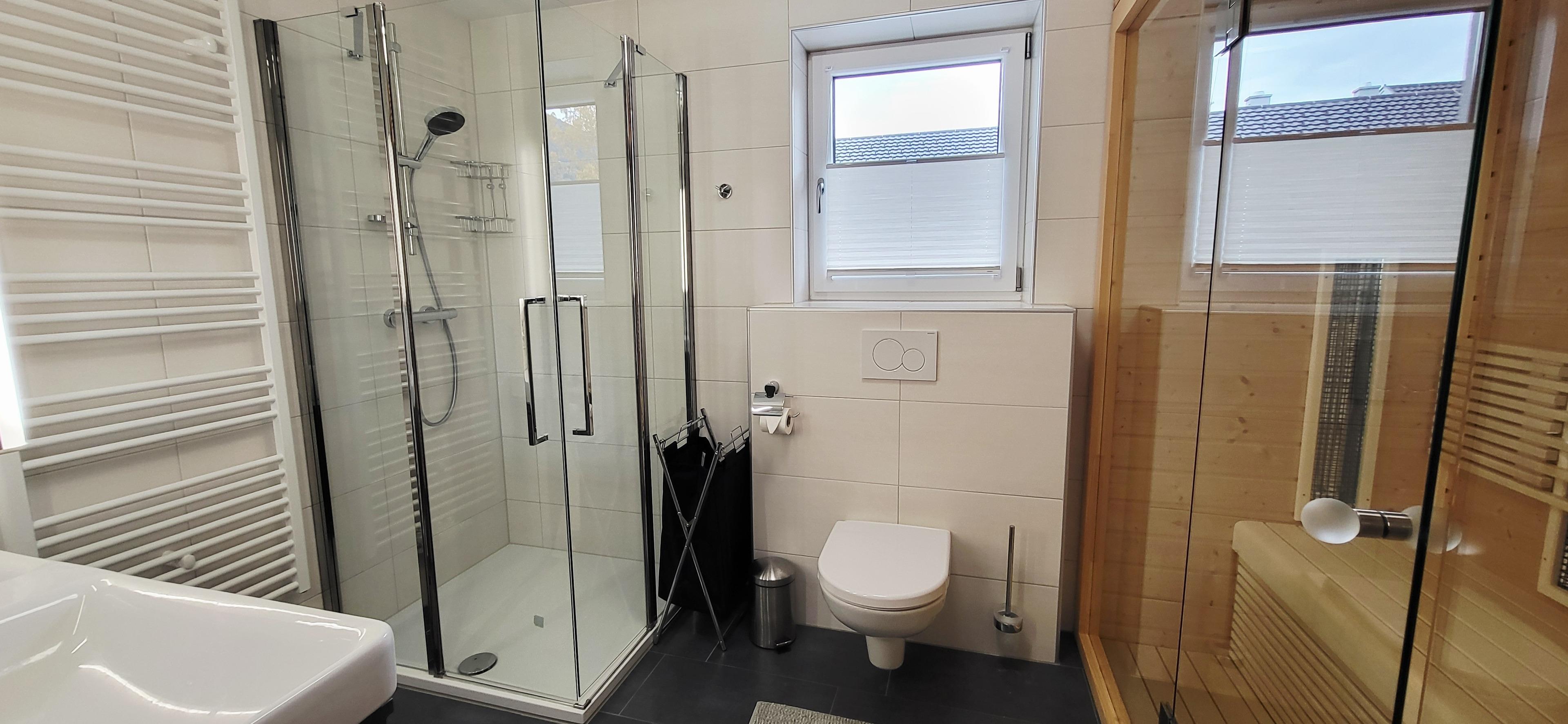 Im modernen Badezimmer stehen Ihnen eine Dusche, ein WC und eine eigene Sauna zur Verfügung – ideal zum Entspannen nach einem erlebnisreichen Tag in den Bergen.
