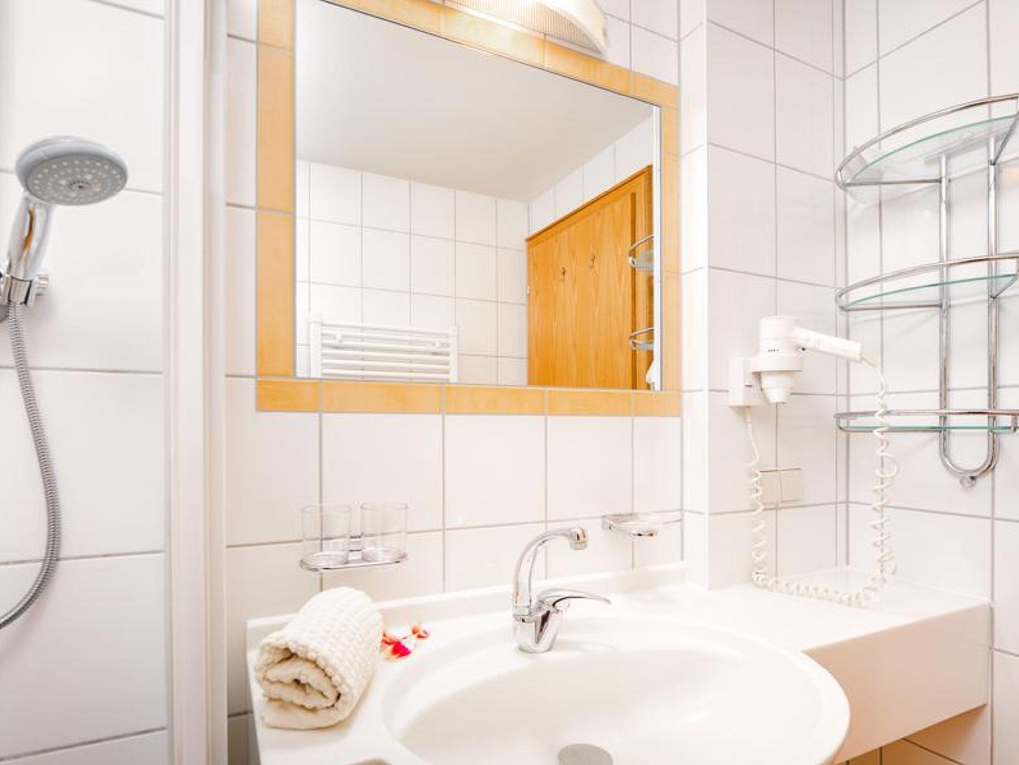Dusche und WC sind getrennt, Handtücher inklusive. Ausgestattet mit Sat-TV, Radio, Telefon und W-LAN.