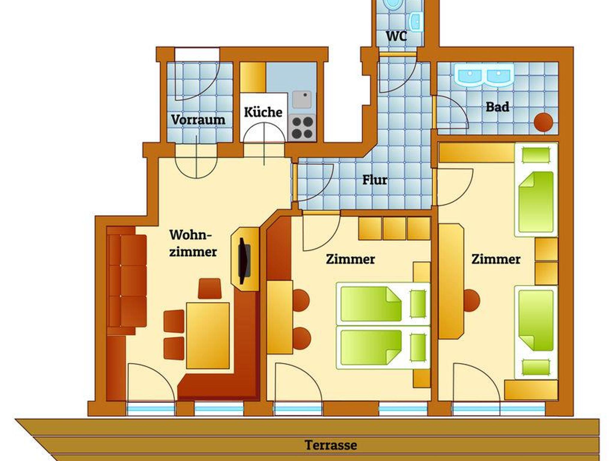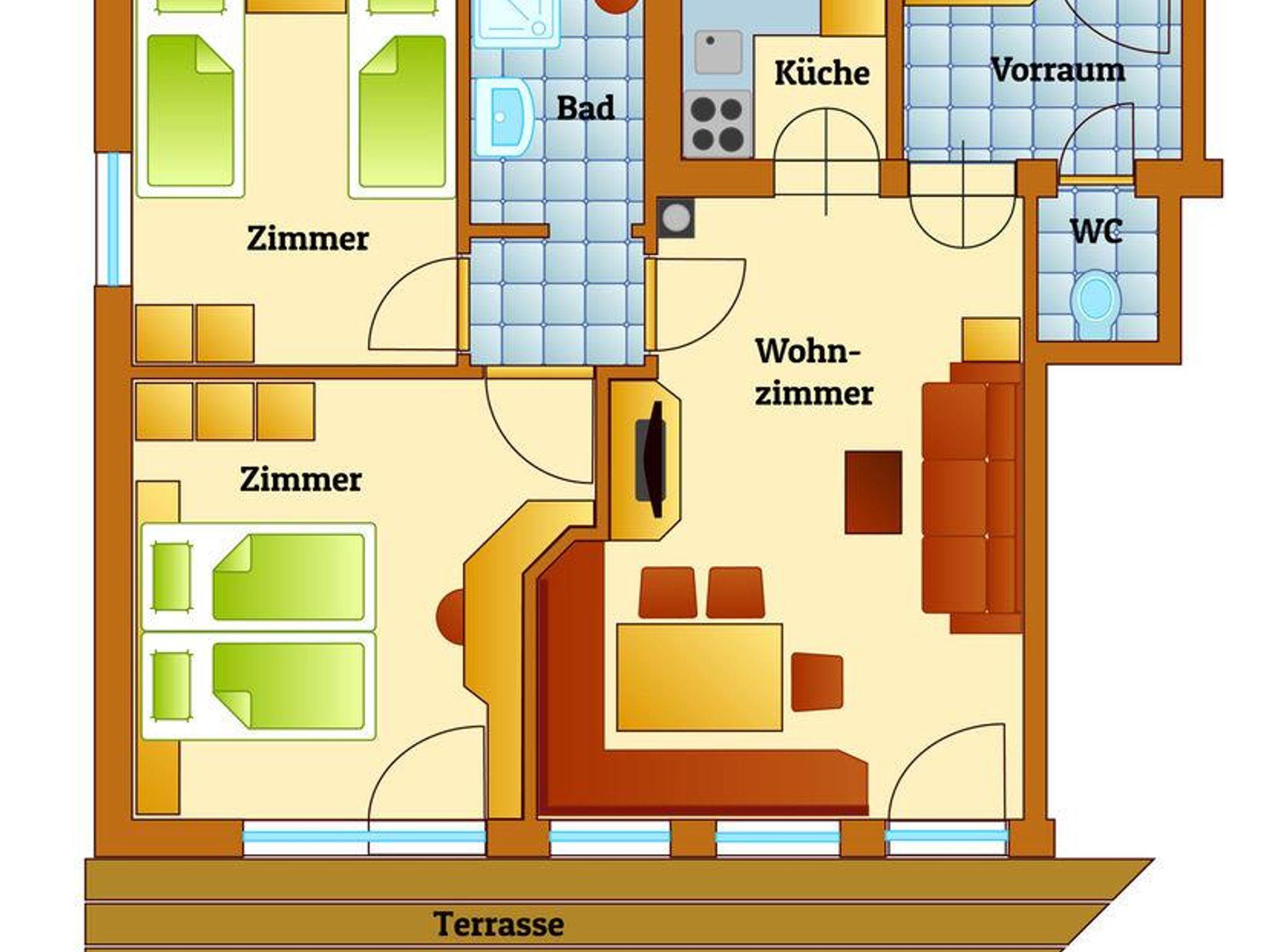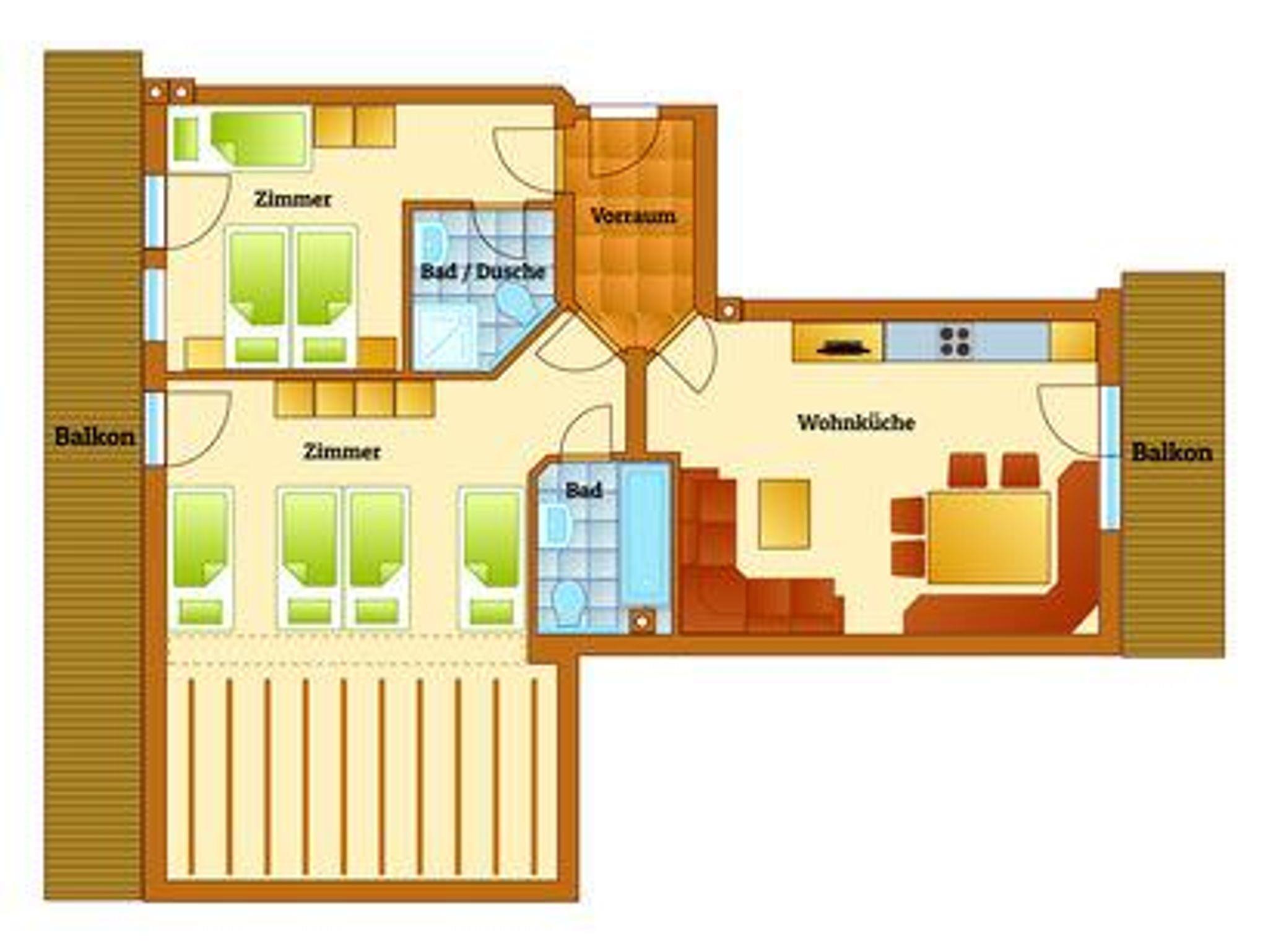 Genießen Sie großzügigen Wohnkomfort mit zwei Schlafzimmern (ein 3-Bettzimmer, ein 3-4 Bettzimmer), einer Küche mit Wohnbereich und einer ausziehbaren Couch. Das Appartement verfügt weiters über ein eigenes Badezimmer mit Dusche / WC sowie ein Badezimmer mit Bad / WC.