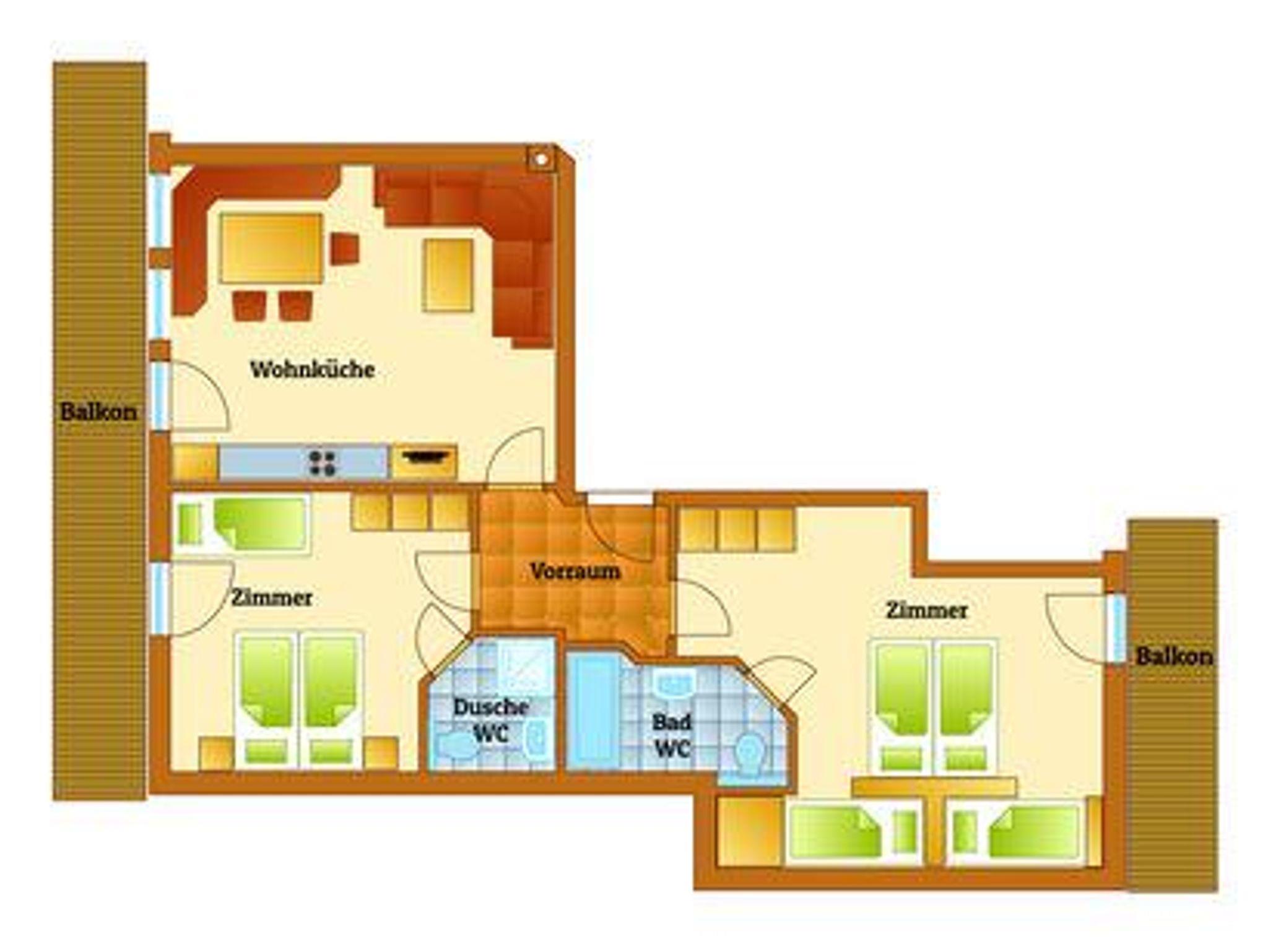 Genießen Sie großzügigen Wohnkomfort mit drei Schlafzimmern (zwei 3-Bettzimmer, ein 2-Bettzimmer), einer Küche mit Wohnbereich und einer ausziehbaren Couch. Das Appartement verfügt weiters über ein separates Badezimmer, ein Badezimmer mit Dusche / WC sowie ein separates WC.