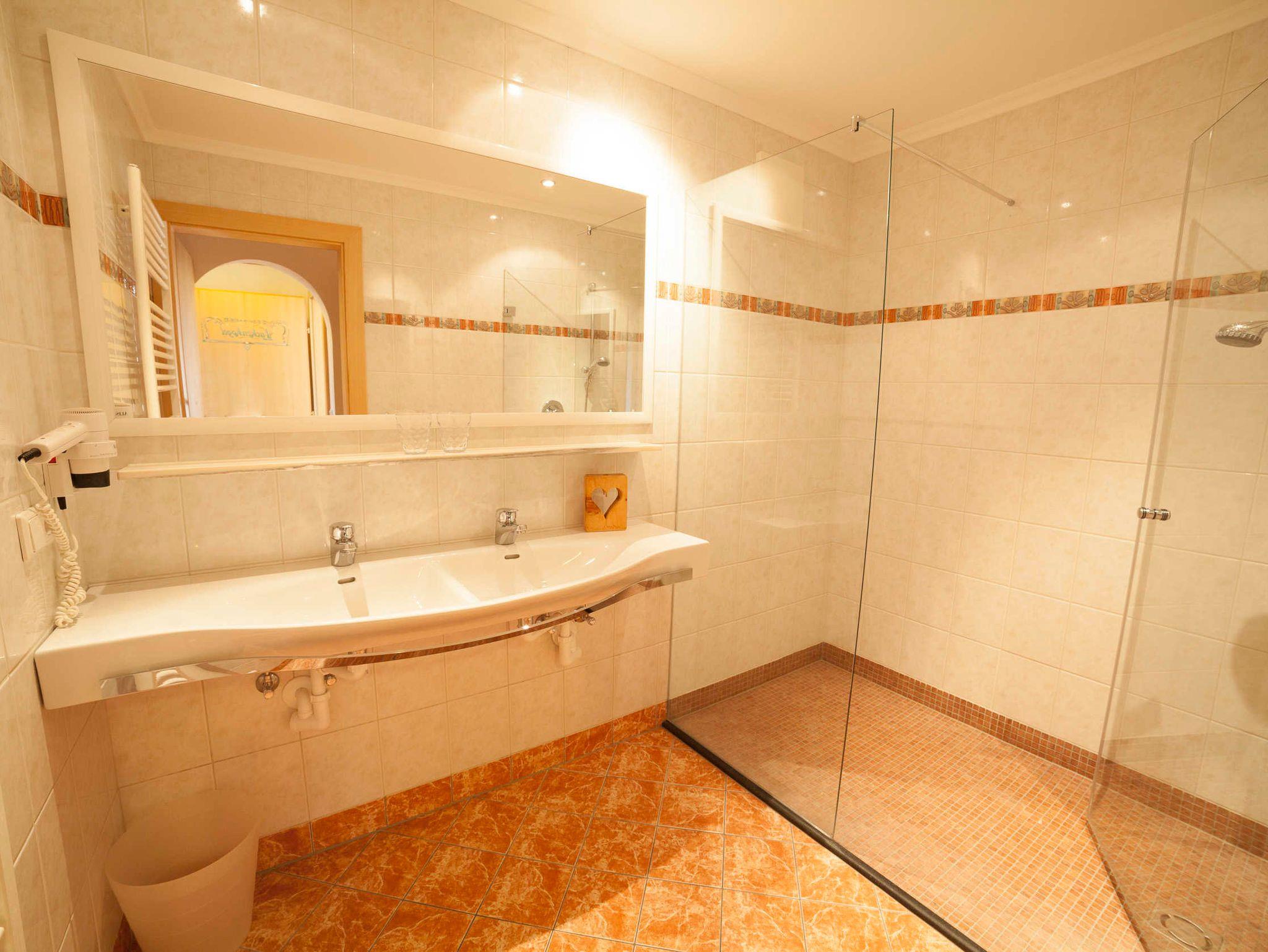 Ein Badezimmer mit Doppelwaschbecken und Dusche, WC ist extra. Kleiner Vorraum.