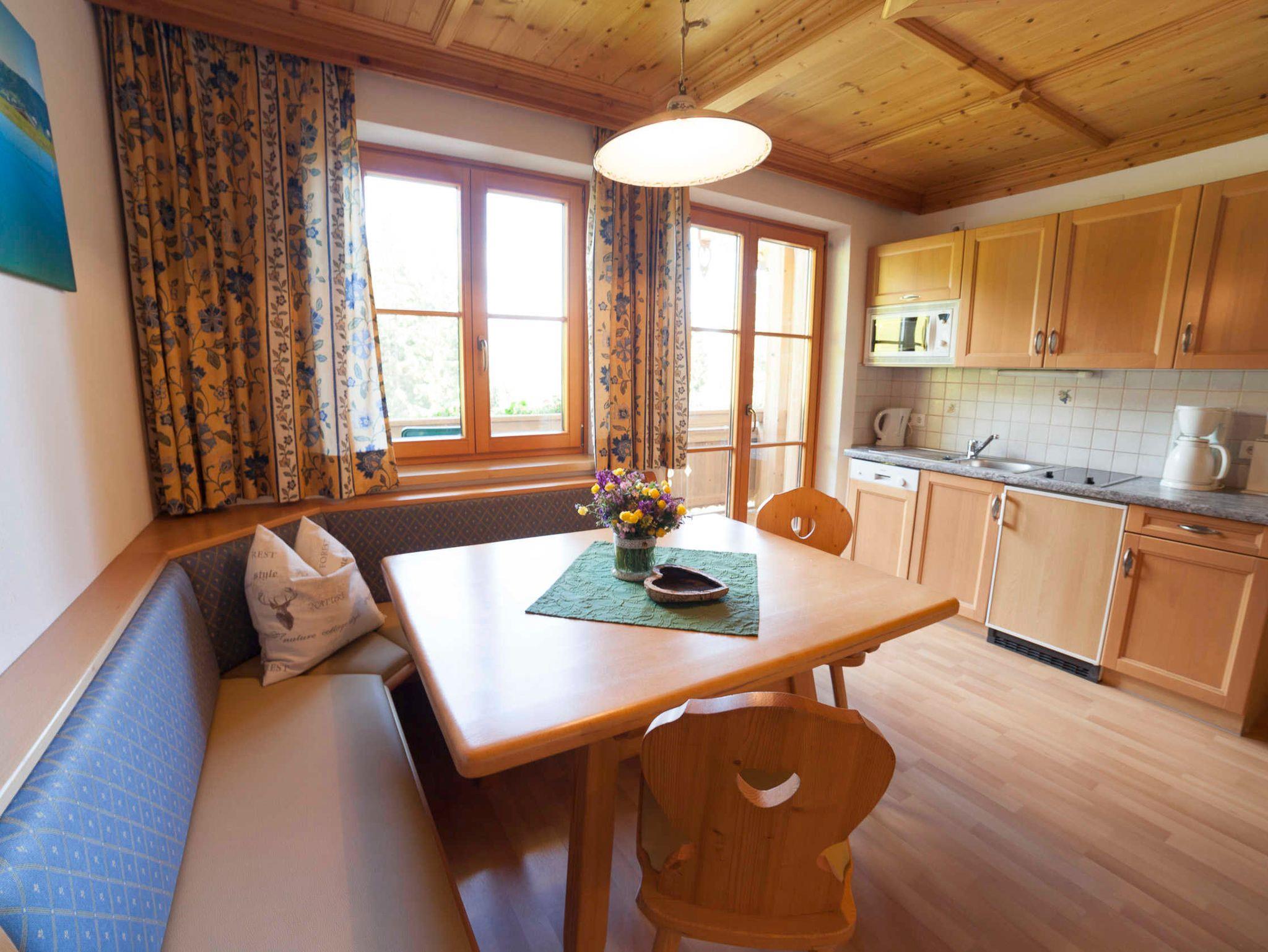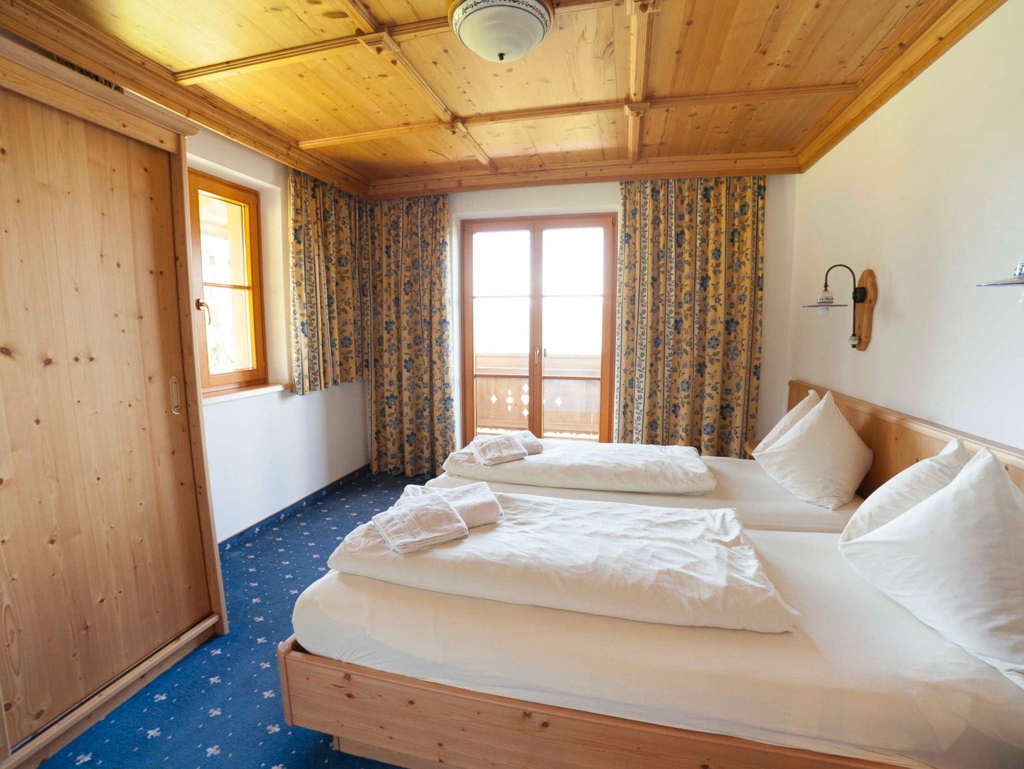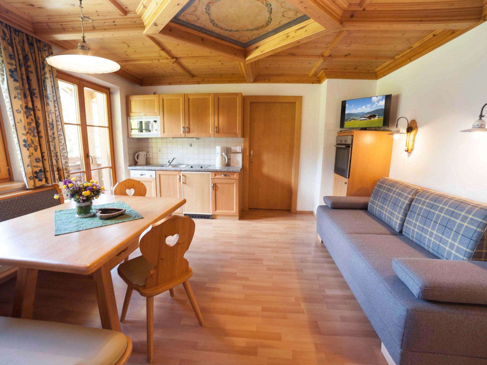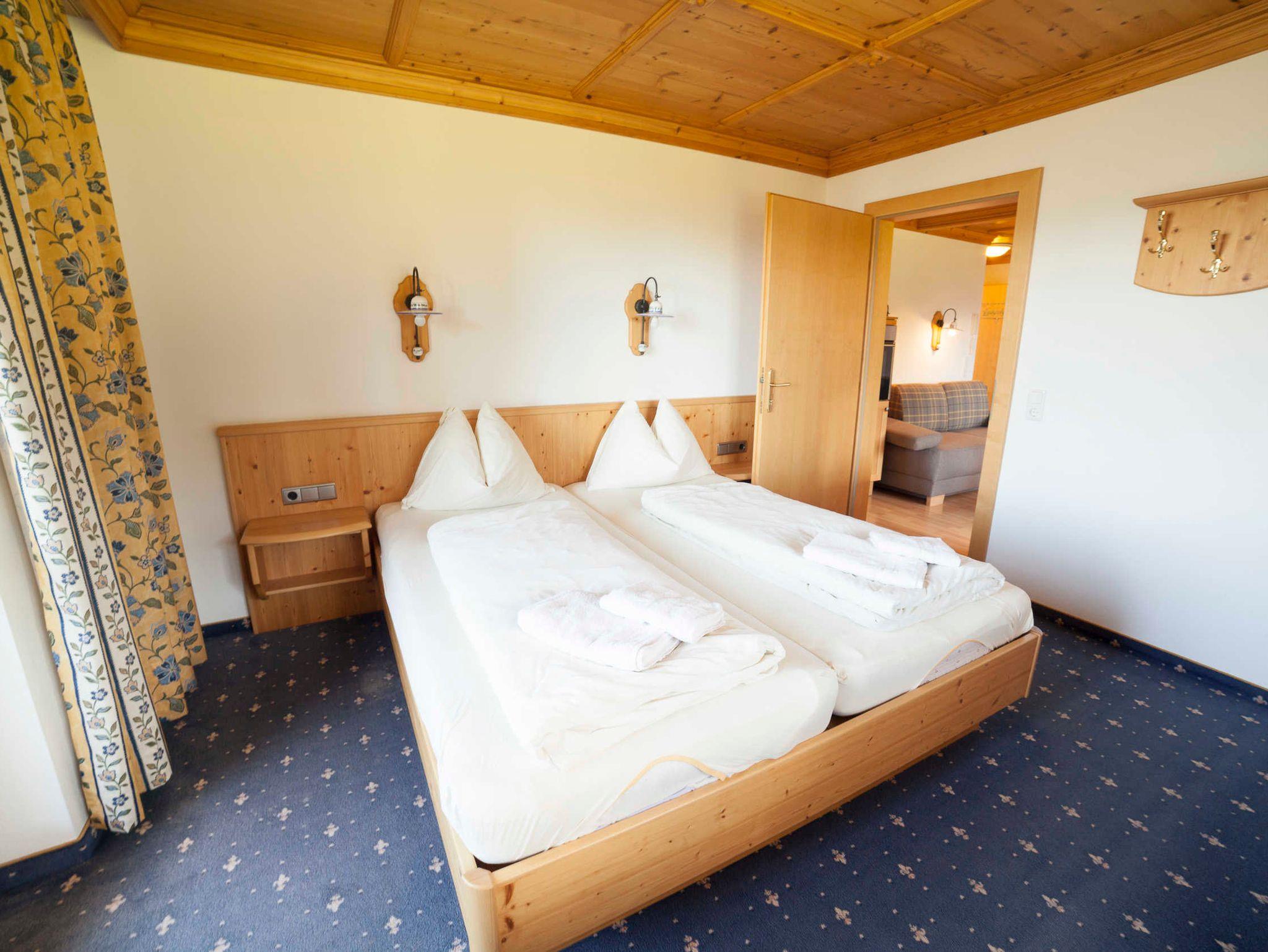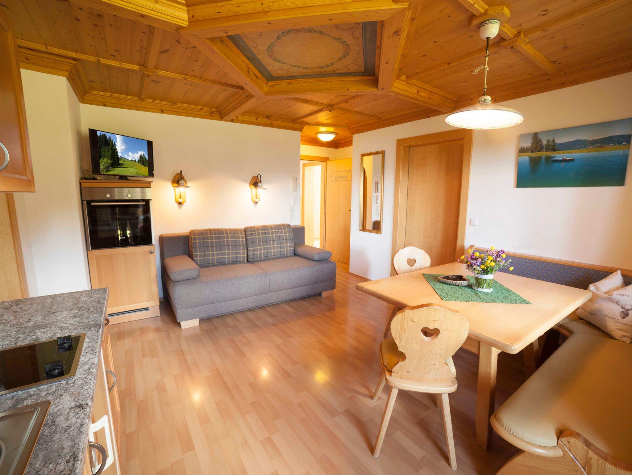 Das Appartement Lackenkogel für 4 bis 7 Personen ist ausgestattet mit 2 getrennten Schlafzimmern, davon eines mit 3 Betten und das andere mit 2 Betten; ein geräumiger Wohnschlafraum mit Doppelausziehcouch und voll ausgestatteter Kochecke.