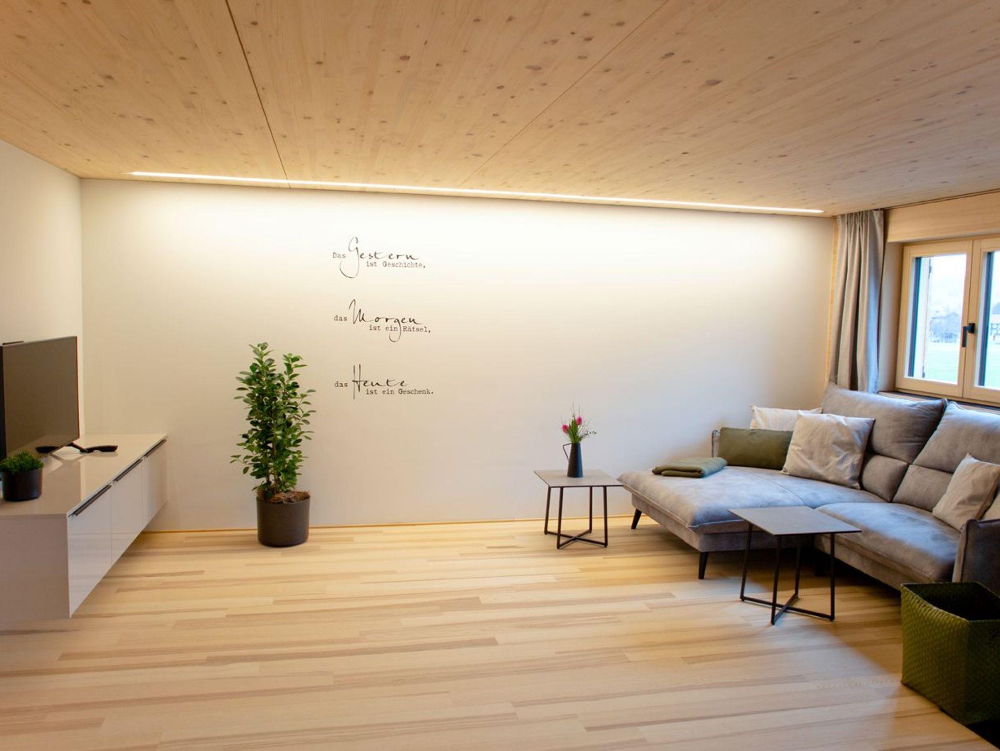 Das Appartement befindet sich im 1. Stock des Hauses. Auf der Südseite gelegen präsentiert es einen atemberaubenden Panoramablick über den Bregenzerwald. Mit rund 100 Quadratmeter bietet das stilvolle Appartement an die Gedanken schweifen zu lassen.