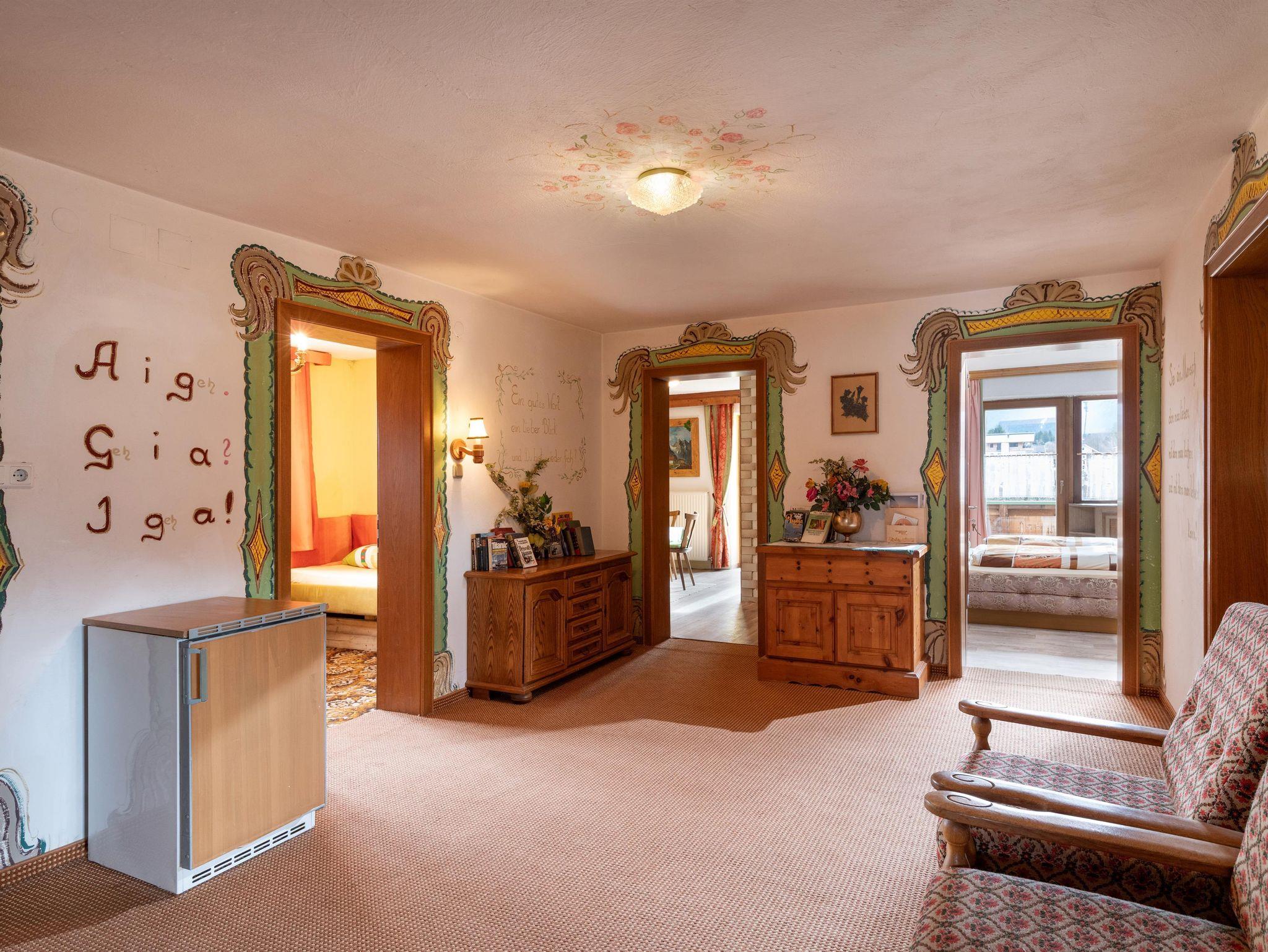 Unsere Ferienwohnung befindet sich im ersten Stock und erstreckt sich über zirka 100 m². Mit 4 Schlafzimmern, wobei jedes ein eigenes Bad und WC besitzt, hat man mit bis zu 7 Personen super Platz. 2 Kühlschränke und eine separate Küche laden zum gemeinsamen Kochen ein. Die Schlafzimmer sind aufgeteilt in zweimal mit Doppelbett, einmal ein doppeltes Bett als Ecke (Eckbett) und einmal mit einem Einzelzimmer. Von dem Balkon aus, zu dem Sie über 2 der Schlafzimmer direkten Zutritt haben, haben Sie einen tollen Ausblick auf die umliegende Bergwelt und den angrenzenden Inn.