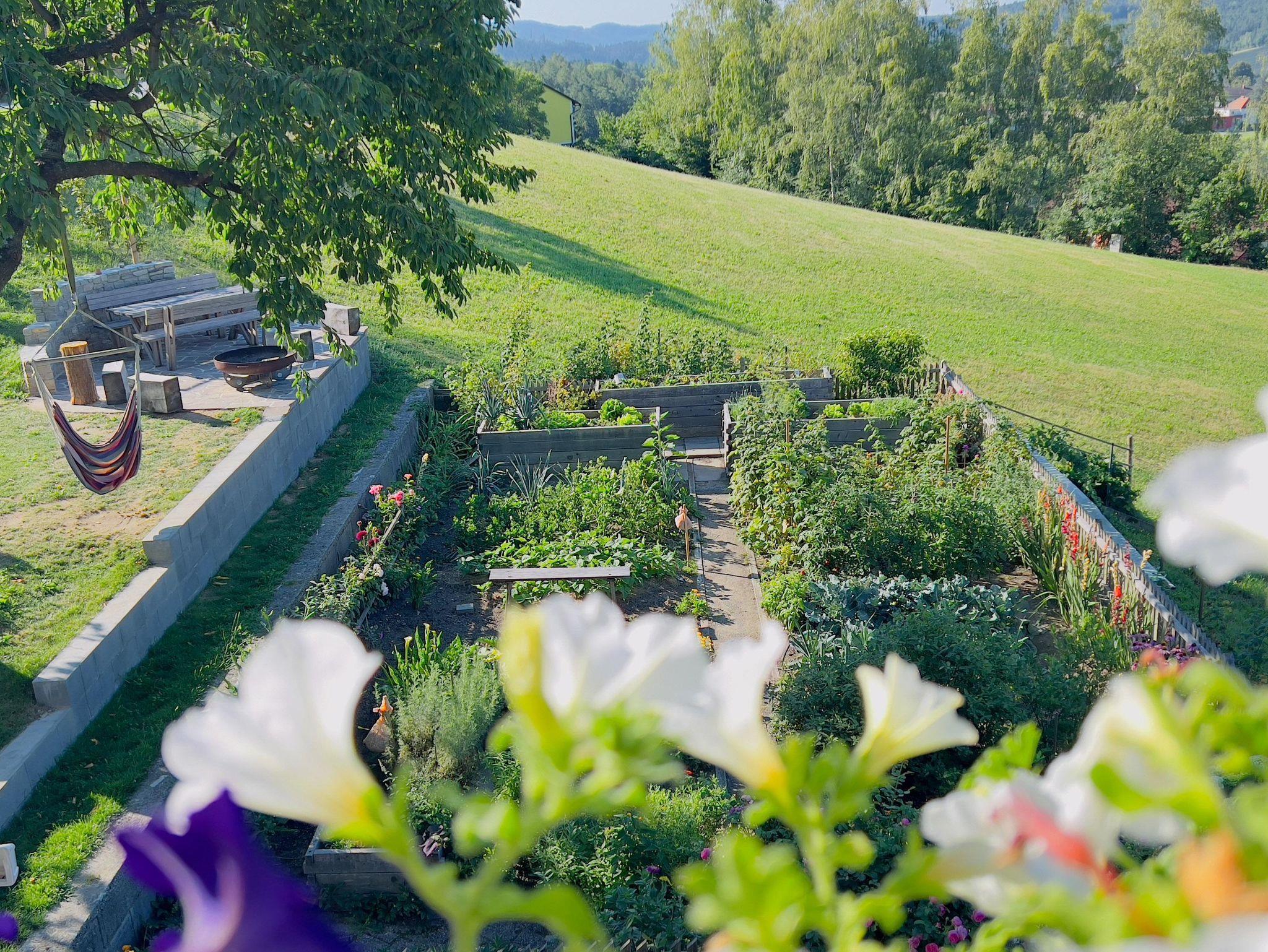 Ein besonderes Highlight ist der Balkon am Morgen: von hier erlebt man schon den ersten Sonnenstrahl, der Blick geht über den blühenden Bauerngarten und die herrliche Landschaft. Auf bequemen Liegestühlen kann man jeden Moment genießen.