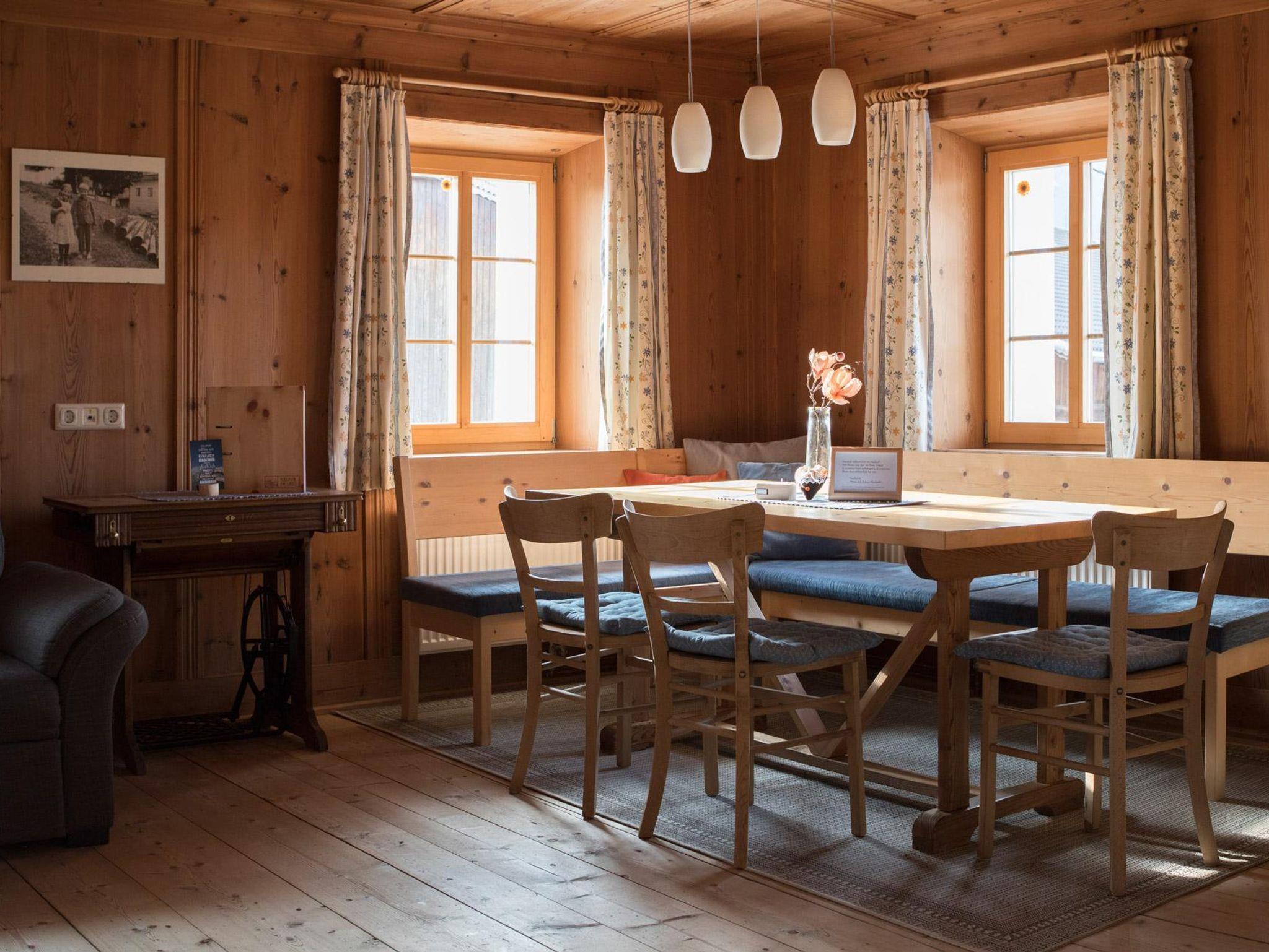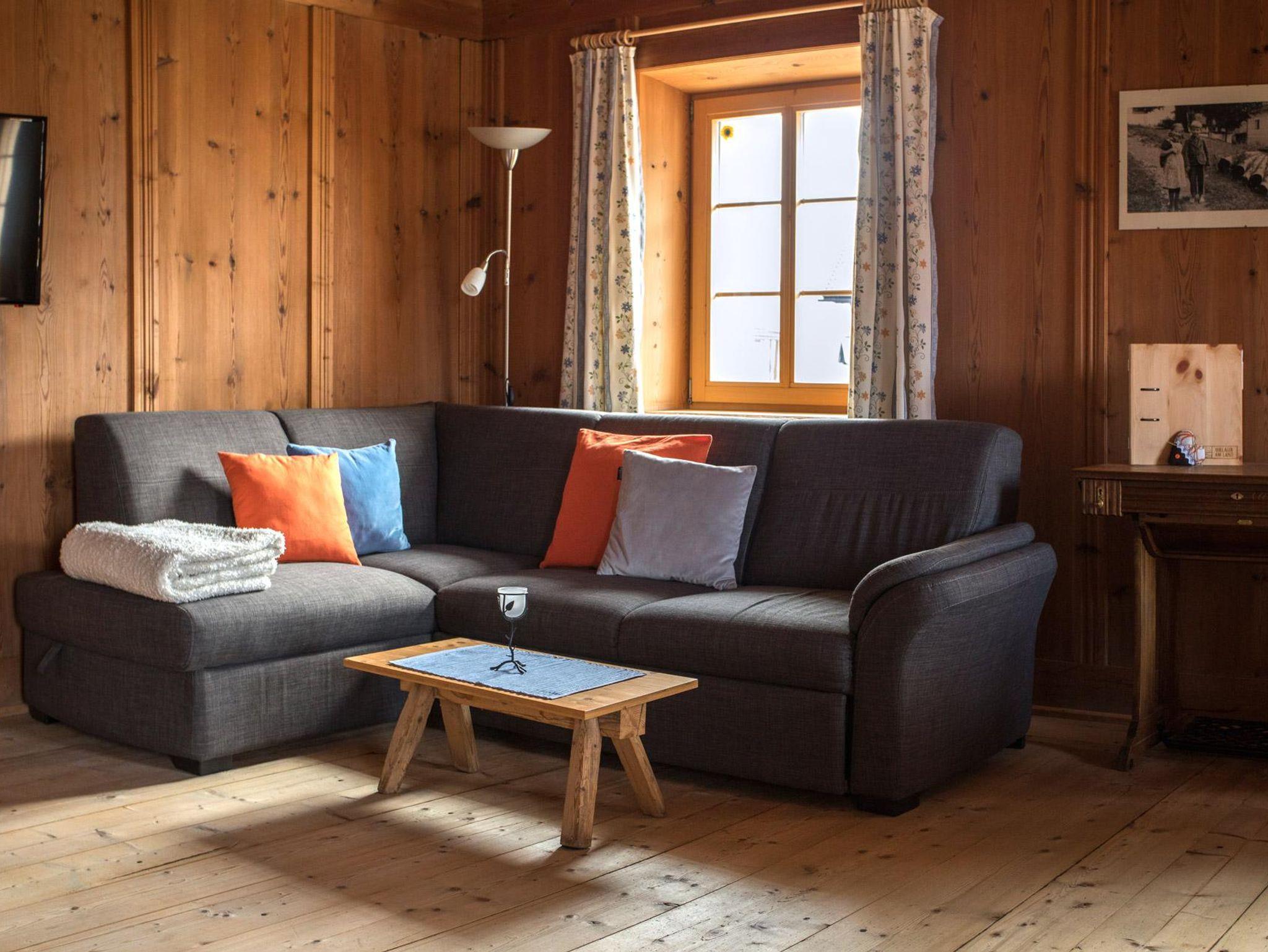 • Im Obergeschoss. Ein Schlafzimmer mit Doppelbett, Bad mit WC und Dusche. Originale Bauernstube mit integrierter Küche, orgineller Sitzecke, Essbereich und ausziehbarer Couch. Zugang zum südseitigen Balkon. Garten, Spielplatz kann mitgenutzt werden.