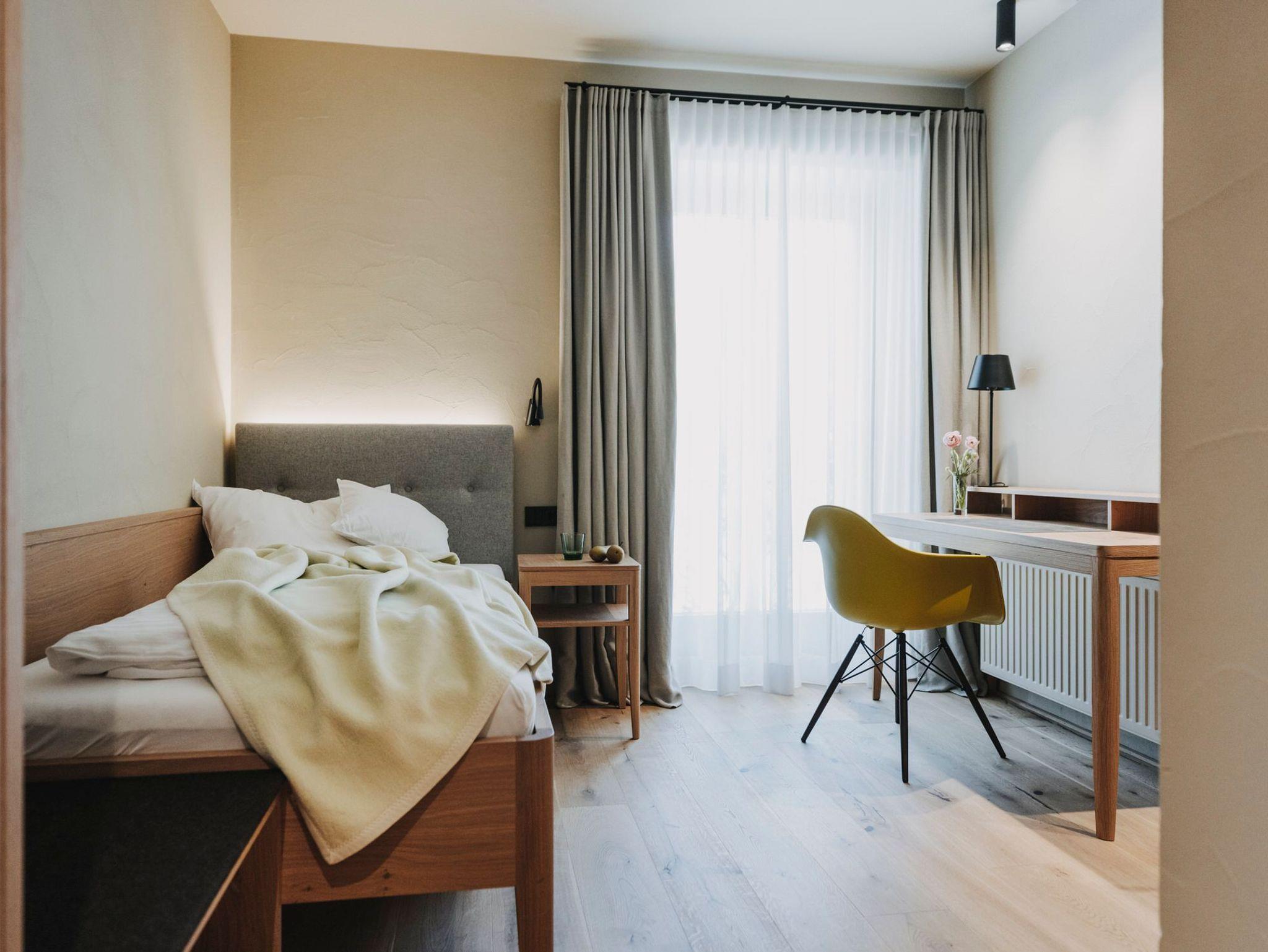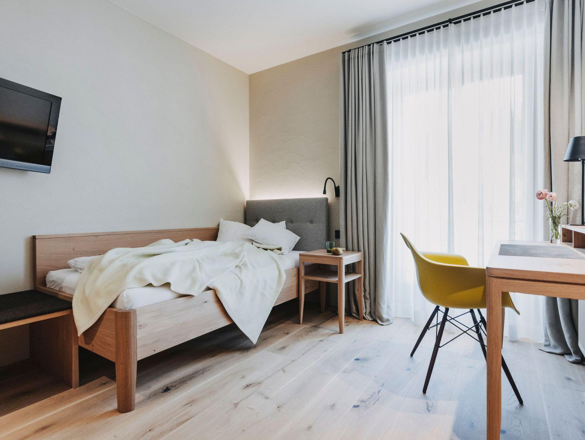 Einzelzimmer (ca. 18 m²) - im modernen Design mit alpinem Charme - ausgestattet mit Holzboden, Schreibtisch mit Sitzmöglichkeit, Telefon, Flat-TV, Safe und modernes Badezimmer mit Regendusche, WC, Haarfön, Kosmetikspiegel.