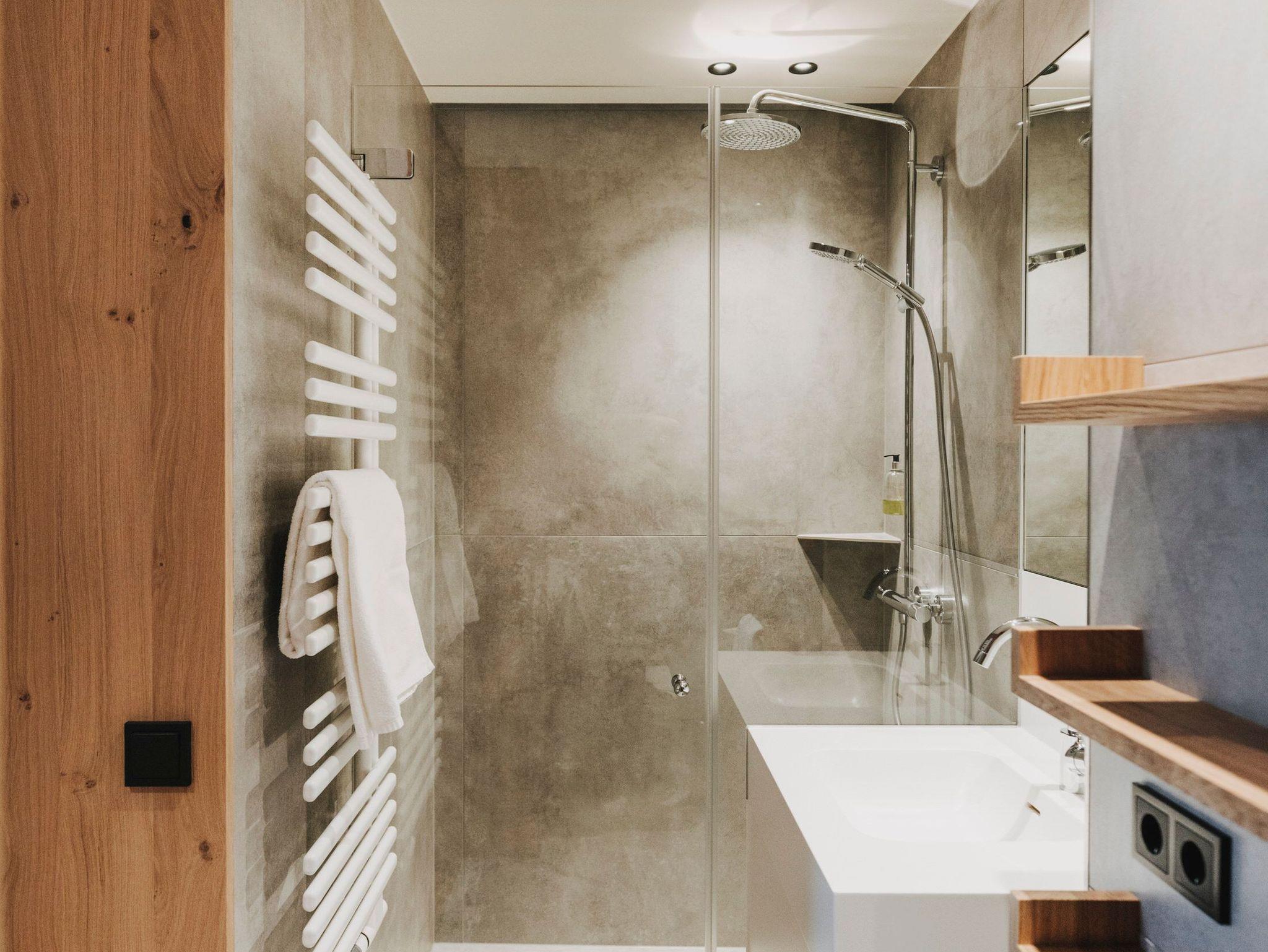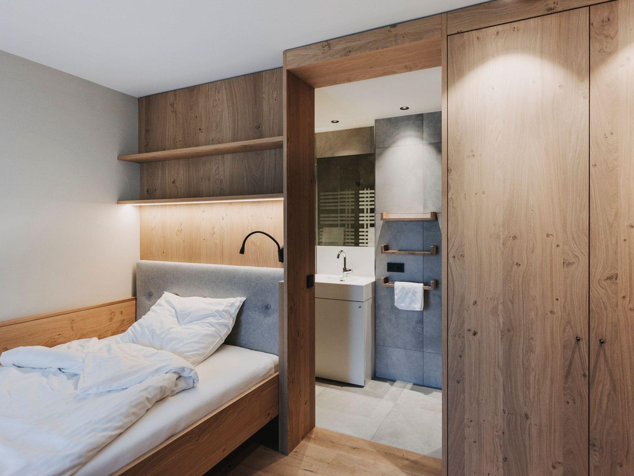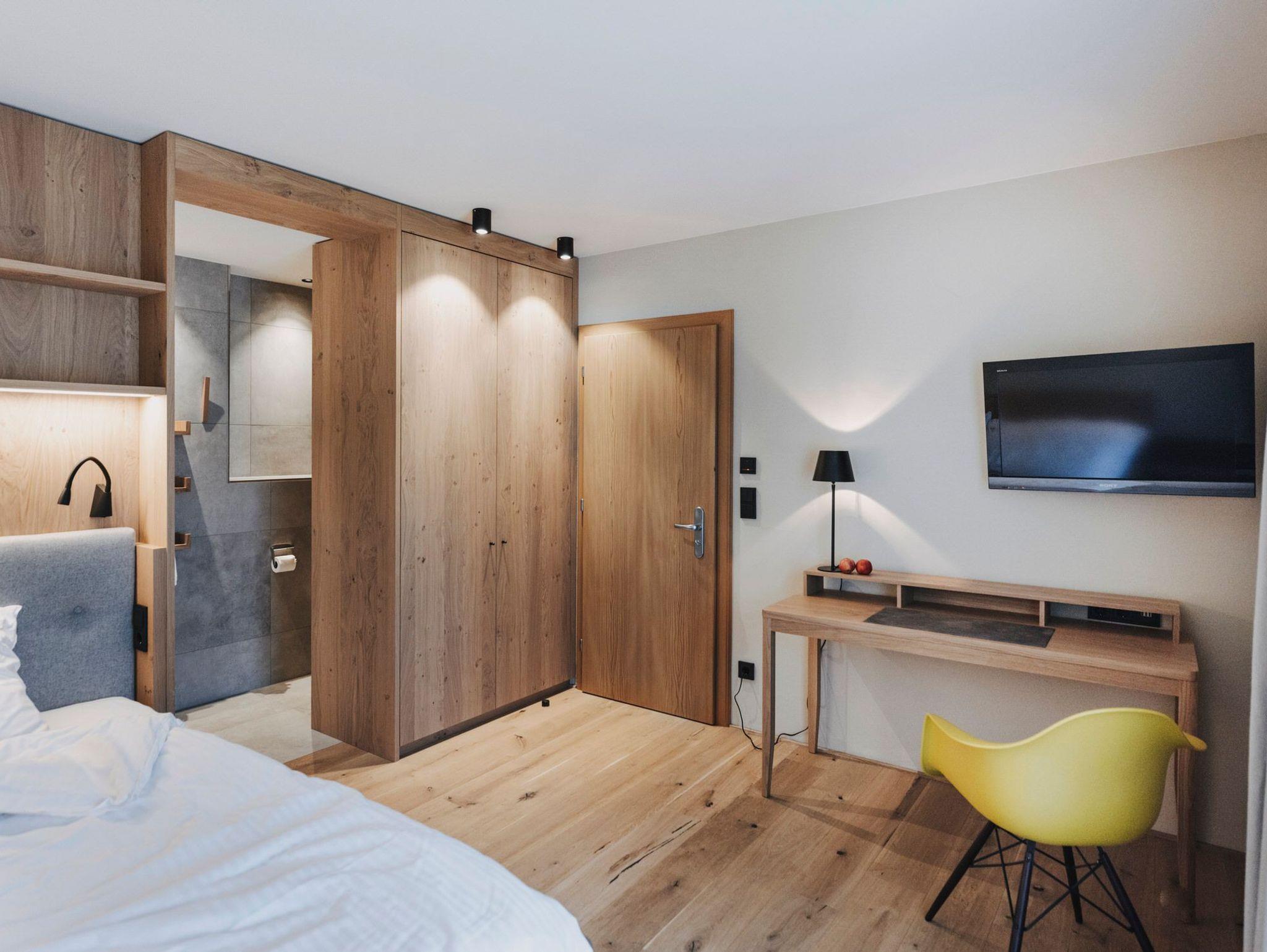 Exclusive Einzelzimmer (ca. 18 m²) - in modernem Design mit alpinem Charme - ausgestattet mit Holzboden, Schreibtisch mit Sitzmöglichkeit, Telefon, Falt-TV, Safe und modernen Badezimmer mit Regendusche, WC, Haarfön, Kosmetikspiegel.