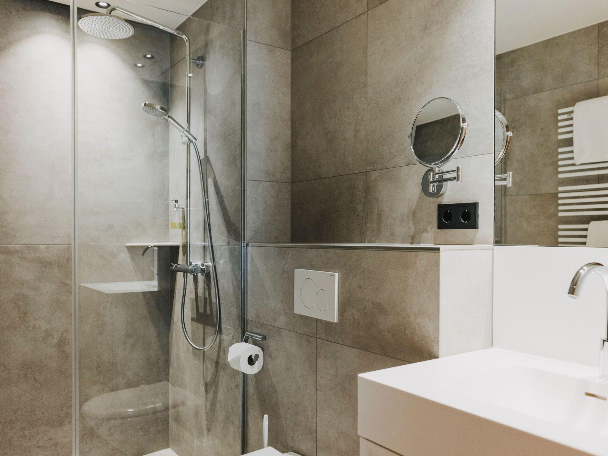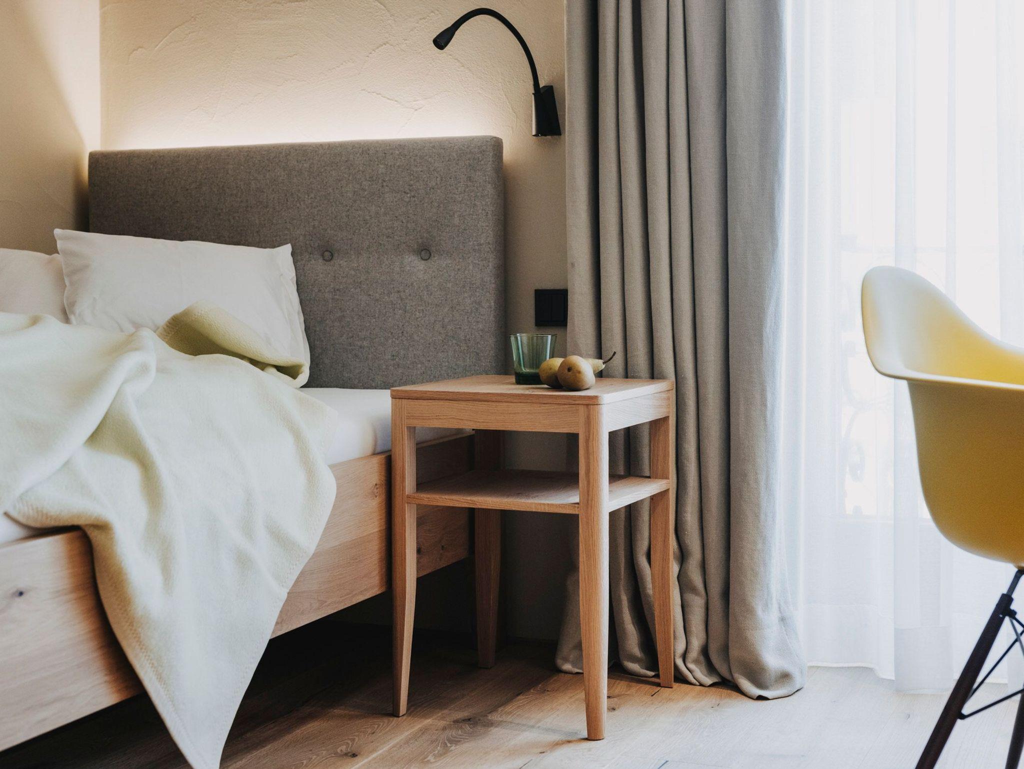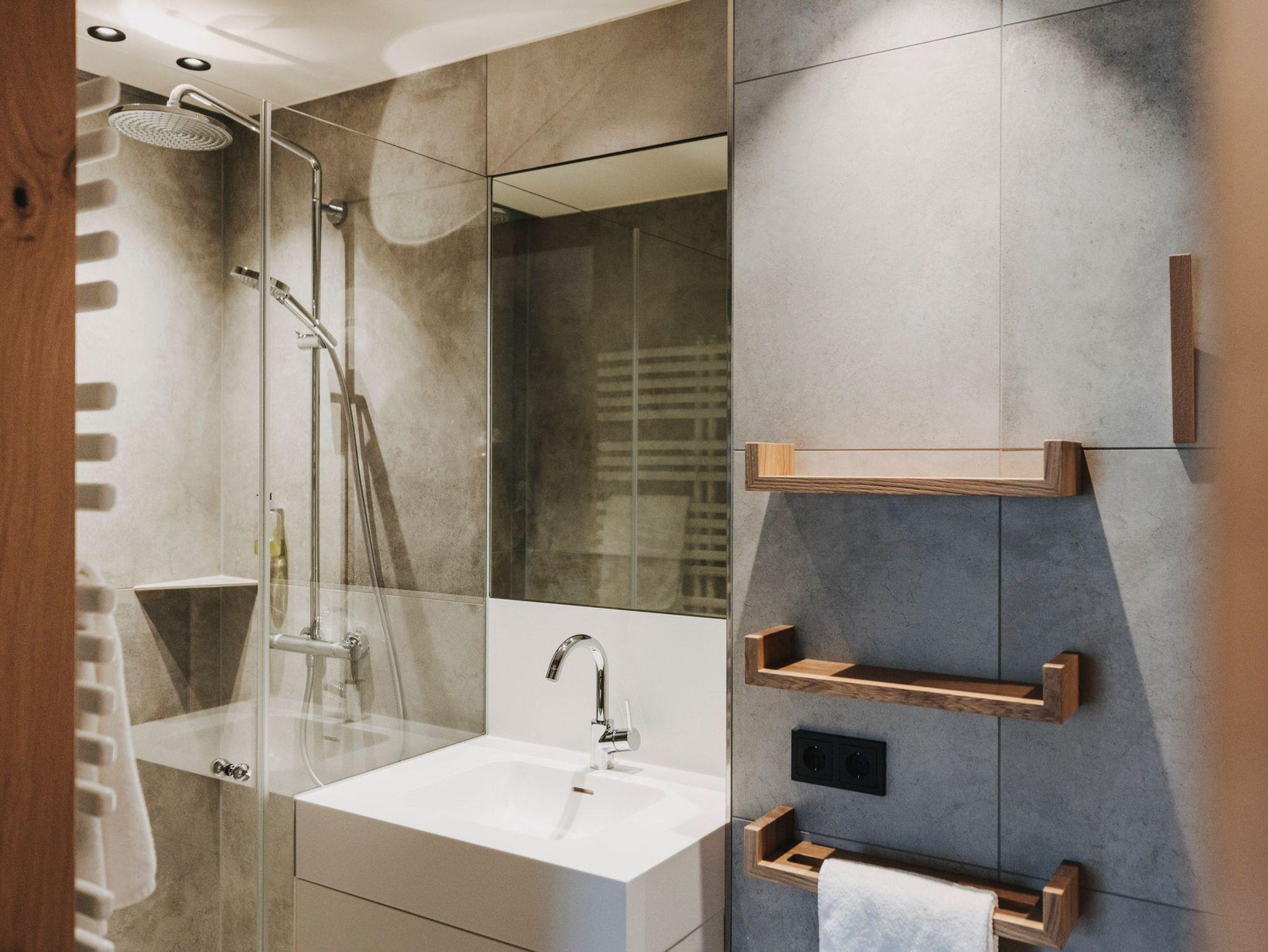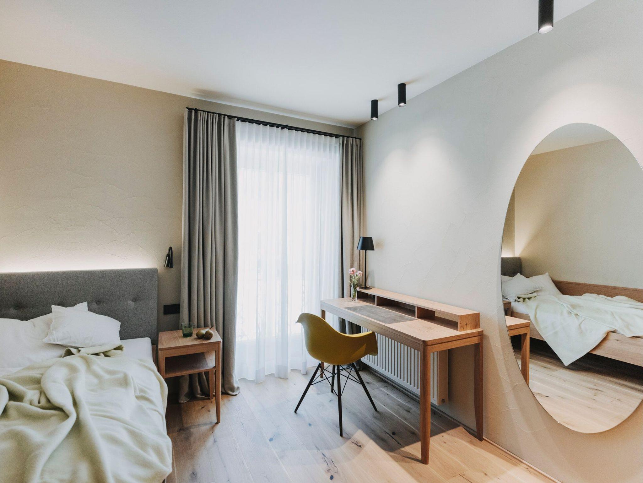 Exclusive Einzelzimmer (ca. 18 m²) - in modernem Design mit alpinem Charme - ausgestattet mit Holzboden, Schreibtisch mit Sitzmöglichkeit, Telefon, Falt-TV, Safe und modernen Badezimmer mit Regendusche, WC, Haarfön, Kosmetikspiegel.