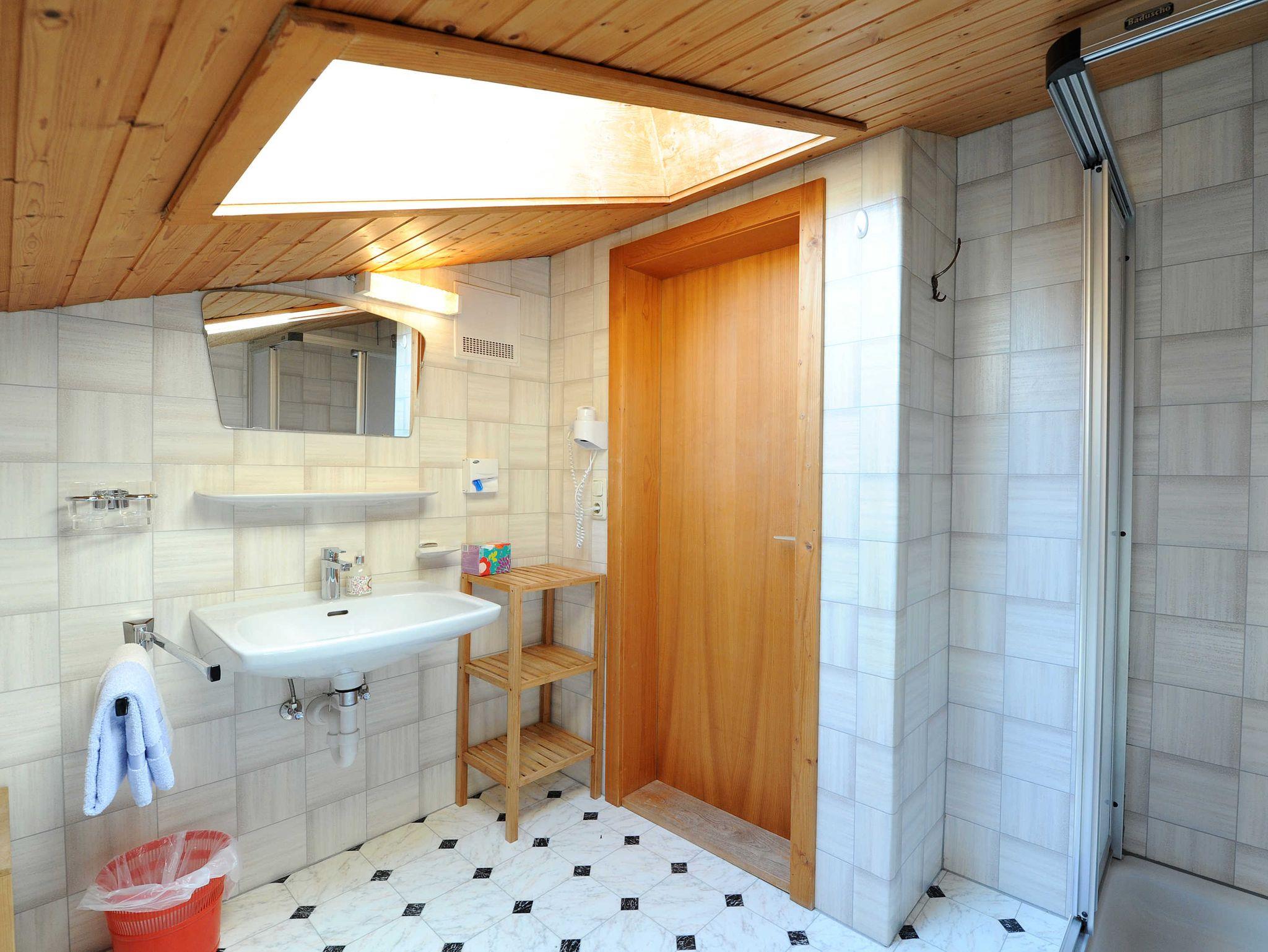 Gemütlich eingerichtetes Doppelzimmer mit Dusche/WC, TV und Dachschräge.