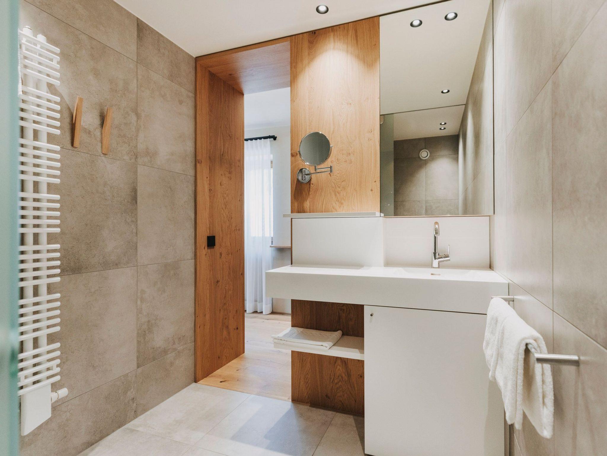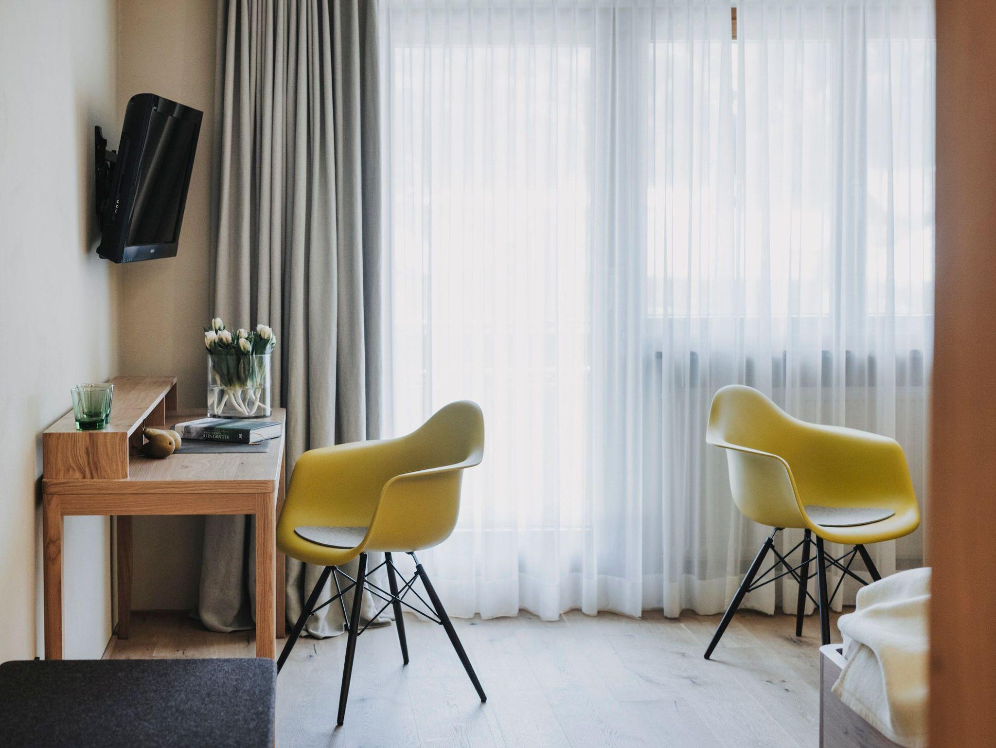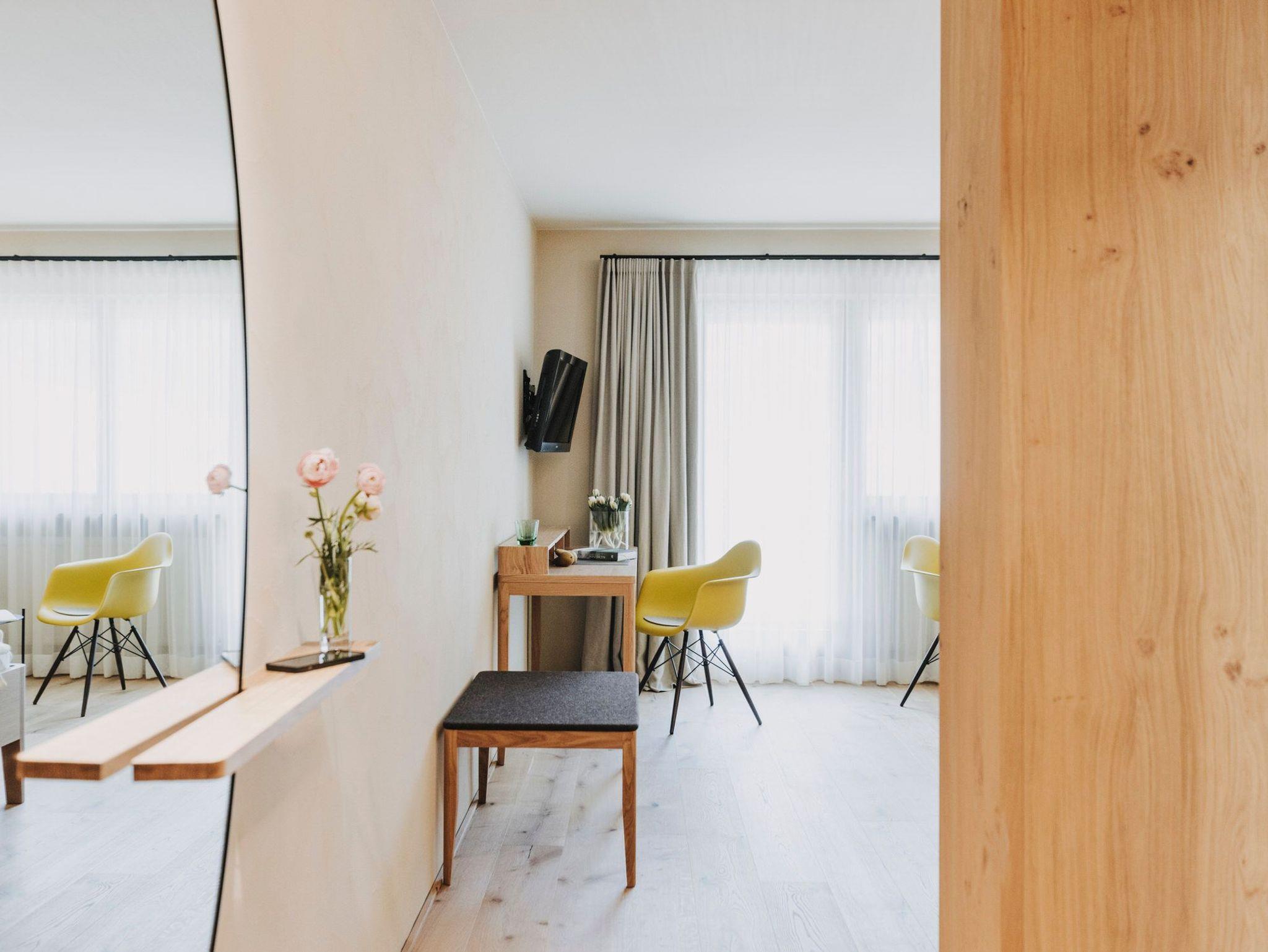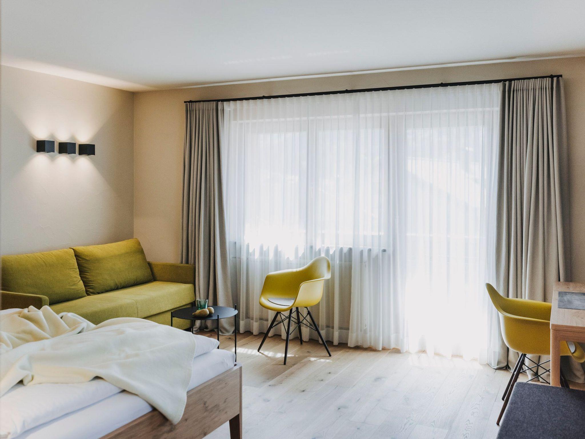 Exclusive DOPPELZIMMER - ca. 32m² - im modernen Design mit alpinen Charme - ausgestattet mit Südbalkon, Holzboden, Schreibtisch, Telefon, Flat-TV, Safe, gemütlichem Sitzsofa und modernem Badezimmer mit Regendusche, WC, Haarfön, Kosmetikspiegel.