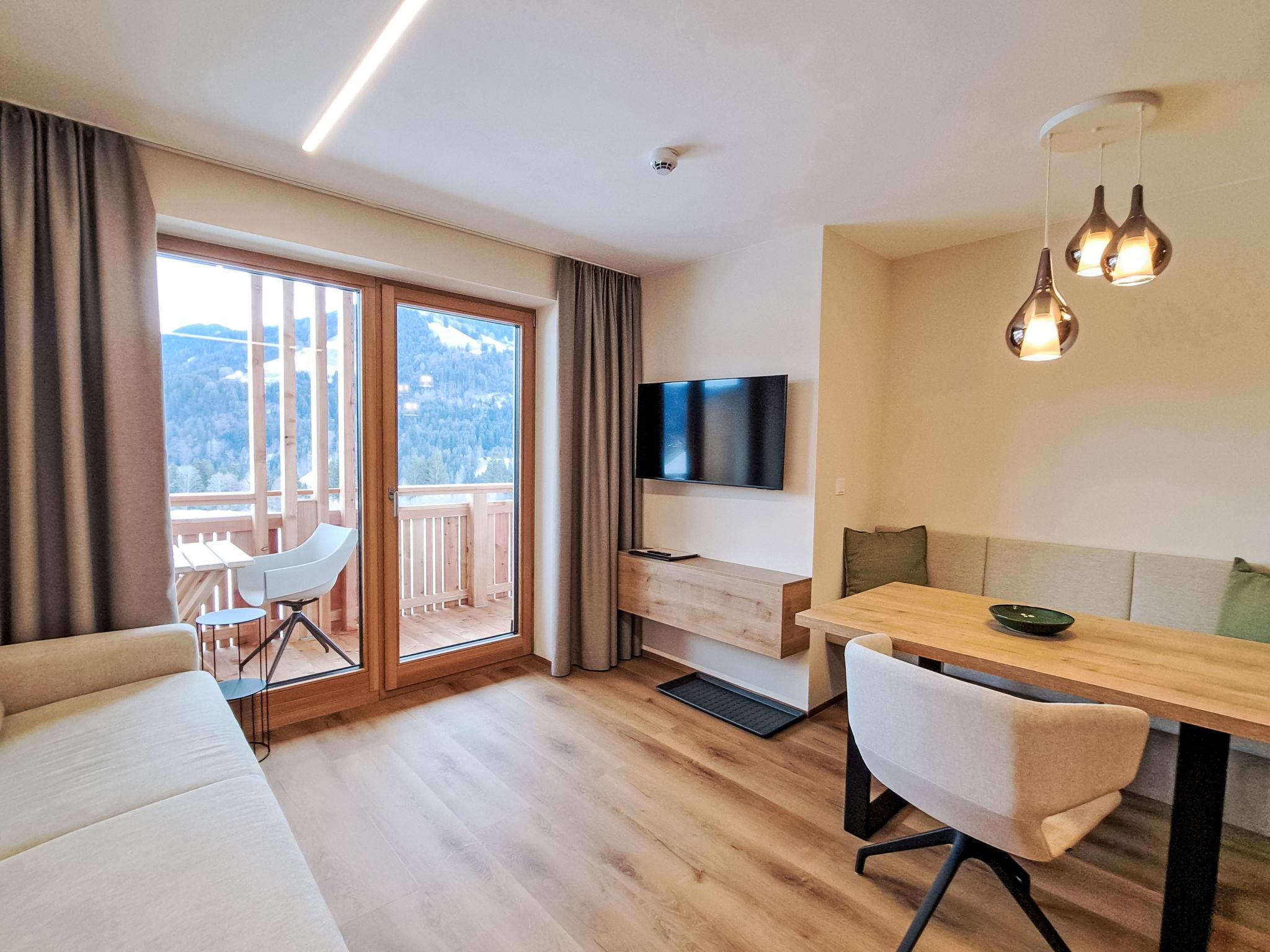 5-room apartment 125 m2. Very comfortable and tasteful furnishings: 3 double bedrooms, each room with satellite TV and flat screen. Exit to the balcony. Kitchen-/living room (oven, dishwasher, 4 ceramic glass hob hotplates, toaster, electric coffee machine) with 2 double sofabeds, dining table and flat screen. Exit to the terrace. Shower, shower/WC, sep. WC, Sauna. Heating. 2 balconies, terrace. Terrace furniture, balcony furniture, deck chairs. Very beautiful, of the mountains and the swimming pool. Facilities: children's high chair. Please note: non-smokers only. There is a rain shower in the bathroom!