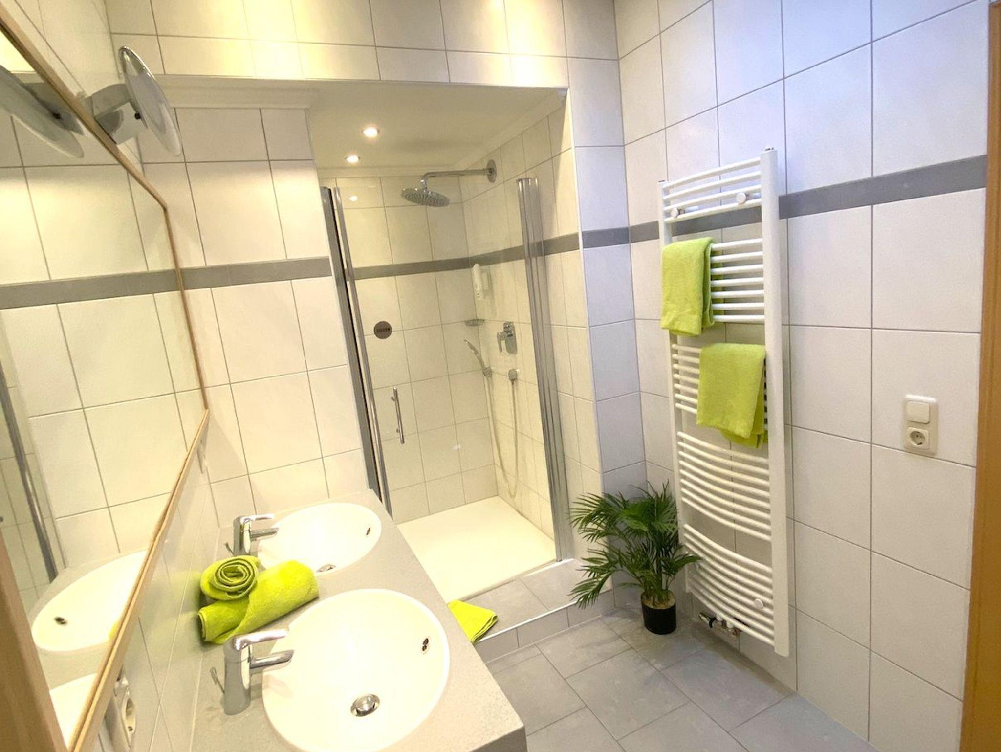 Das Badezimmer verfügt über Dusche/WC und einen Haarföhn. Kostenlosen WLAN-Zugang stellen wir Ihnen zur Verfügung. Sie haben außerdem die Möglichkeit, sich für nur EUR 10,-- pro Tag nach Verfügbarkeit ein Appartement zur Gartenseite zu sichern.