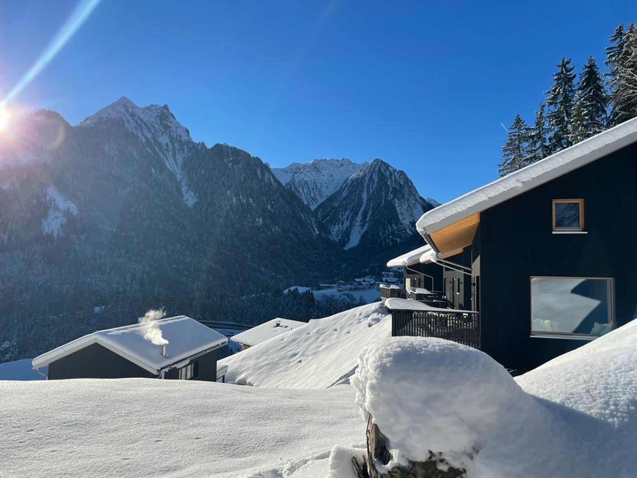Cabin Valbona ist das Chalet mit Panoramafenster in Richtung Norden mit Blick auf den Wald und die Berge des Walgau. Ausblick von der Terrasse auf das Brandnertal und Weitblick bis ins Klostertal.