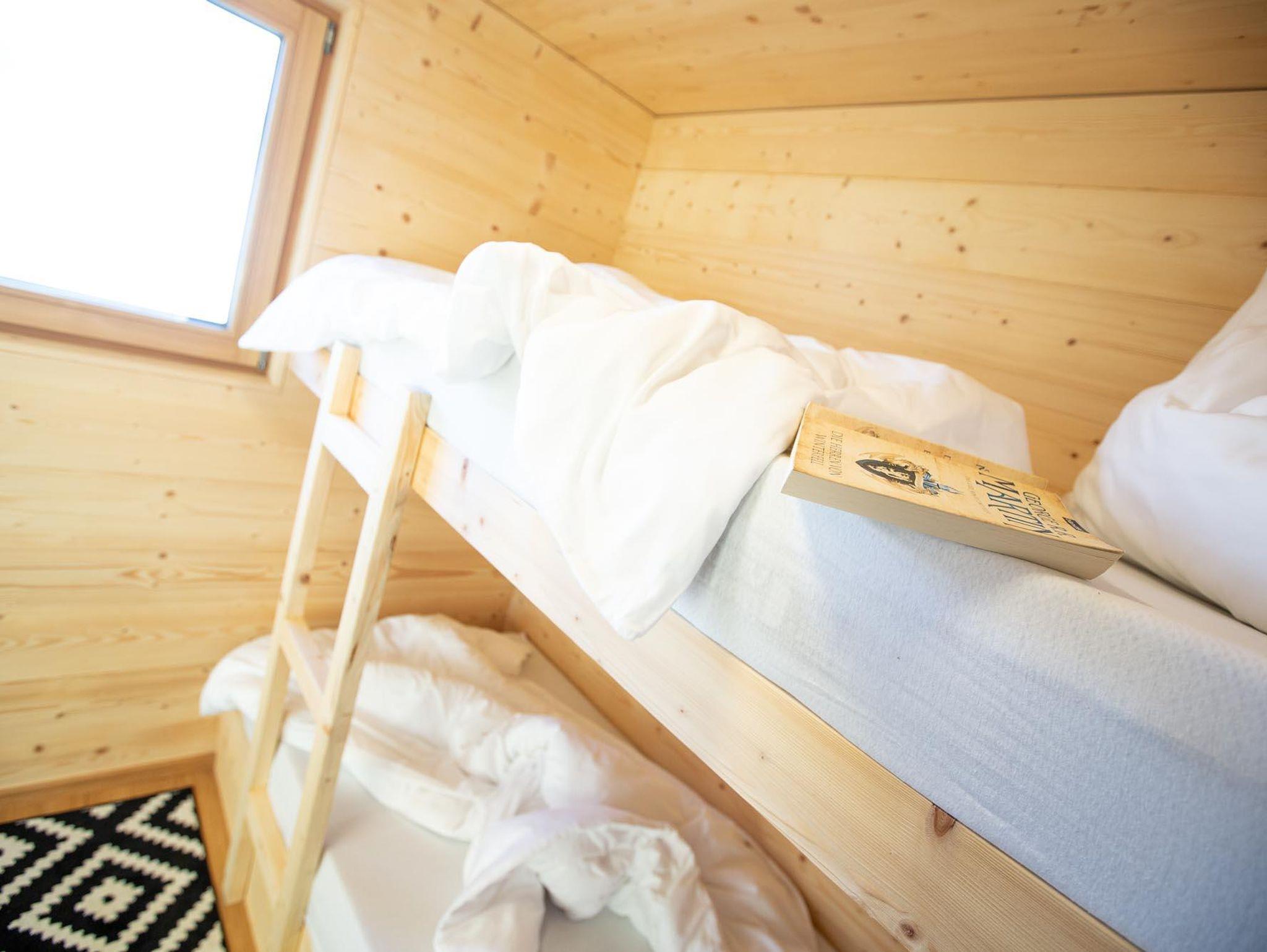 Das Bad ist mit einer Dusche inkl. Regenbrause, WC und einem Waschbecken ausgestattet. Himmlisch schlafen kannst du im separaten Zimmer mit Stockbett oder im Obergeschoss im Doppelbett mit Galerie.
