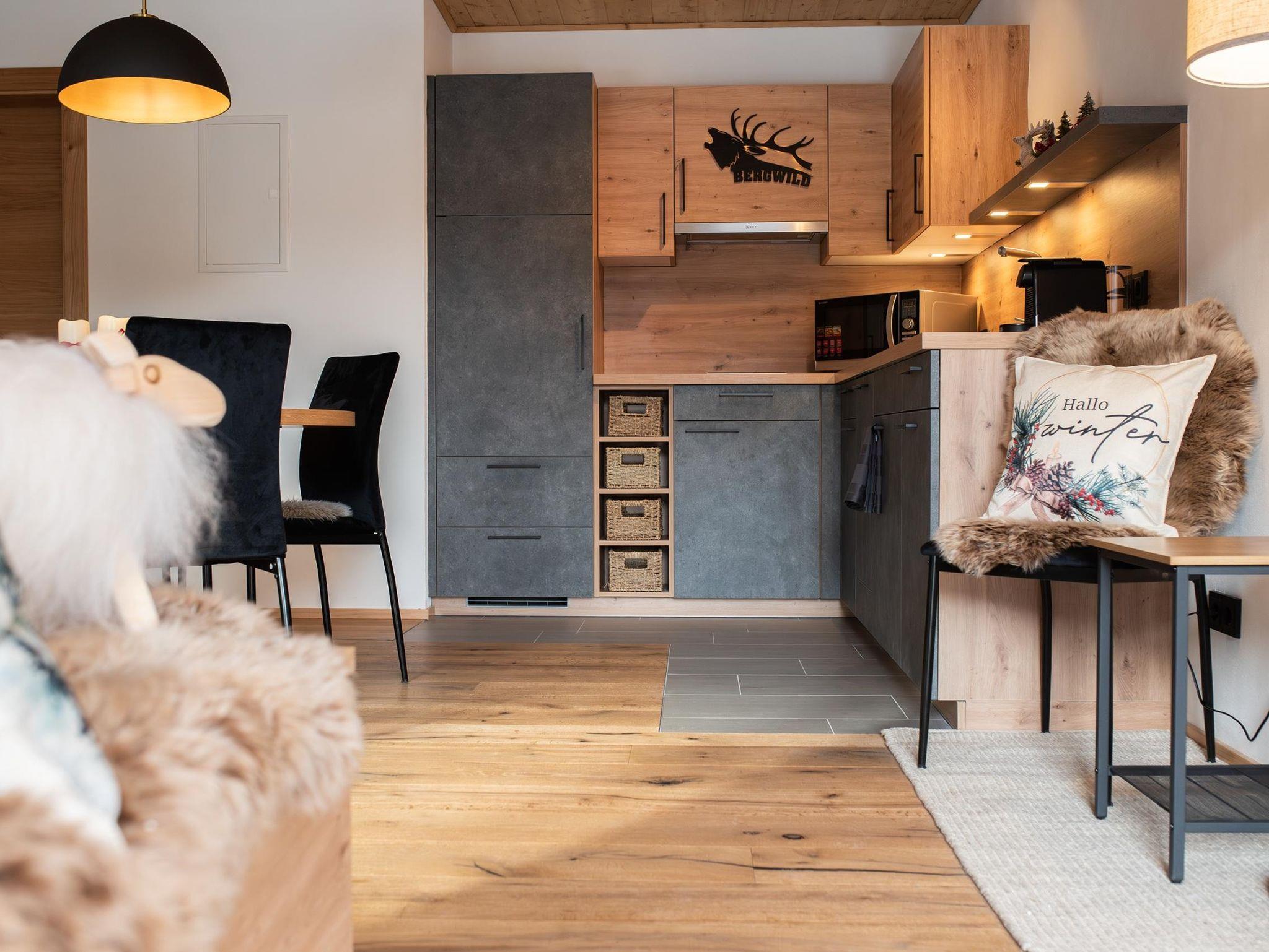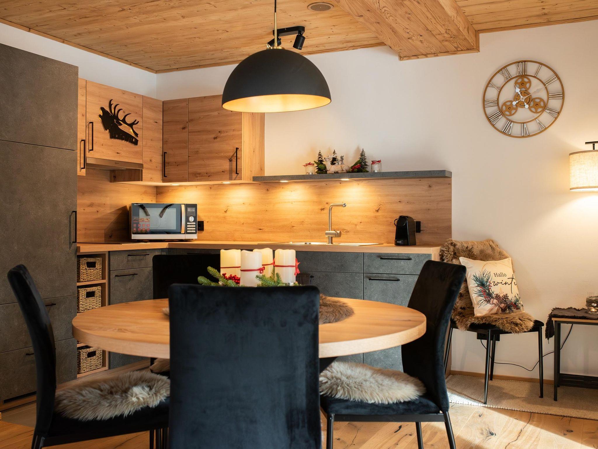 Der einladende Essbereich mit der anthrazitfarbenen Küche ist das behagliche Herz des gemütlichen Appartements Bergwild. Hier finden unter einem feinen hausgemachten Essen und bei einem guten Glas Wein schöne Gespräche statt, die Familie und Freunde einander näherbringen.
