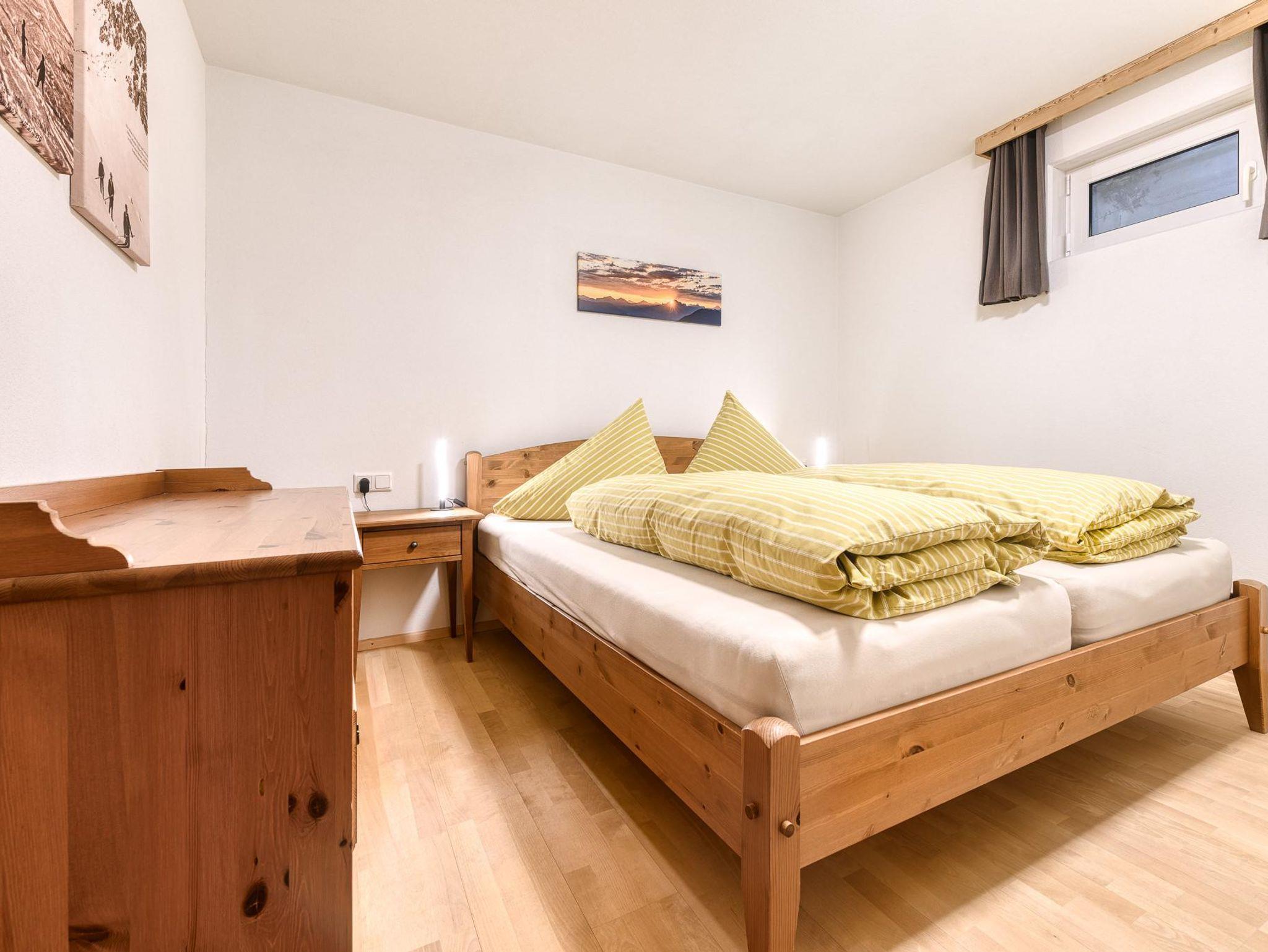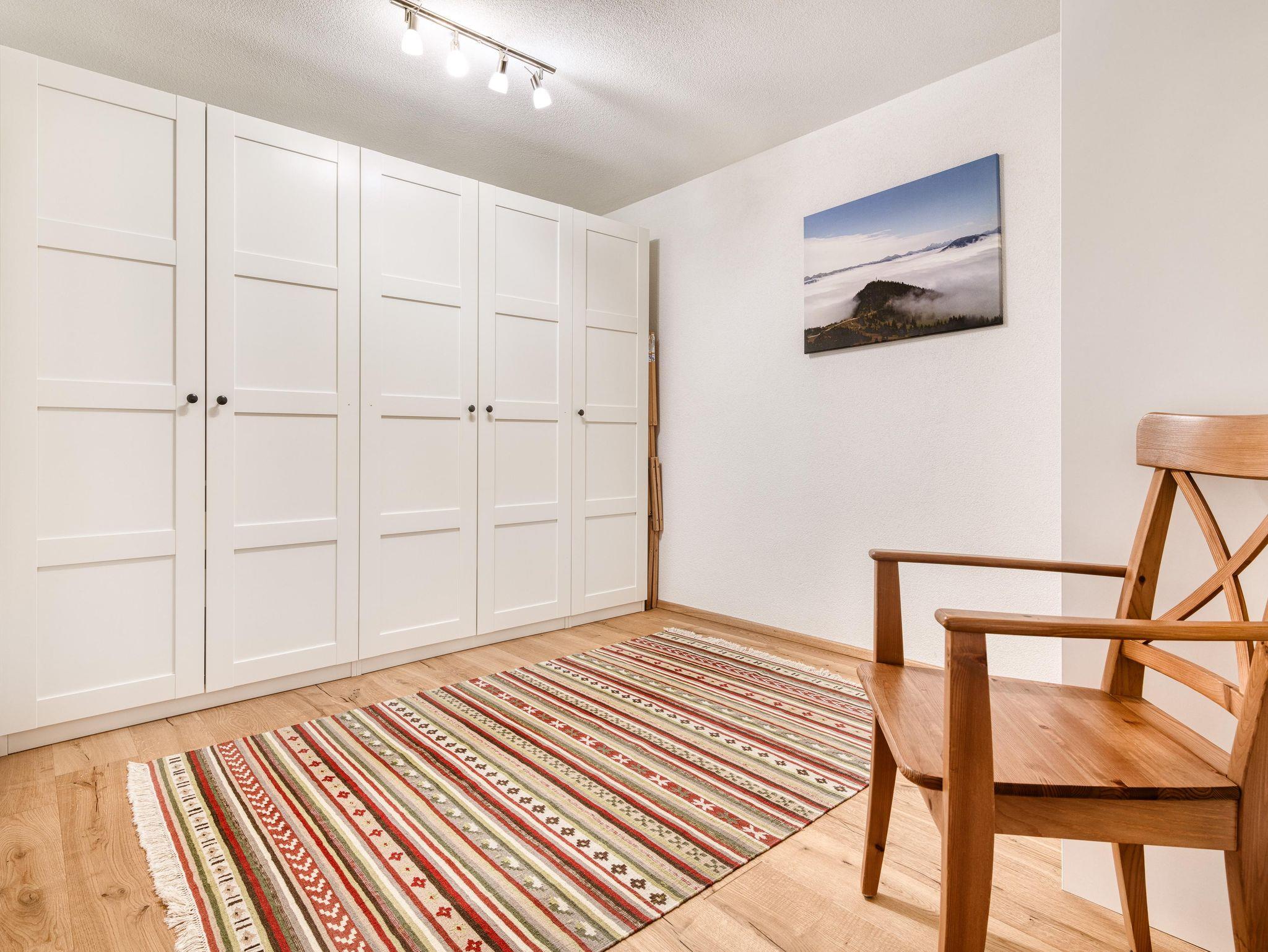 Zwei Schlafzimmer bieten jeweils ein Doppelbett und eine Kommode; zudem gibt es einen Ankleideraum mit großem Kleiderschrank und einem Zusatzbett. Ein modernes Badezimmer mit Dusche/WC ergänzt das Wohnangebot.