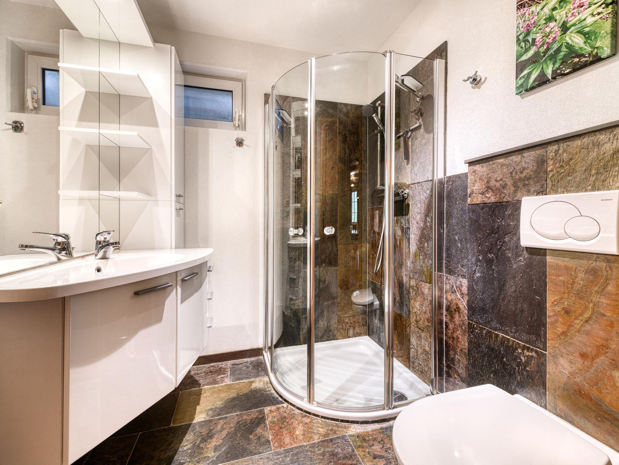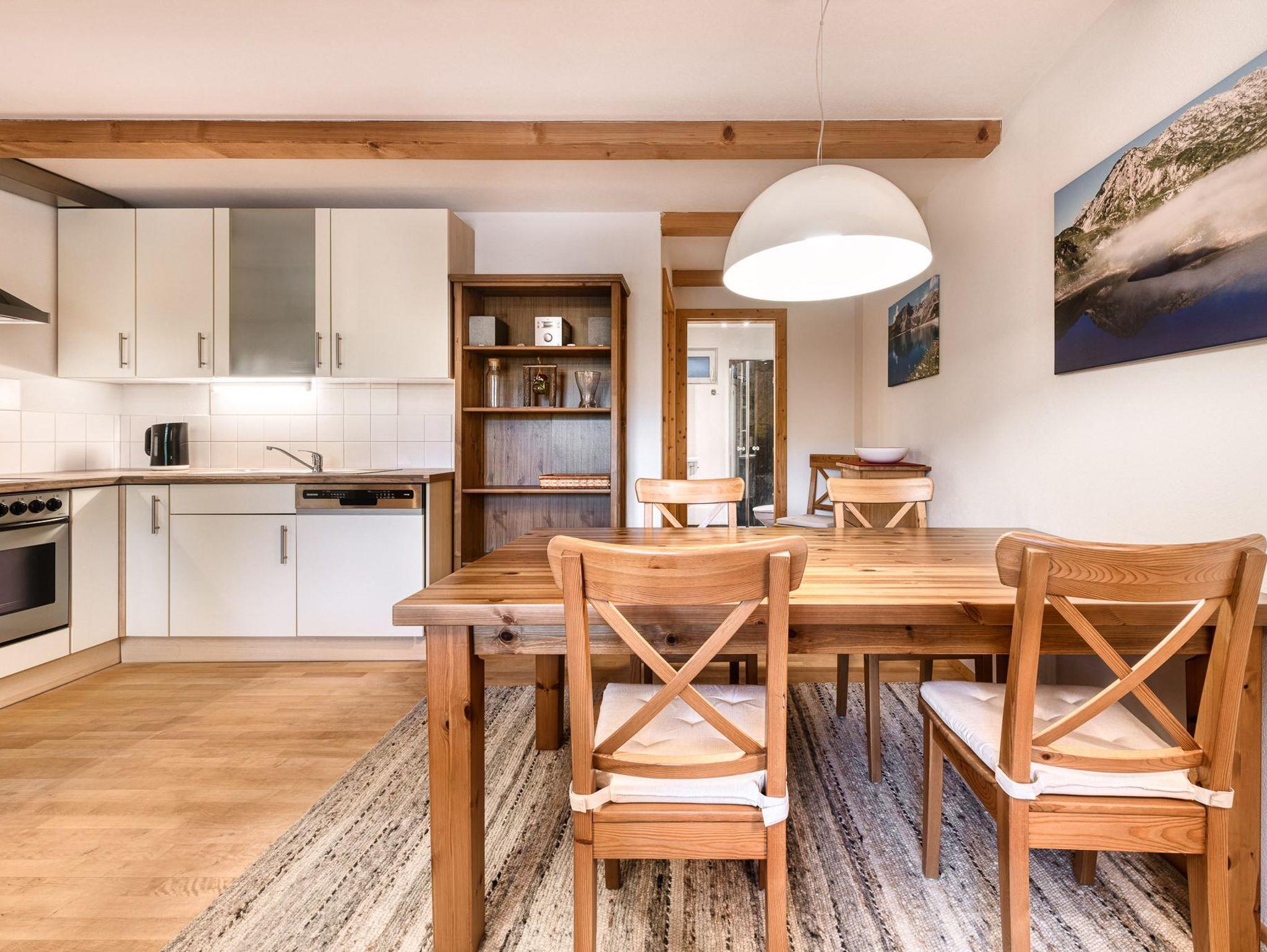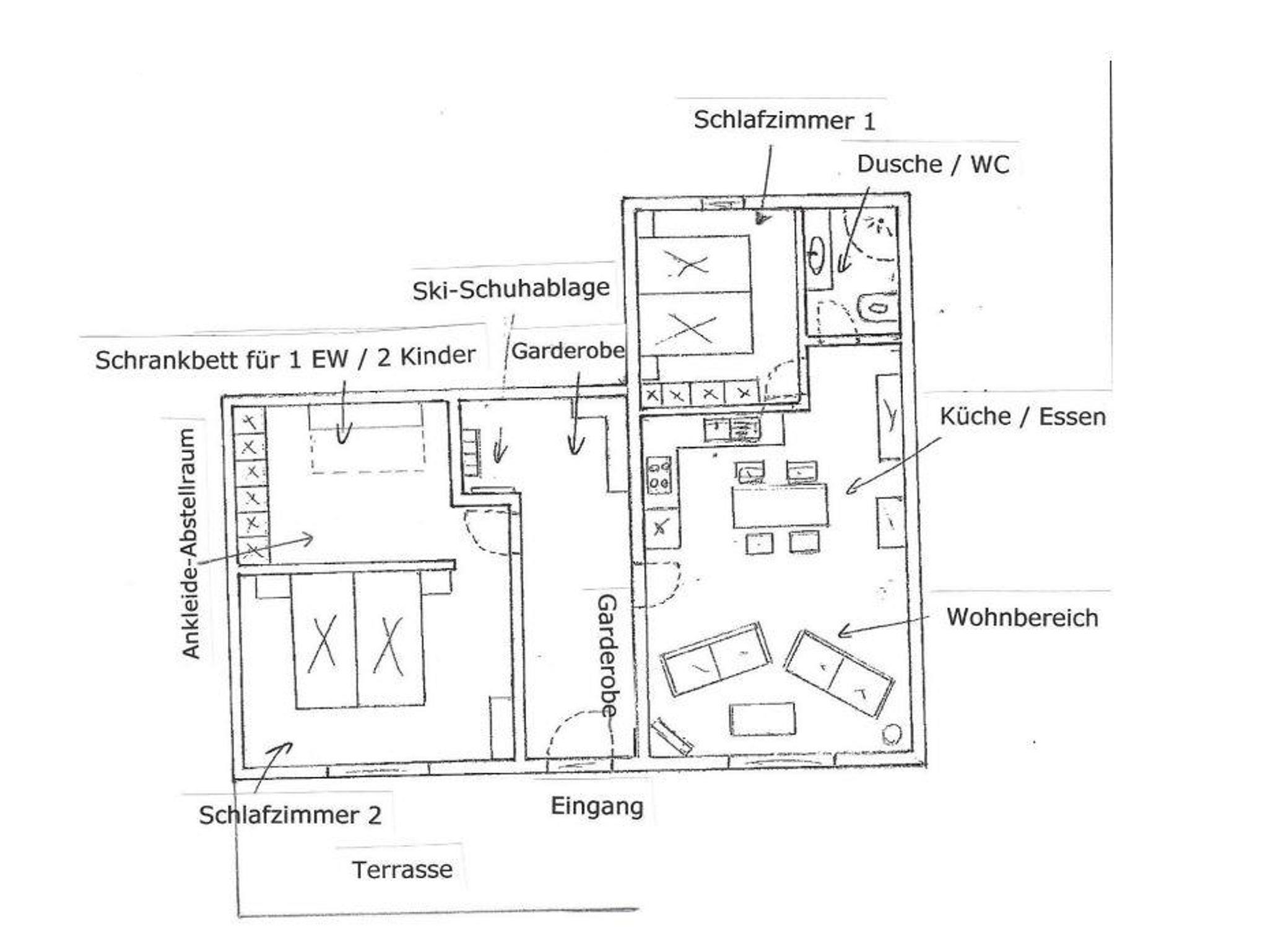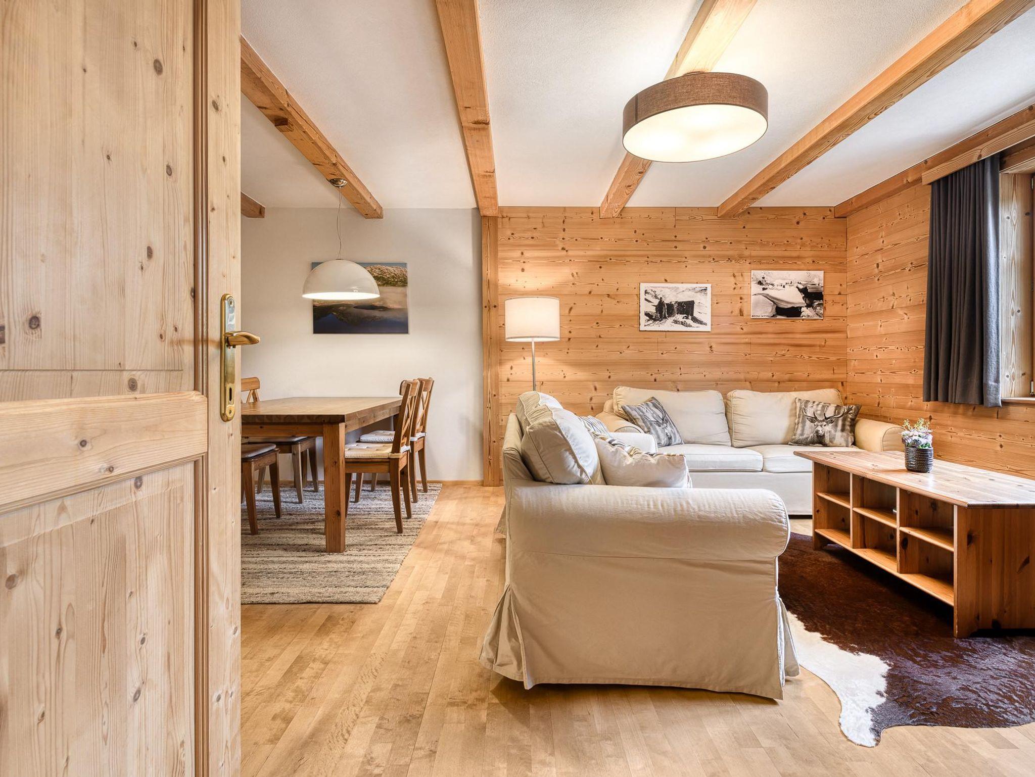Das Appartement verfügt über einen praktischen Eingangsbereich mit Garderobe und Schuhablage sowie eine Ski-Ecke mit Skischuhwärmer. Der Wohnraum ist offen gestaltet mit einer voll ausgestatteten Küche, einem Essplatz für sechs Personen und einem gemütlichen Wohnzimmer, komplett mit TV-SAT und WLAN.
