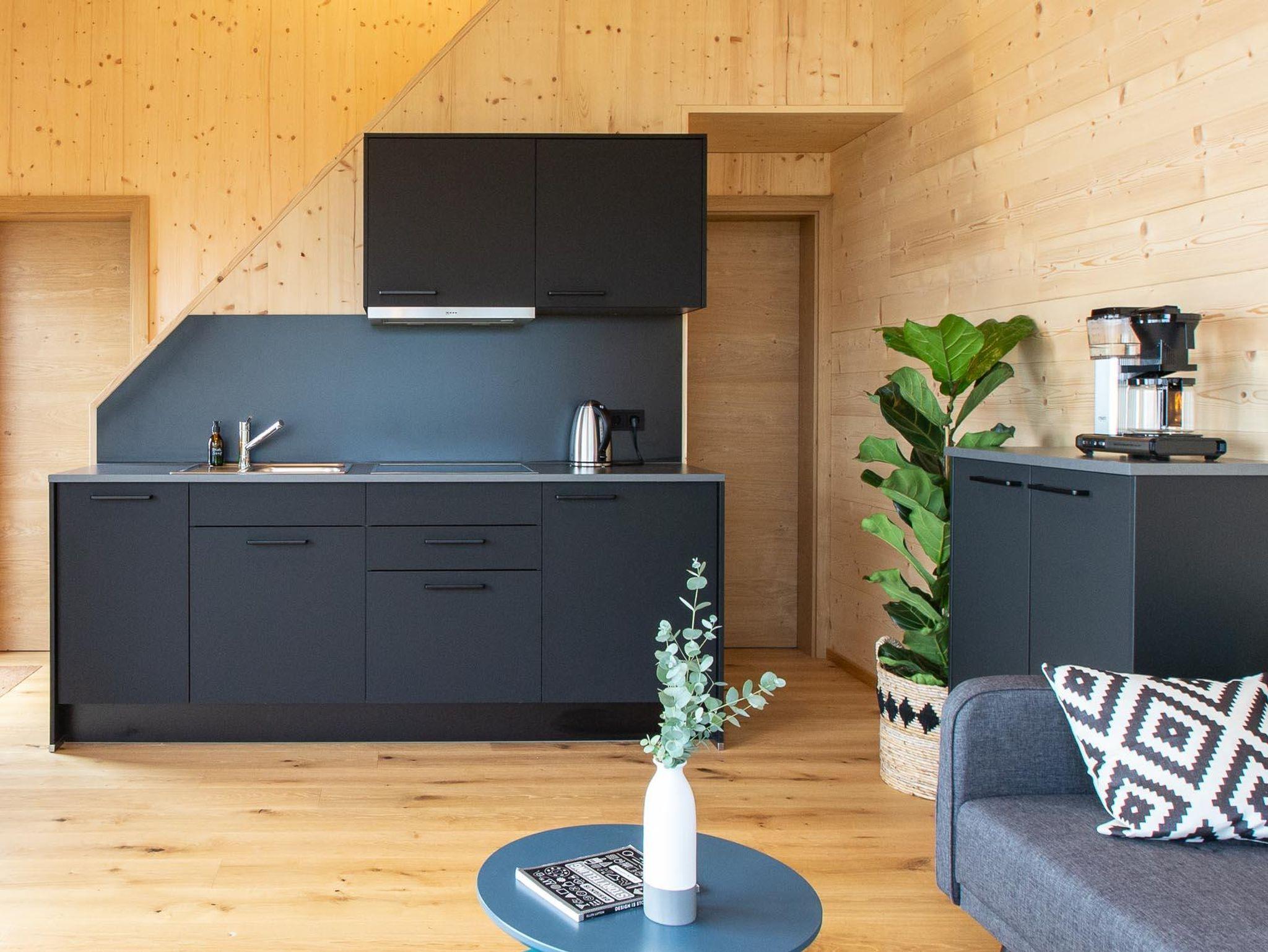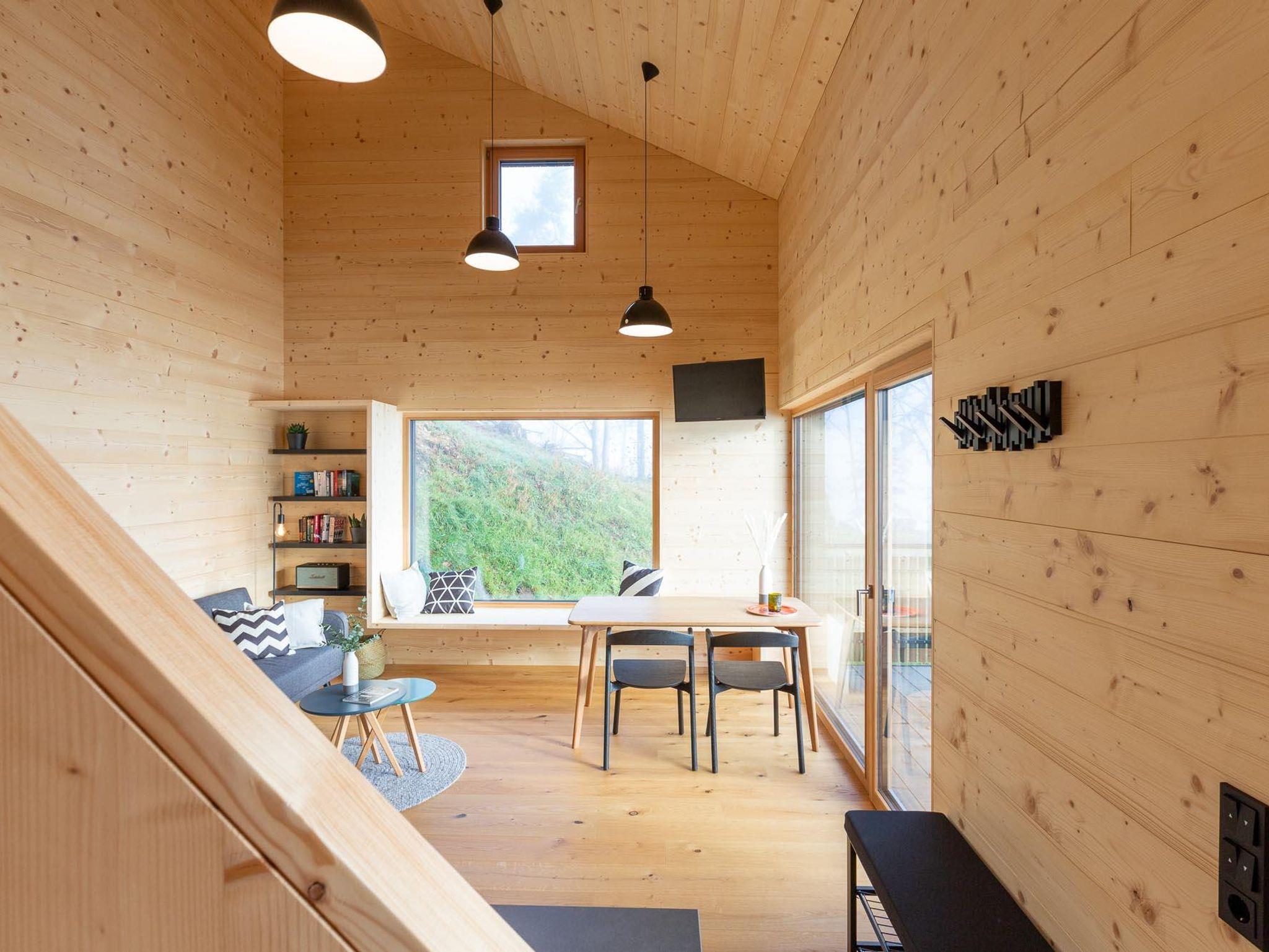 Im Erdgeschoss befindet sich in dem modern ausgestatteten Wohnbereich eine Küchenzeile, ein Esstisch mit Stühlen, ein TV, sowie eine gemütliche Couch. Am Panoramafenster mit Blick Richtung Süden kannst du es dir auf der Sitzbank gemütlich machen.