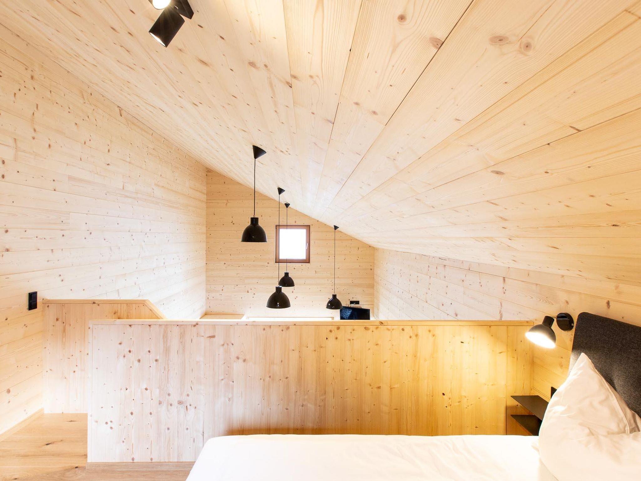 Im Obergeschoss befindet sich eine offene Galerie mit Doppelbett – ein Schlafplatz mit Fenster und Blick auf Natur und Berge.
