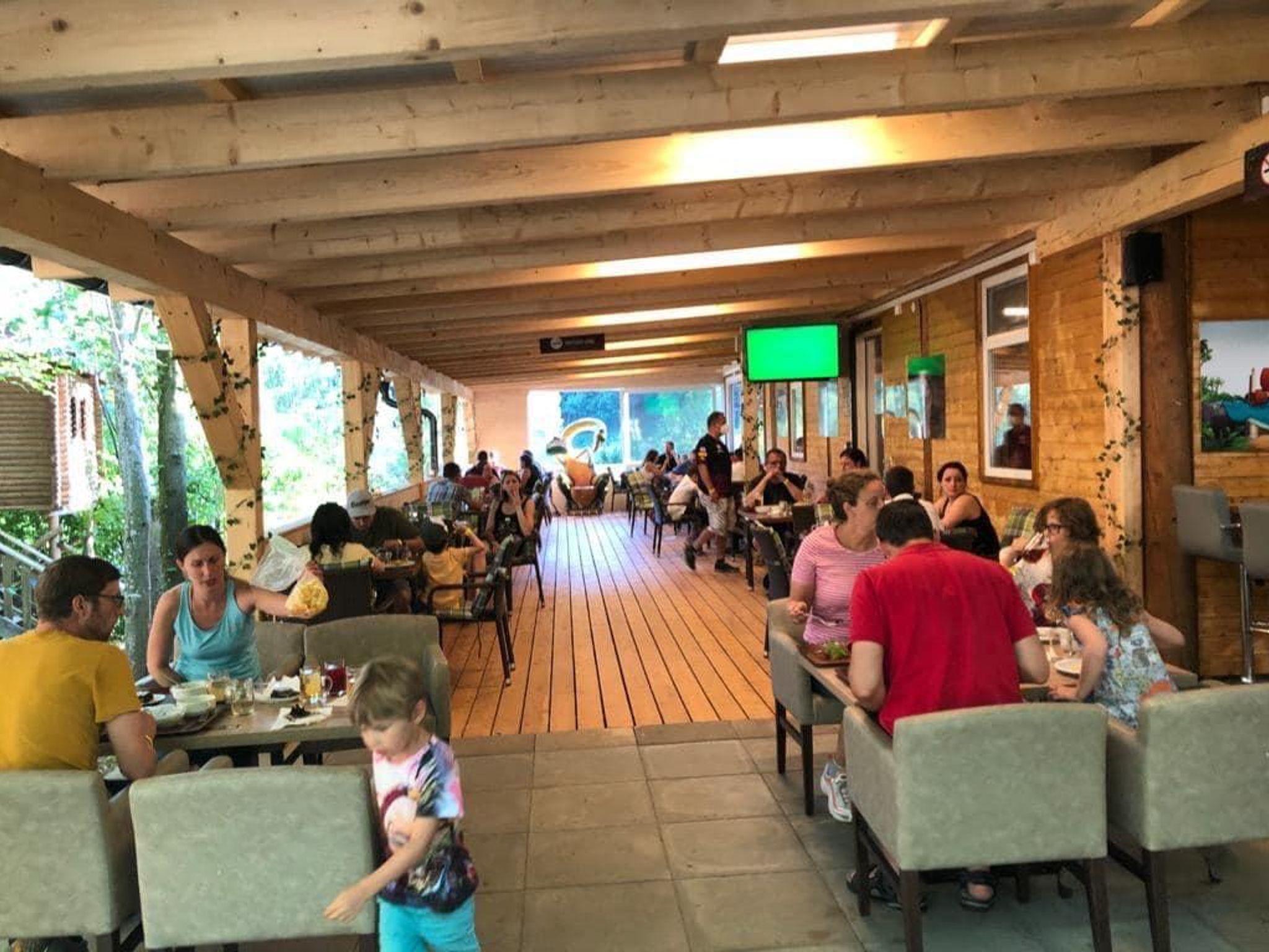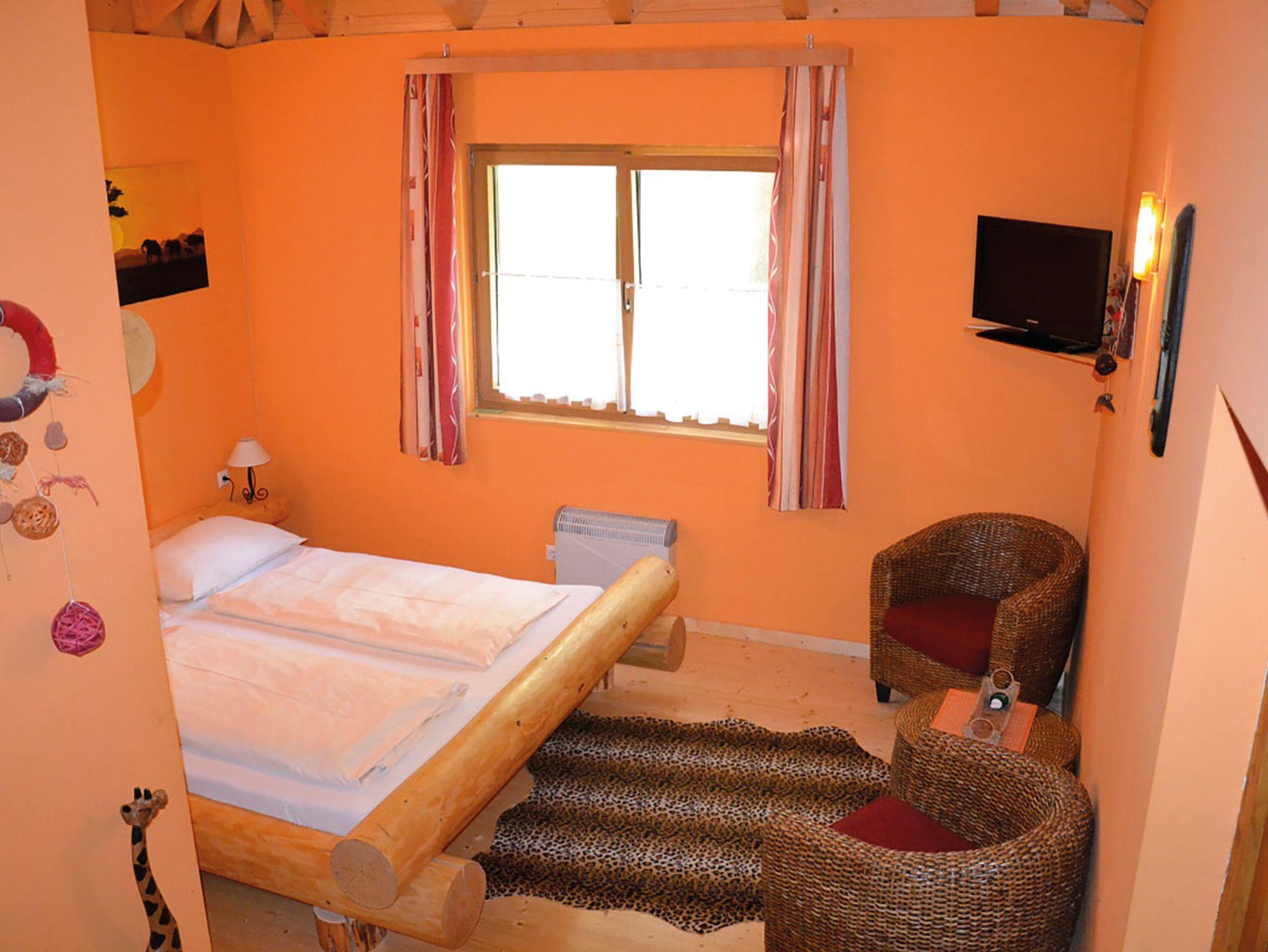 Das Baumhaus Afrika 2.4 befindet sich direkt neben dem Dinorestaurant und hat neben 2 Stiegenaufgängen auch einen Lift. Dieses Zimmer ist mit einem Doppelbett, einem Stockbett sowie einem Badezimmer mit WC, Dusche, Waschbecken als auch einem Kühlschrank sowie TV und einer kleinen Sitzecke und einer Terrasse ausgestattet.