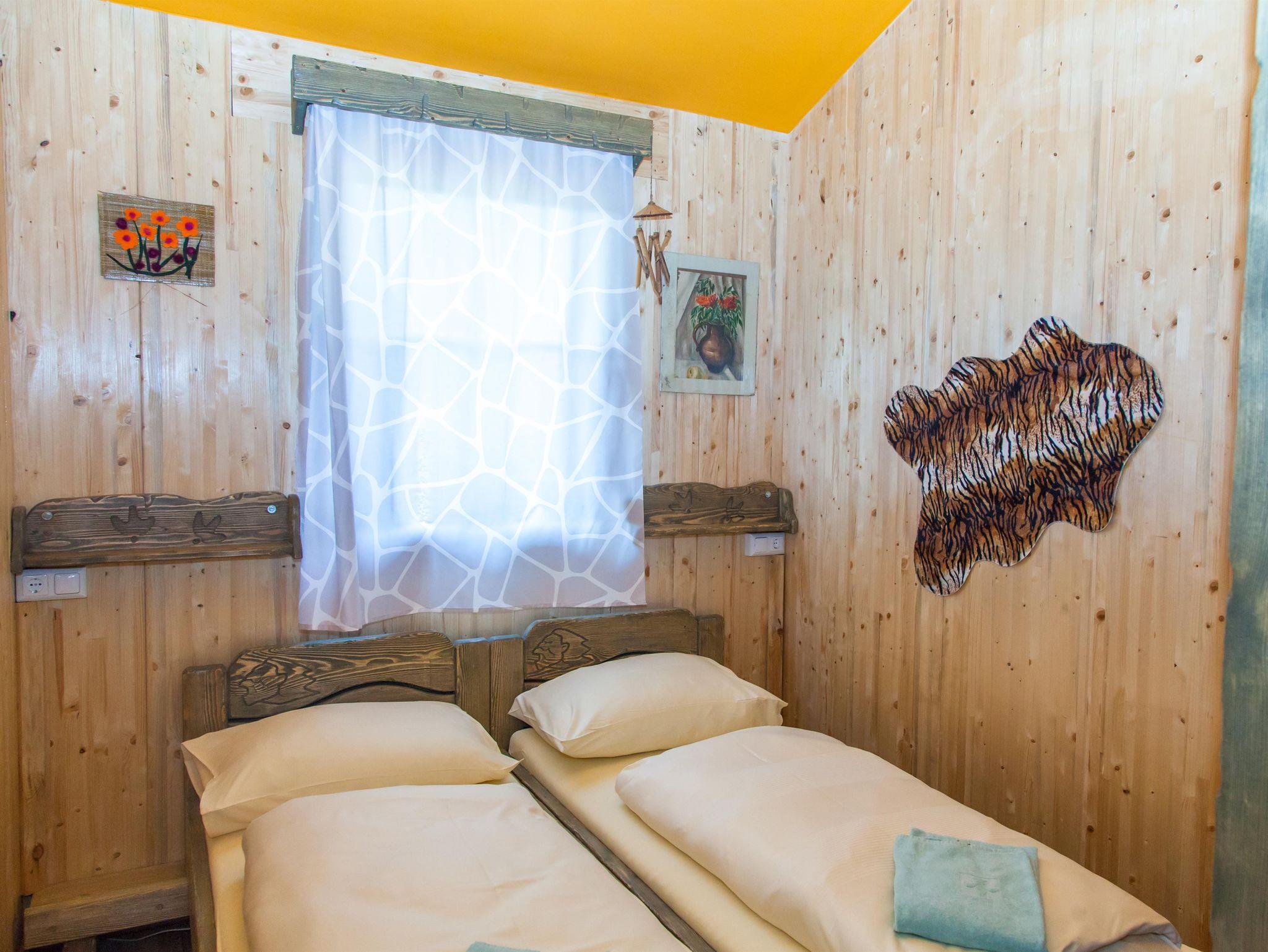 Im Baumhaus Neandertal können bis zu 6 Personen drinnen schlafen. Dieses ist mit 2 getrennten Schlafzimmern (1x Doppelbett und 2x Stockbett), einer handgeschlitzten Küche, einem Badezimmer mit WC, Dusche und Waschbecken sowie einem TV, einer Sitzecke, einer Außenterrasse und einem Lift ausgestattet und befindet sich direkt neben dem Dino-Restaurant.