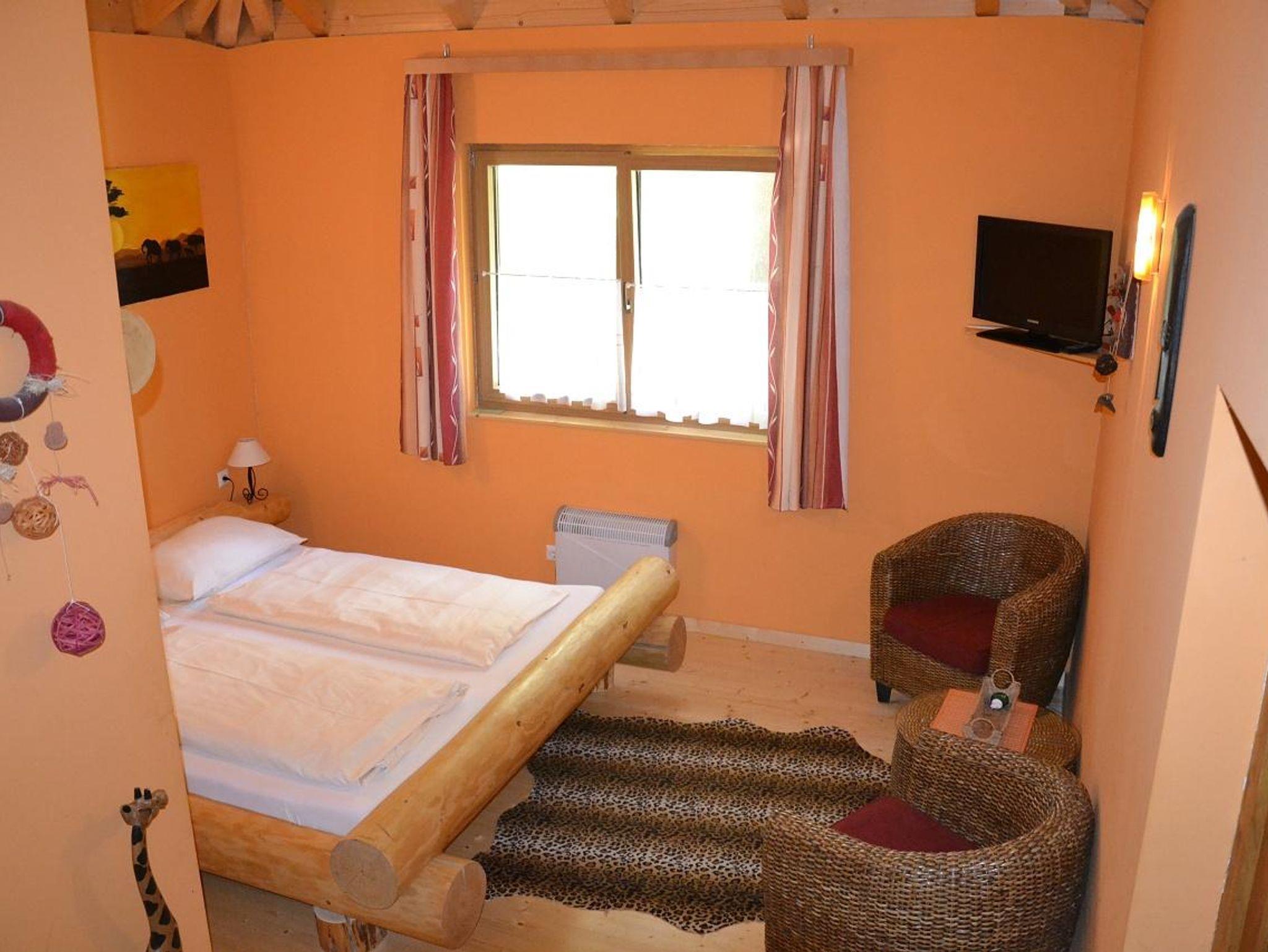 Das Baumhaus Afrika Classic befindet sich in 6 Metern Höhe samt Dusche, WC, Waschbecken, TV, Kühlschrank, Terrasse sowie einem Doppelbett, einem Stockbett (+ Möglichkeit auf ein Zusatzbett) direkt neben der hauseigenen Poolanlage mit Wasserrutsche.
