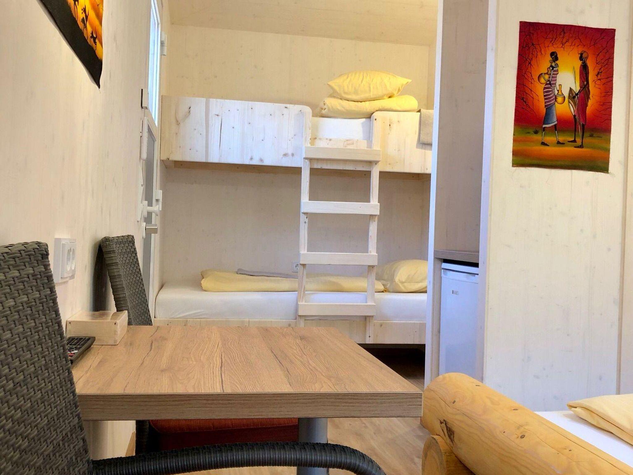 Das Baumhaus Afrika 2.4 befindet sich direkt neben dem Dinorestaurant und hat neben 2 Stiegenaufgängen auch einen Lift. Dieses Zimmer ist mit einem Doppelbett, einem Stockbett sowie einem Badezimmer mit WC, Dusche, Waschbecken als auch einem Kühlschrank sowie TV und einer kleinen Sitzecke und einer Terrasse ausgestattet.