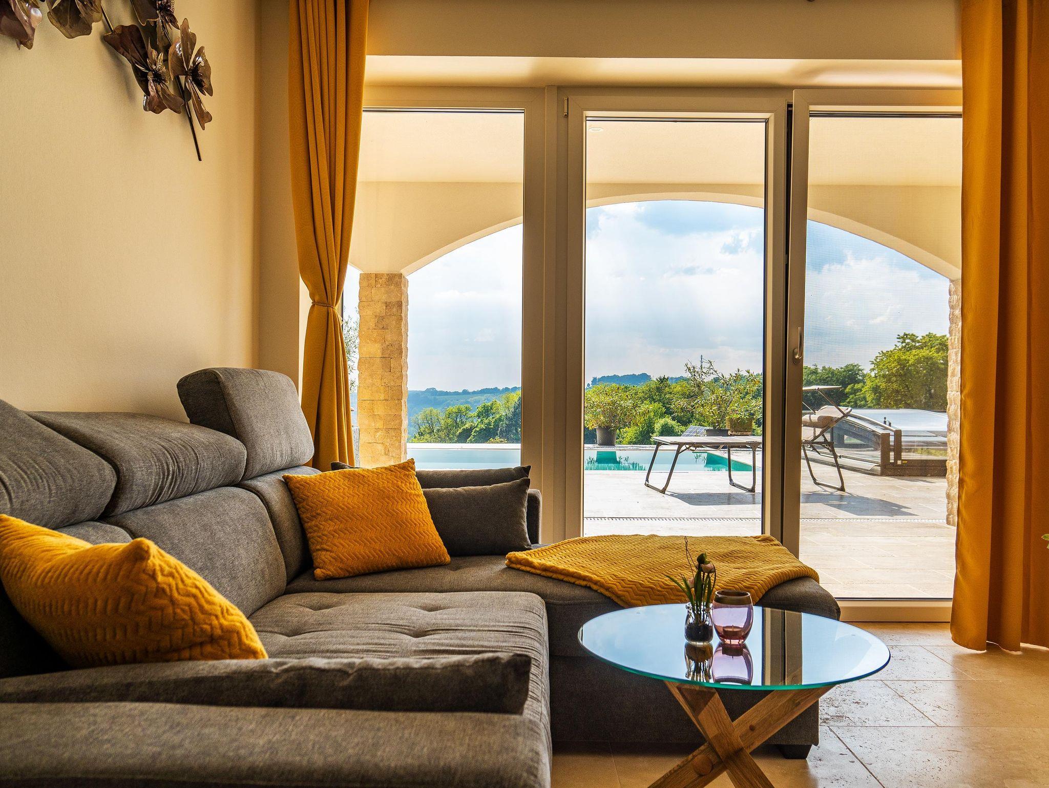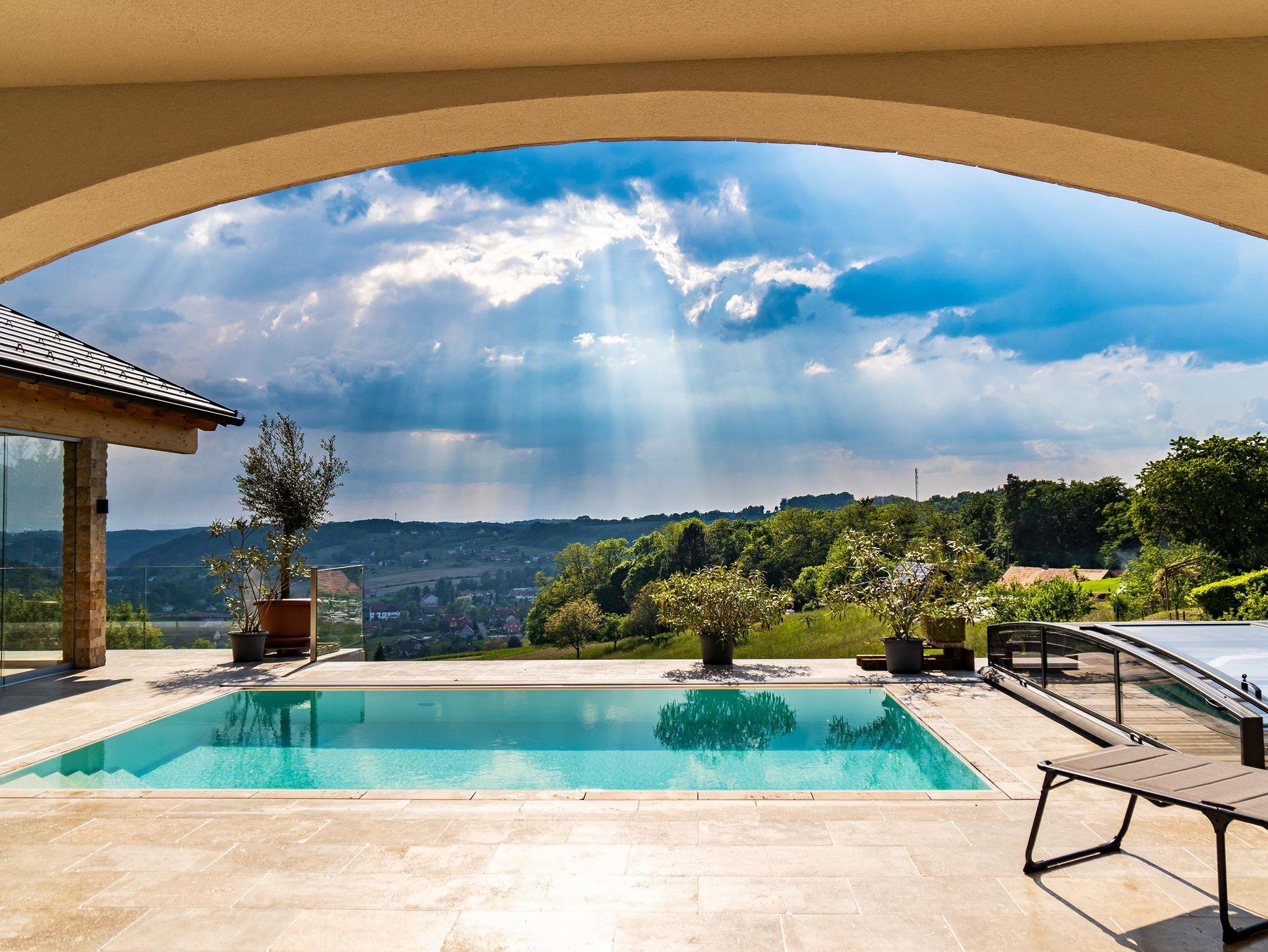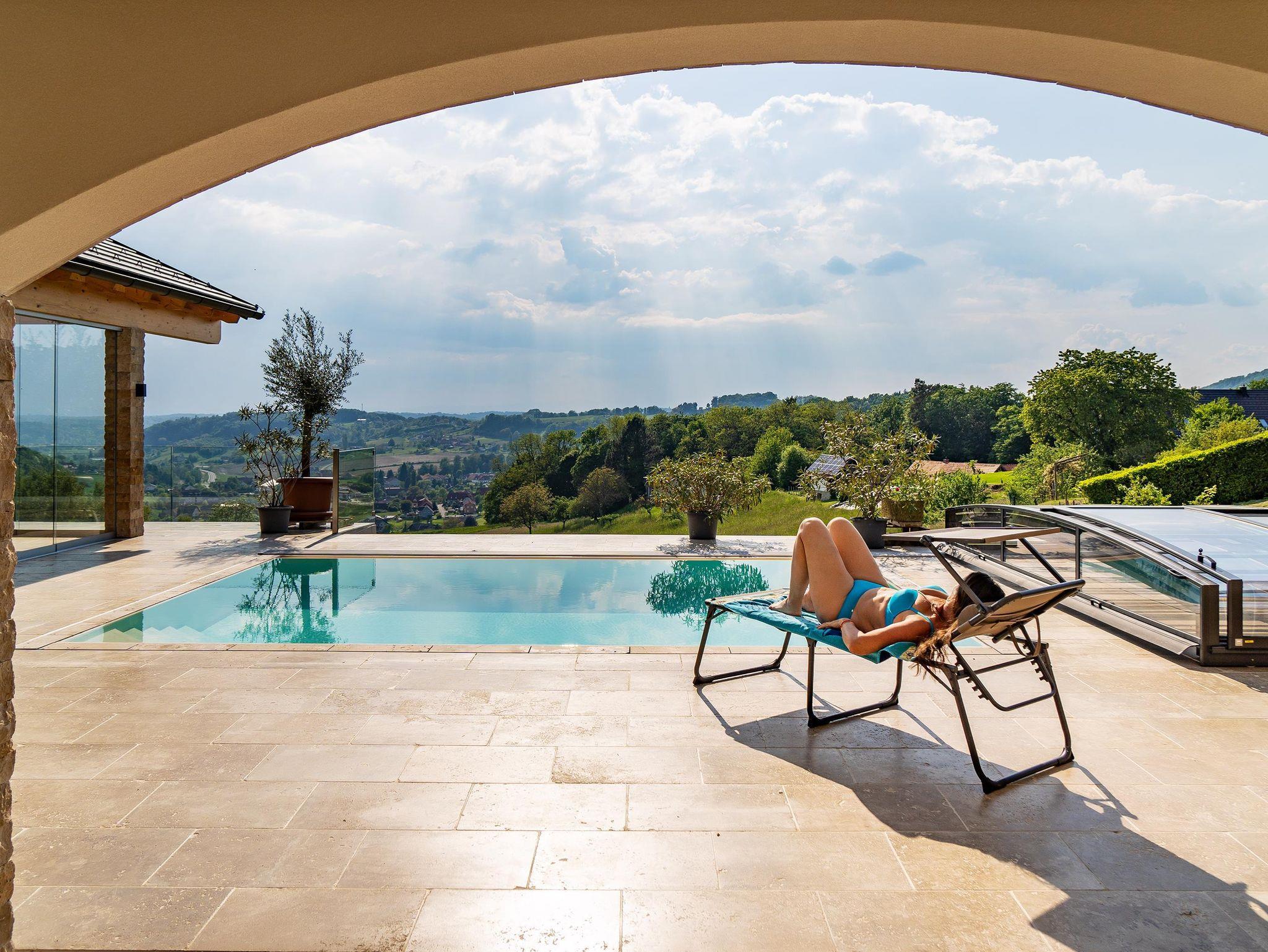 Schon beim Betreten verzaubern die großen Panoramafenster mit einem atemberaubenden Blick über den beheizten Salzwasserpool und die sanften Hügel des Thermen- & Vulkanlands – Abendstimmung inklusive.