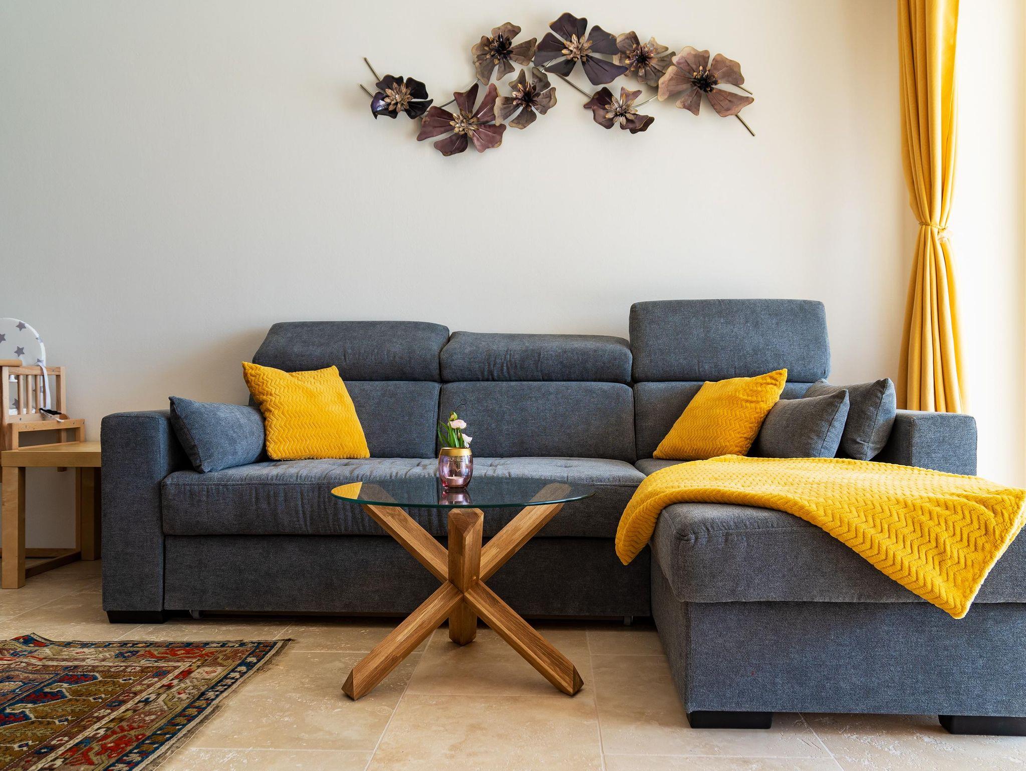 Für erholsamen Schlaf sorgt ein ruhiges Schlafzimmer mit Doppelbett. Im Wohnzimmer lädt eine komfortable Couch zum Entspannen ein, die sich im Handumdrehen in ein gemütliches Schlafsofa verwandeln lässt. Ideal für bis zu 4 Erwachsene oder 2 Erwachsene mit Kinderbett.