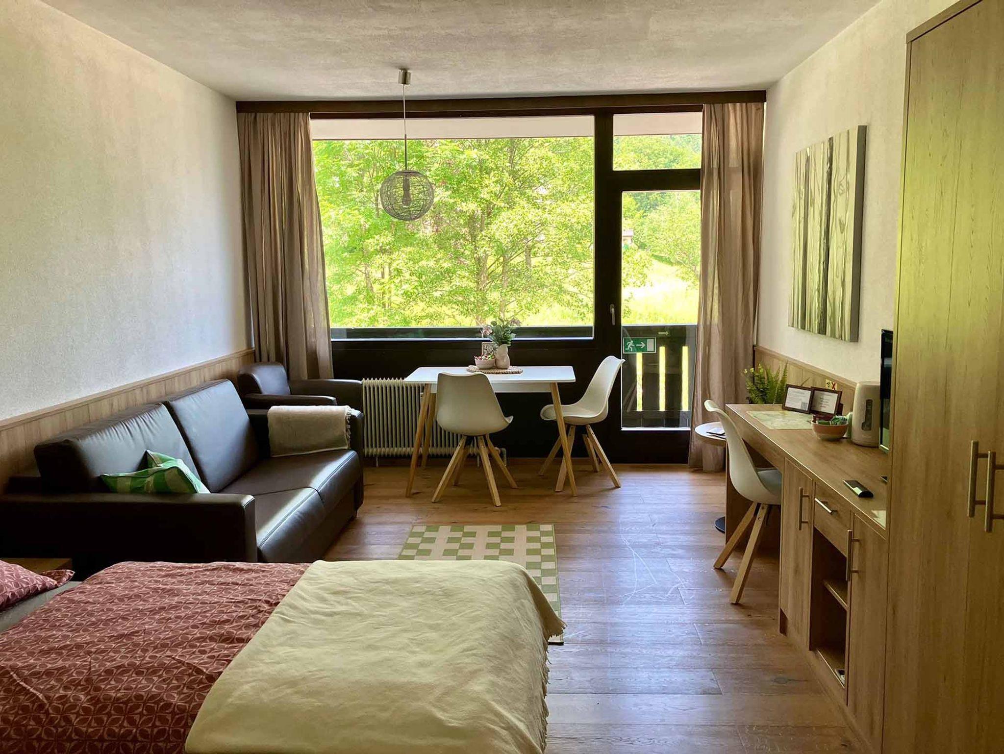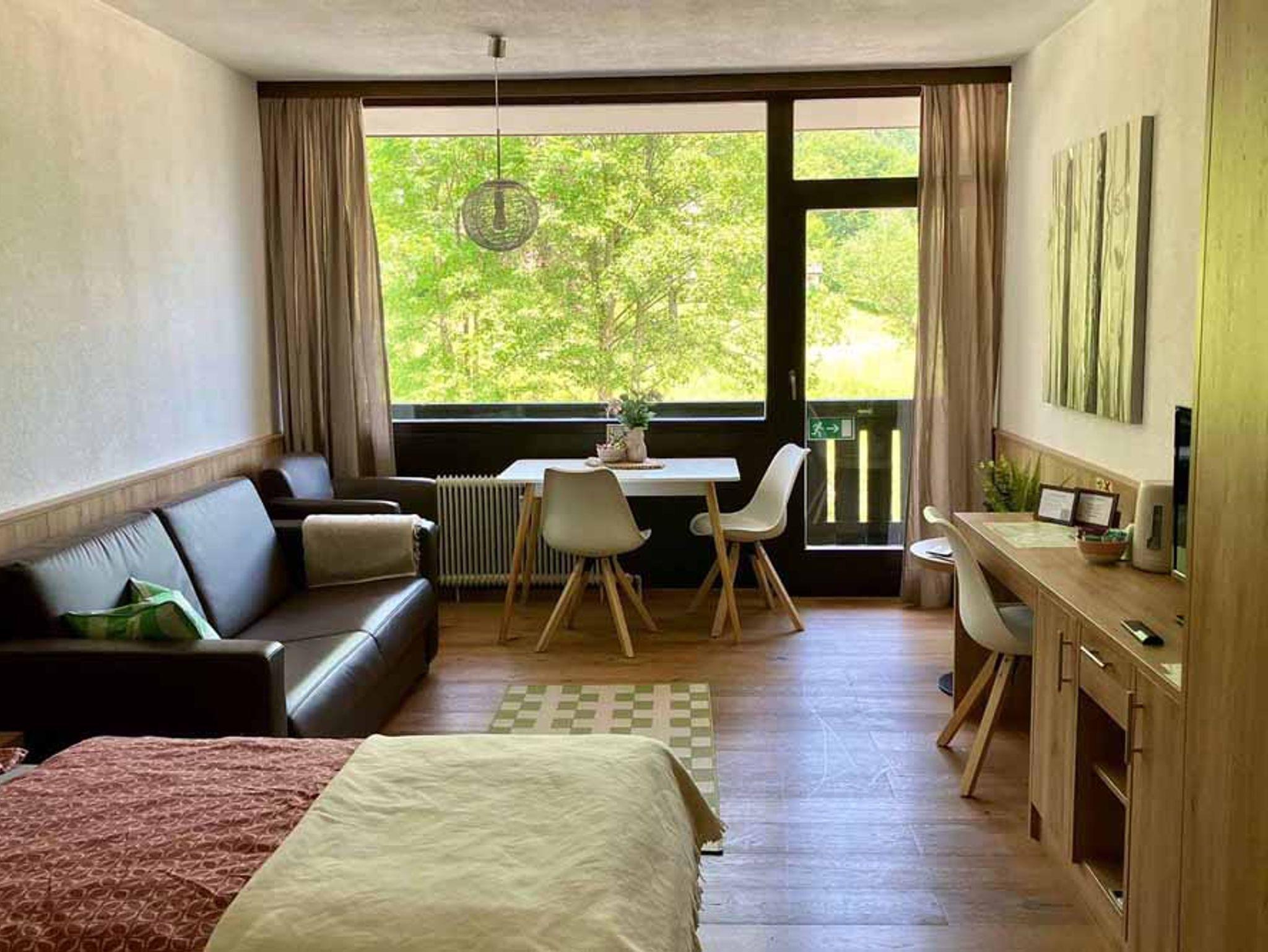 • 1 Wohn-/Schlafraum mit Doppelbett und Schlafsofa für bis zu 4 Personen