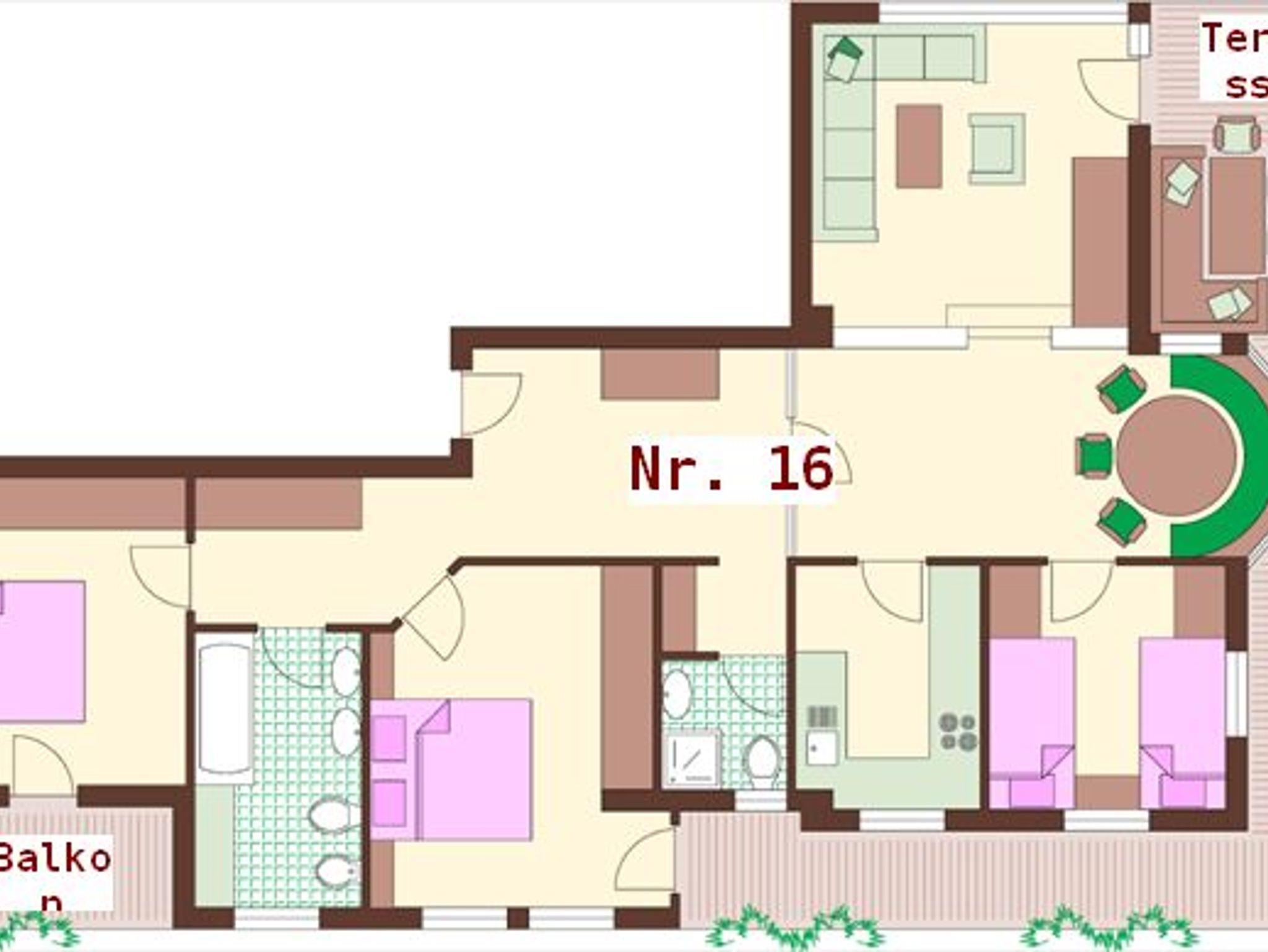 Die Wohnung verfügt über eine Diele, Bad/WC, 1* oder 2*Dusche/WC, 3 Schlafzimmer, eine komplett eingerichtete Küche (auch mit Backrohr) gemütliche Essplatz, einen großzügigen Wohnraum mit Sitzgarnitur (2 Sofabetten) und hat einen großen Balkon oder