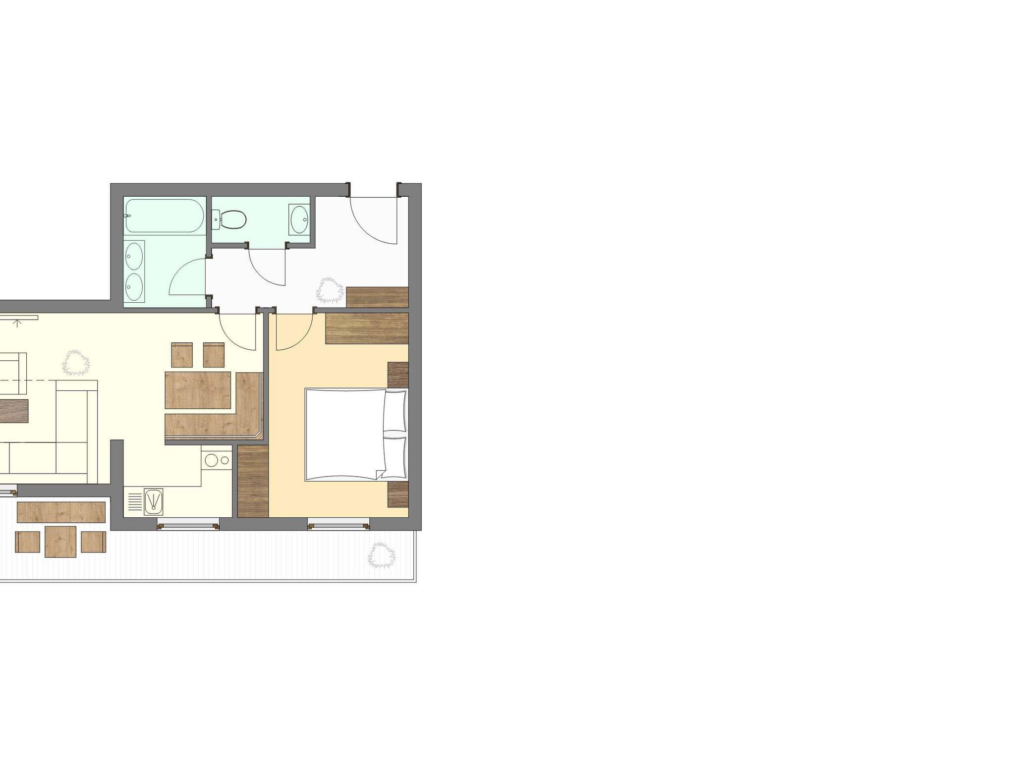 Geräumiges Appartement - 45 m² - mit einem eigenen Schlafzimmer mit Doppelbett. Im Wohnzimmer befindet sich eine Doppelbettcouch, die Küche mit Geschirrspüler, gemütliche Essecke, Badezimmer mit Dusche, WC separat, großer möblierter Balkon.