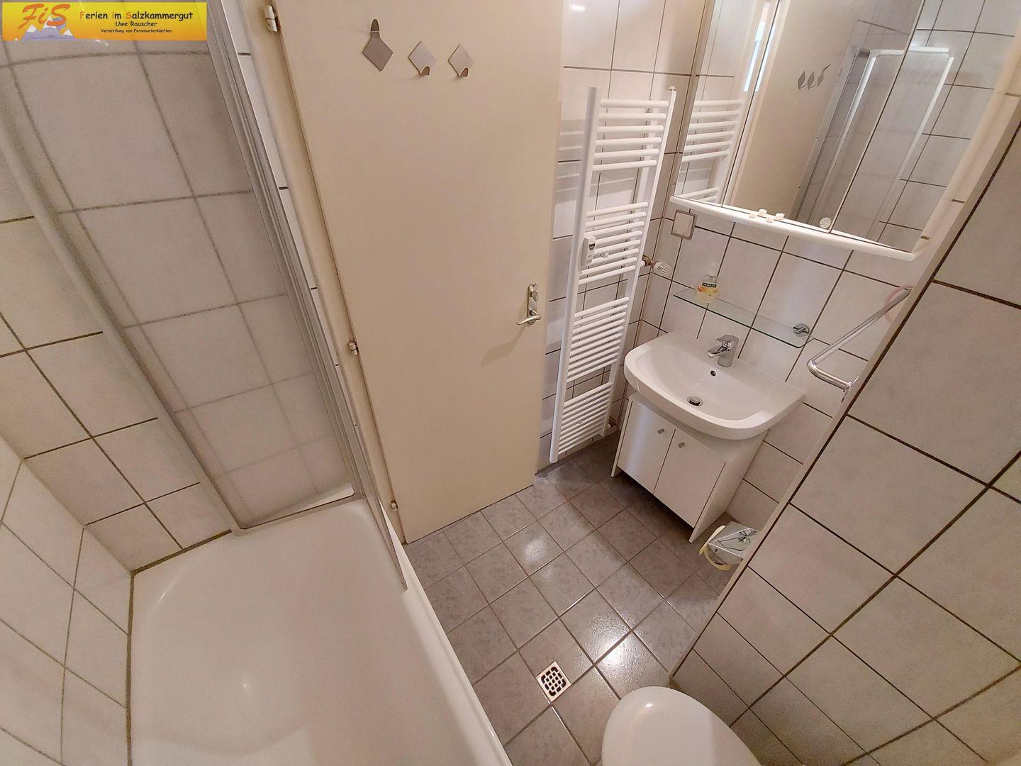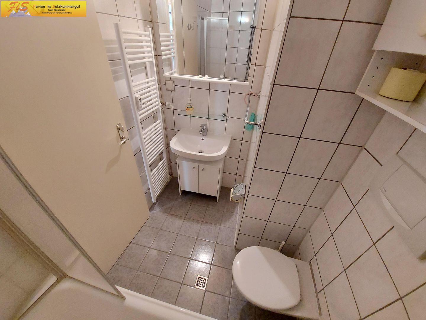 Das Badezimmer bietet neben einer Dusche mit Badewanne ein Waschbecken, ein WC und eine umfangreiche Erstausstattung an Pflegeprodukten wie Seife sowie einen Haartrockner.