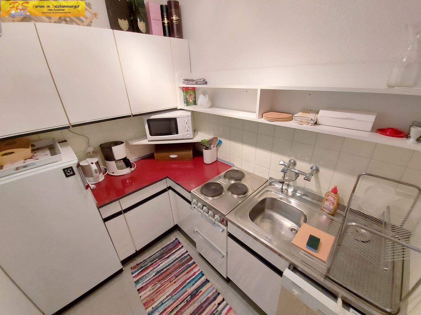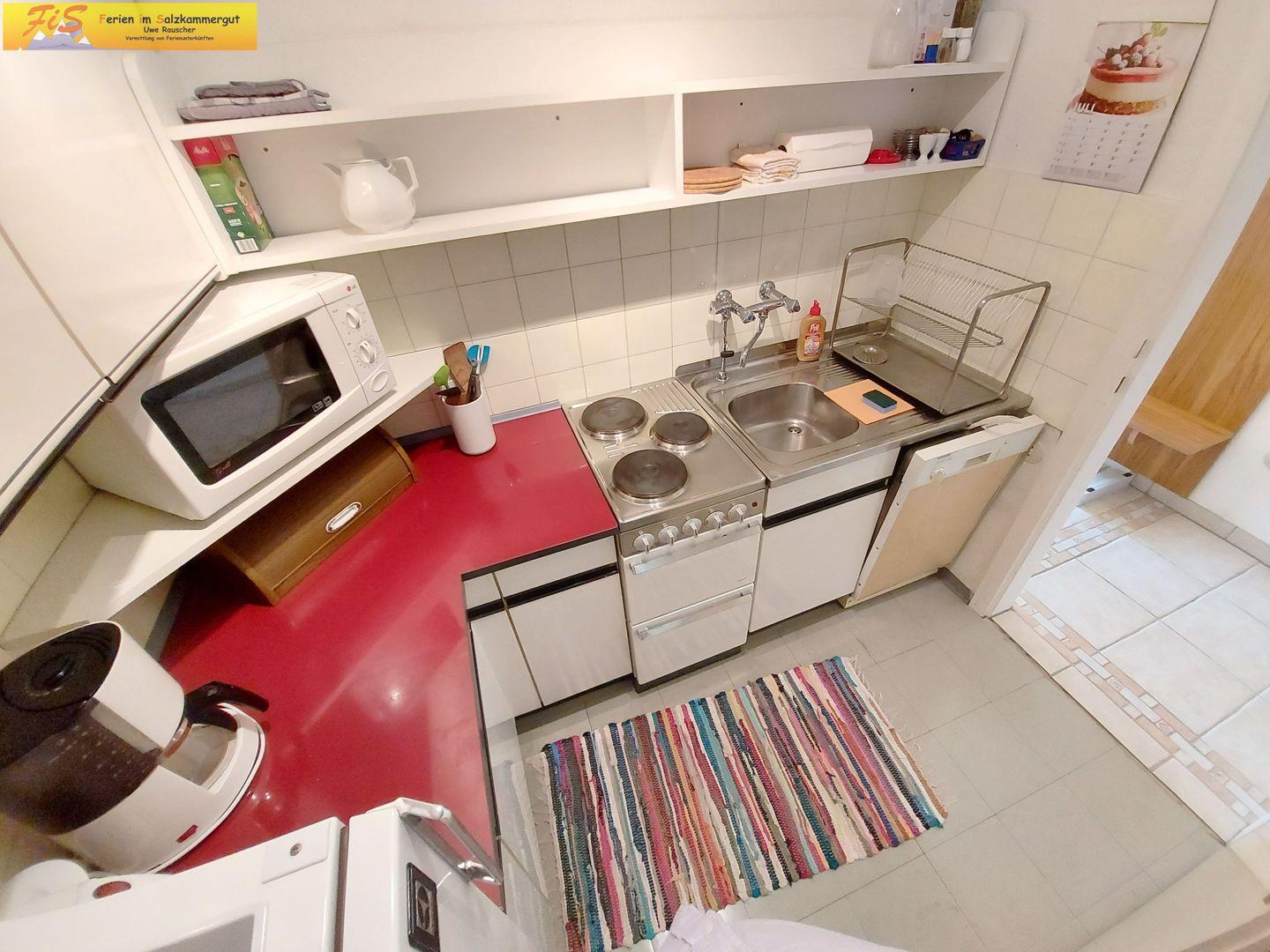 Die komplett geschlossene Küche ist separat gelegen und umfassend ausgestattet: Ein 4-Platten-Herd, Backofen mit Elektroanschluss, Kühlschrank mit Gefrierfach, Spülmaschine, Mikrowelle, Kaffeemaschine, Wasserkocher, Toaster sowie Geschirr und Besteck stellen eine komfortable Selbstversorgung sicher. Küchenutensilien und Geschirrhandtücher sind ebenso vorhanden wie ein Esstisch mit ausreichend Sitzmöglichkeiten. Bettwäsche, Handtücher, Haartrockner und Badausstattung werden bereitgestellt, sodass Sie Ihren Aufenthalt sorgenfrei genießen können.