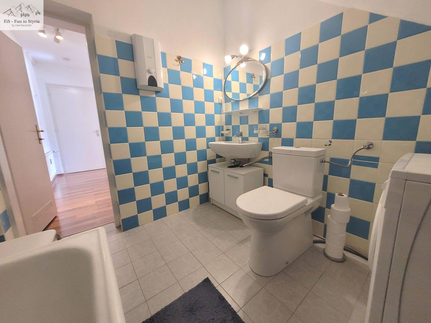 *Bitte beachten Sie, dass sich das Badezimmer unter einer Dachschräge befindet und somit das Duschen im Stehen nur für kleinere Personen möglich ist!*