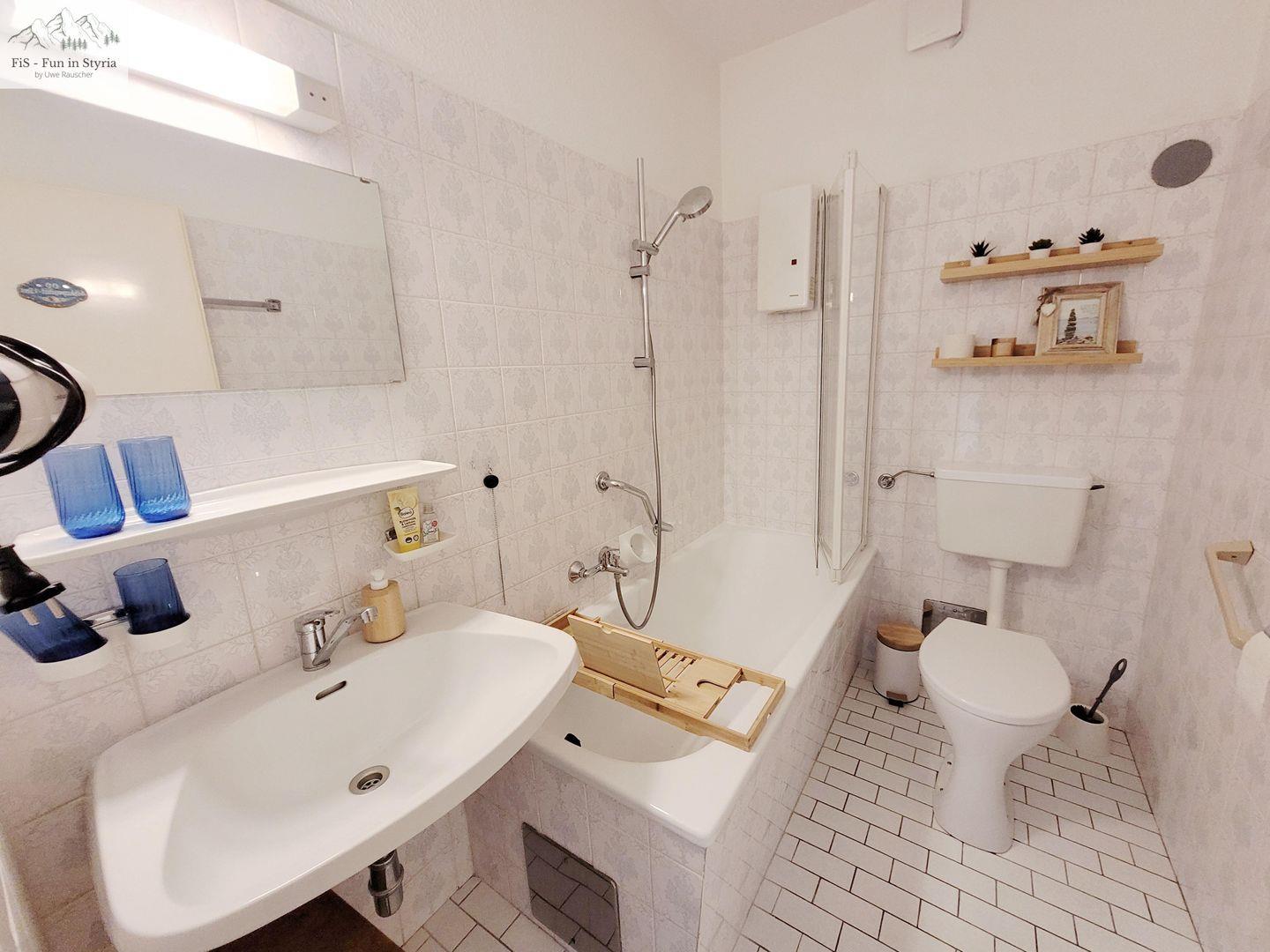 Die Badezimmerausstattung umfasst eine Dusche mit Badewanne, ein WC, ein Waschbecken sowie Handtücher und einen Haartrockner, um Ihren Aufenthalt so angenehm wie möglich zu gestalten. Darüber hinaus sorgt ein Rauchmelder für zusätzliche Sicherheit.