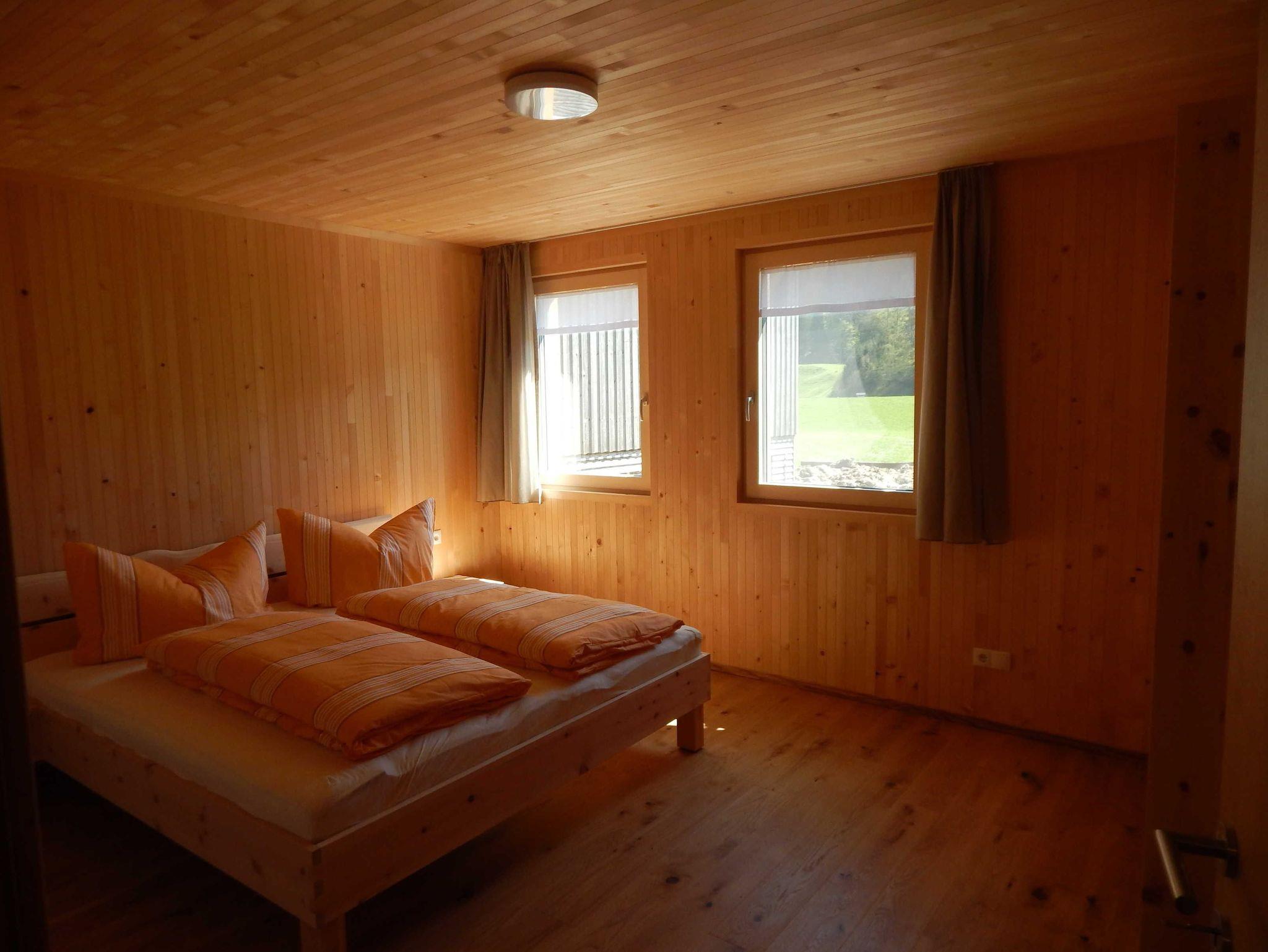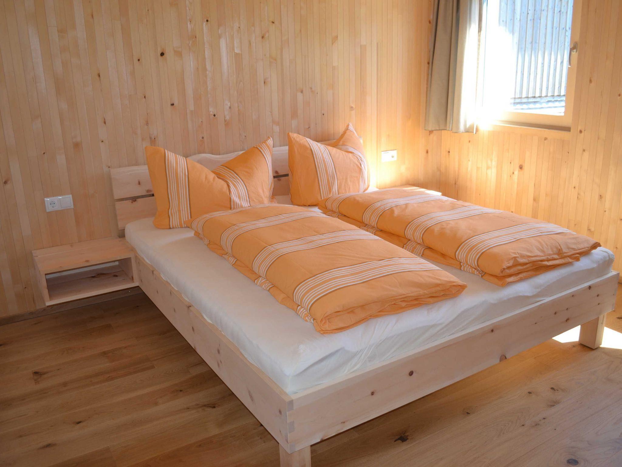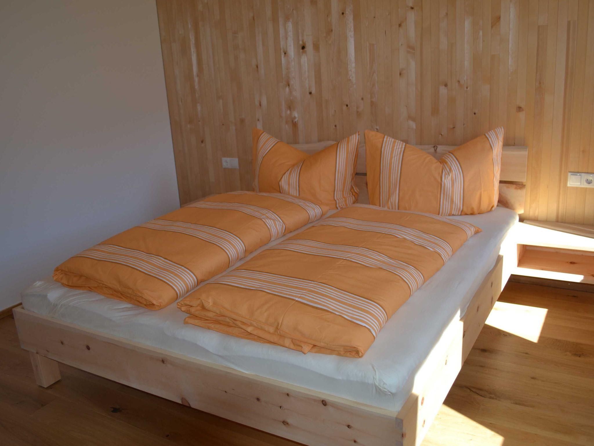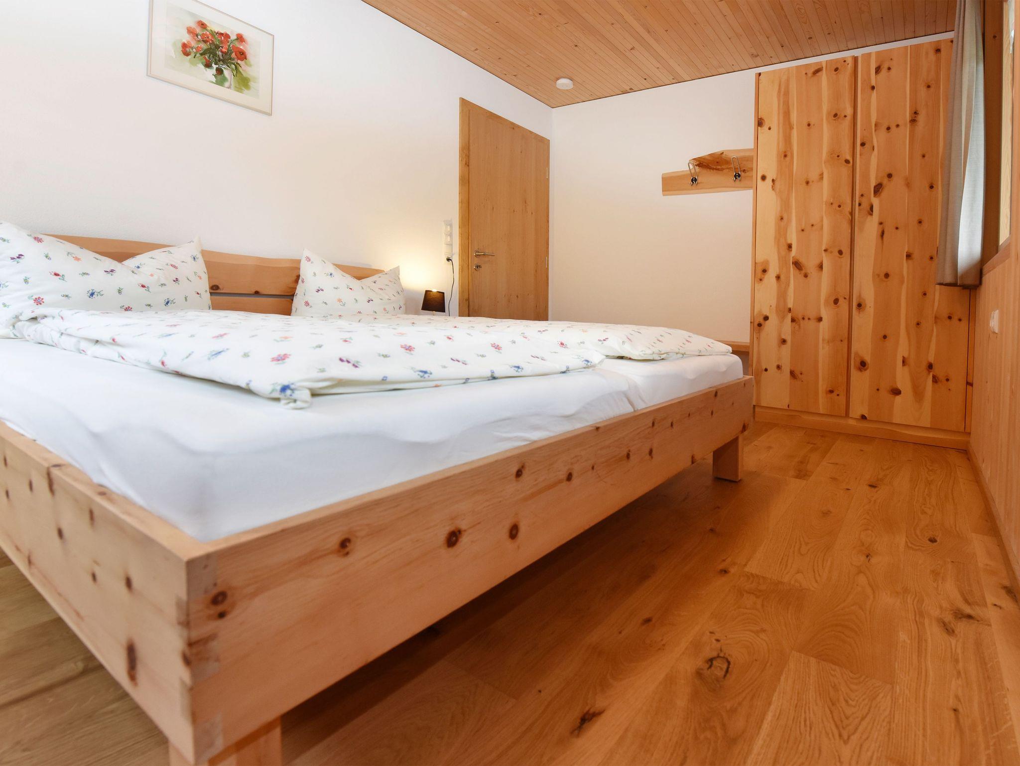 Großzügige Ferienwohnung in Massivholzbauweise: Heimelige Atmophäre Zirbendoppelbett, Balkon direkt vom Wohnraum begehbar. Herrlicher Blick in die Natur.