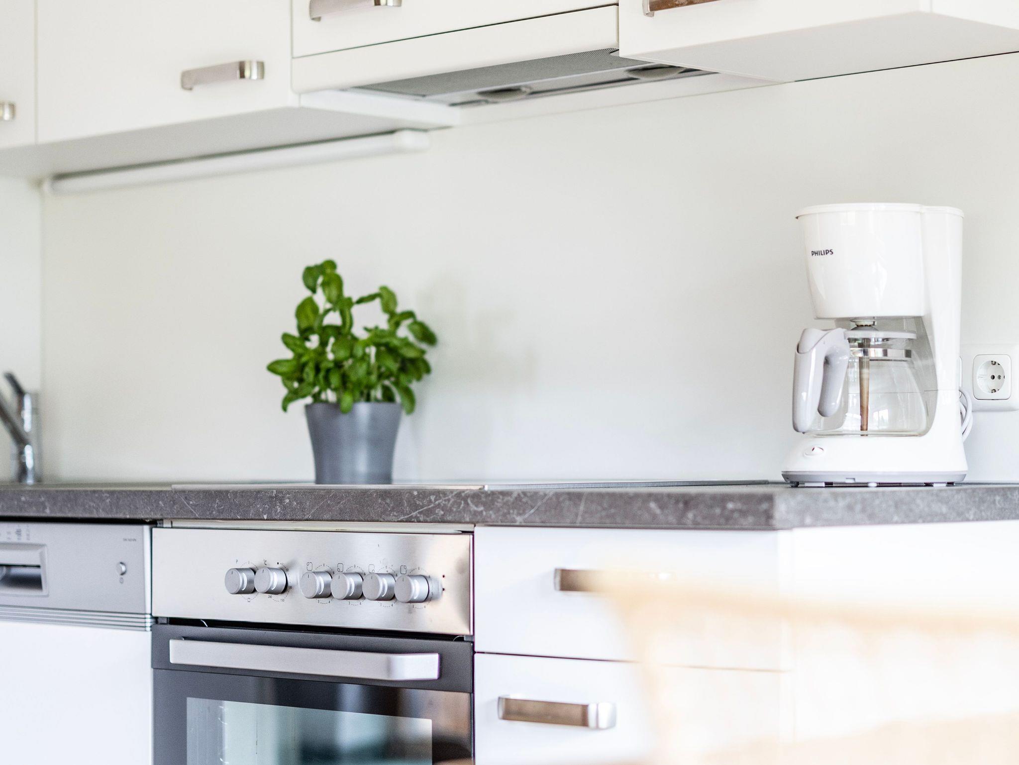 Die modernen Küchen sind voll ausgestattet und verfügen über einen großen Esstisch, Cerankochfeld, Backofen, Mikrowellenherd, Spülmaschine, Flatscreen TV, Couch und Balkon.
