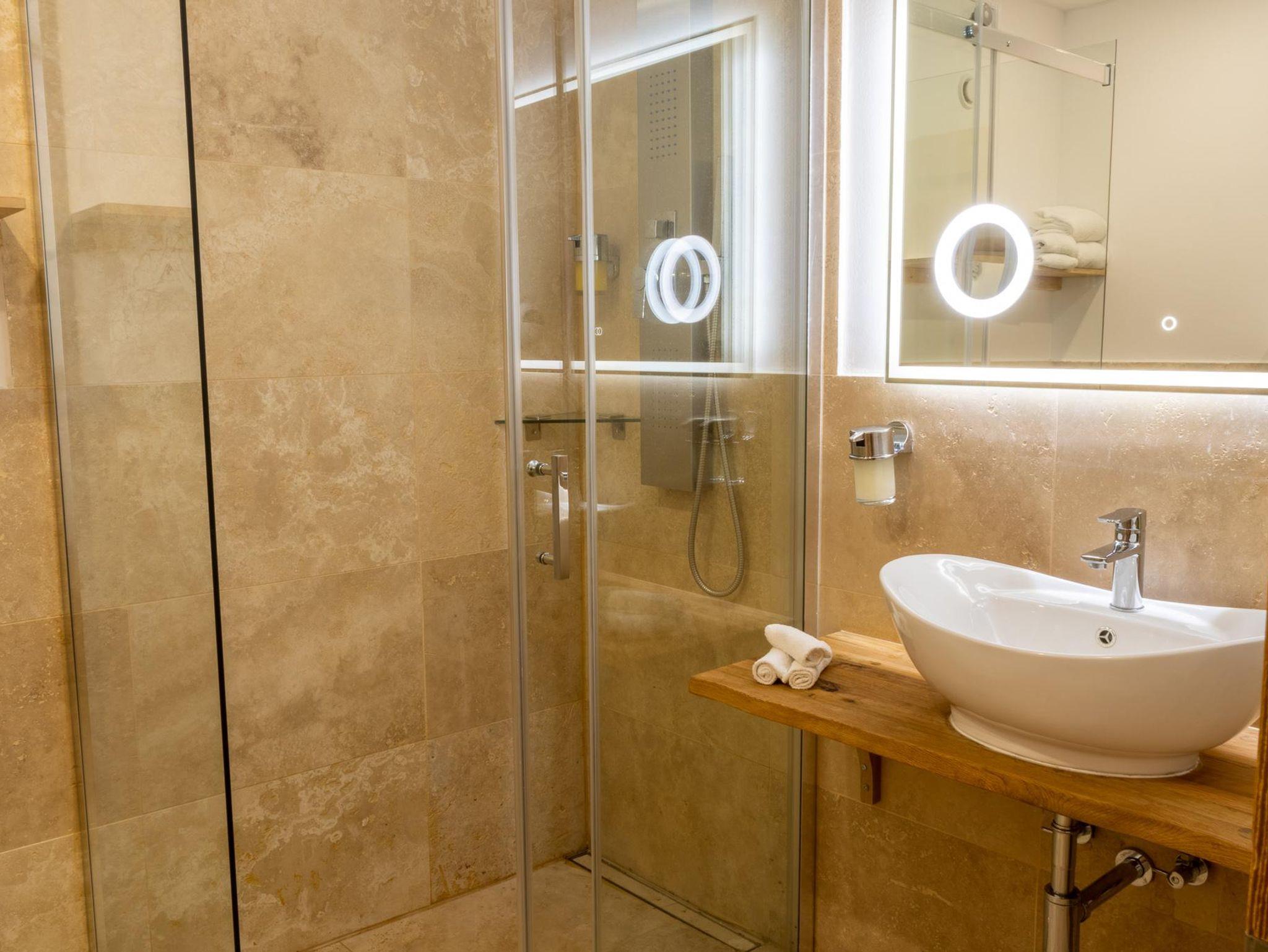 Die Family Suite bietet auf 36 m² Platz für bis zu 3 Personen und vereint Komfort mit einem naturnahen Ambiente – ideal für Familien. Der moderne Wohn- und Schlafbereich verfügt über ein bequemes Doppelbett, einen Essbereich im hellen Erker und einen gemütlichen, abgetrennten Bereich mit Einzelbett. Eine voll ausgestattete Küche sowie ein modernes Bad mit Dusche sorgen für zusätzlichen Wohlfühlfaktor. Der sonnige Südbalkon eröffnet einen traumhaften Blick auf die Berge. Bequem über den Aufzug erreichbar. Das Apartment befindet sich im 3. Stock in ruhiger Lage am Ende des Flurs und ist bequem über einen Aufzug zugänglich.