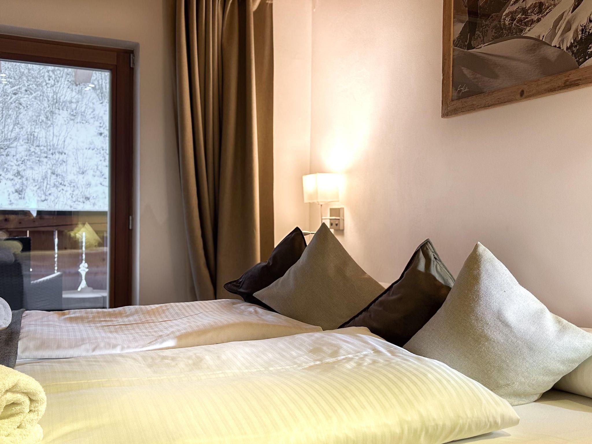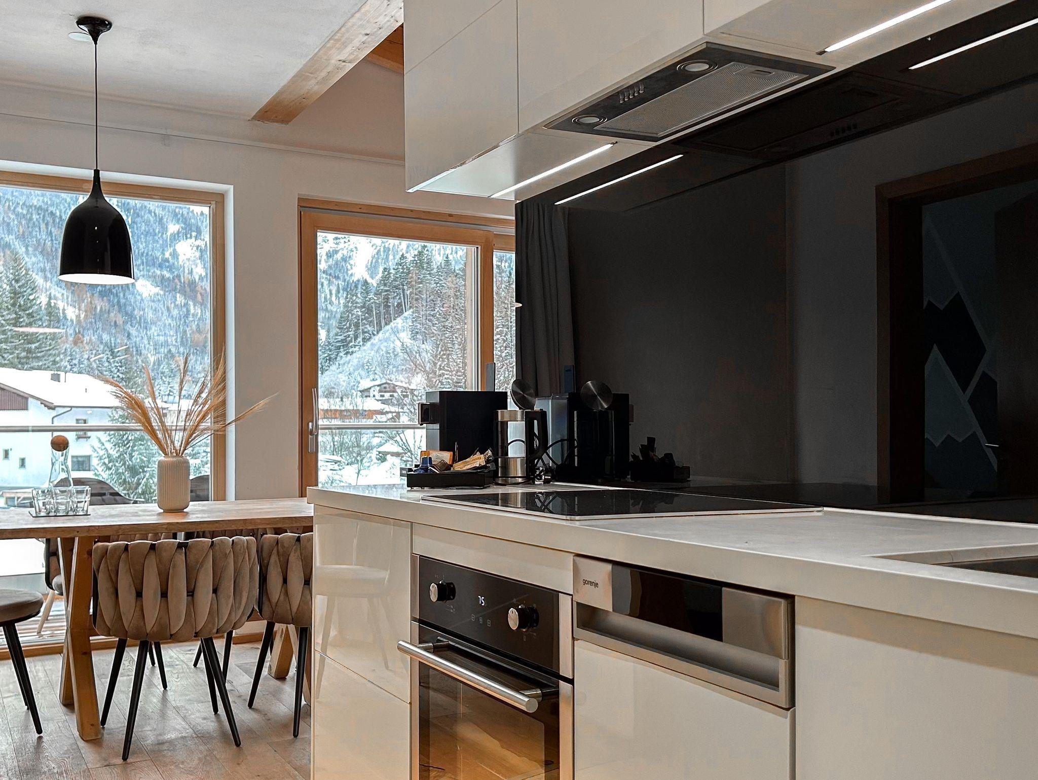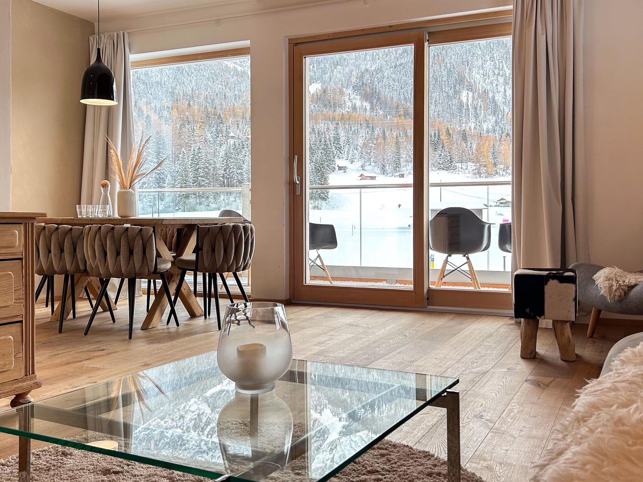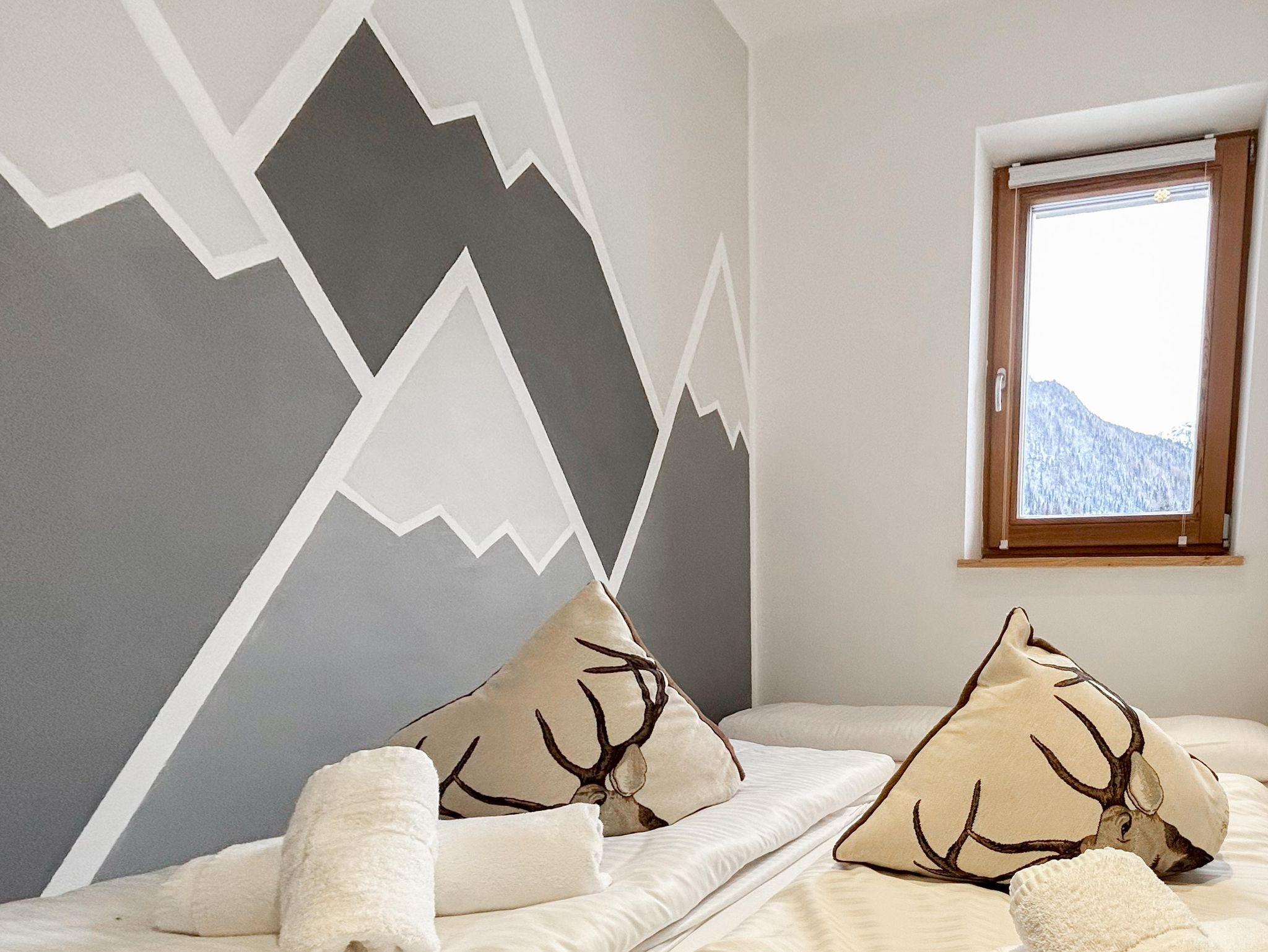 Familienfreundliches Apartment mit großem Schlafzimmer und eigenem Bad sowie zwei kleineren Schlafzimmern. Ein zusätzliches Bad mit WC und Dusche bietet extra Komfort. Der helle Wohn-Essbereich mit voll ausgestatteter Küche, Sofaecke und Esstisch öffnet sich zum Balkon mit herrlichem Bergpanorama. Perfekt für Familien, die Entspannung und alpine Erlebnisse kombinieren möchten.
